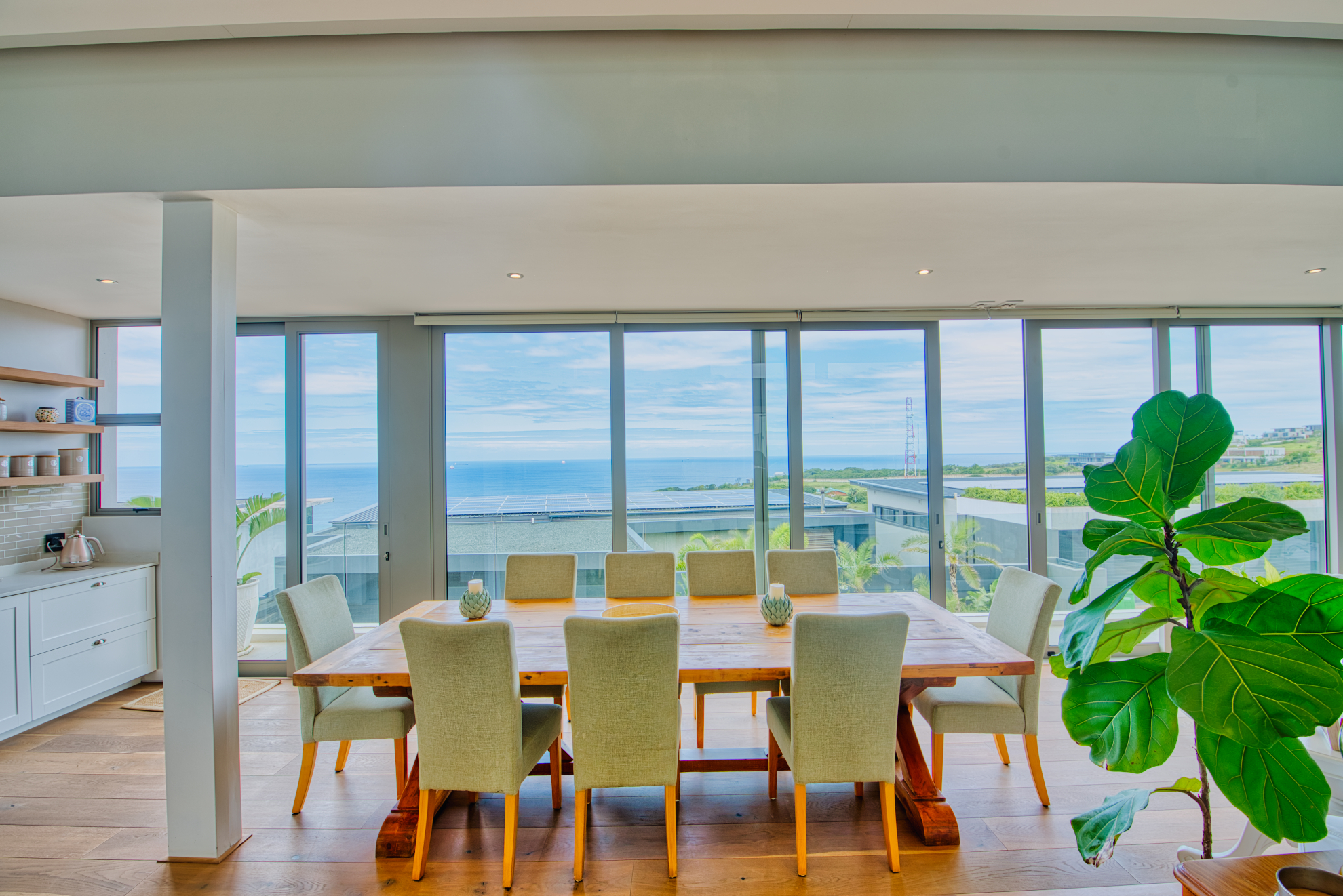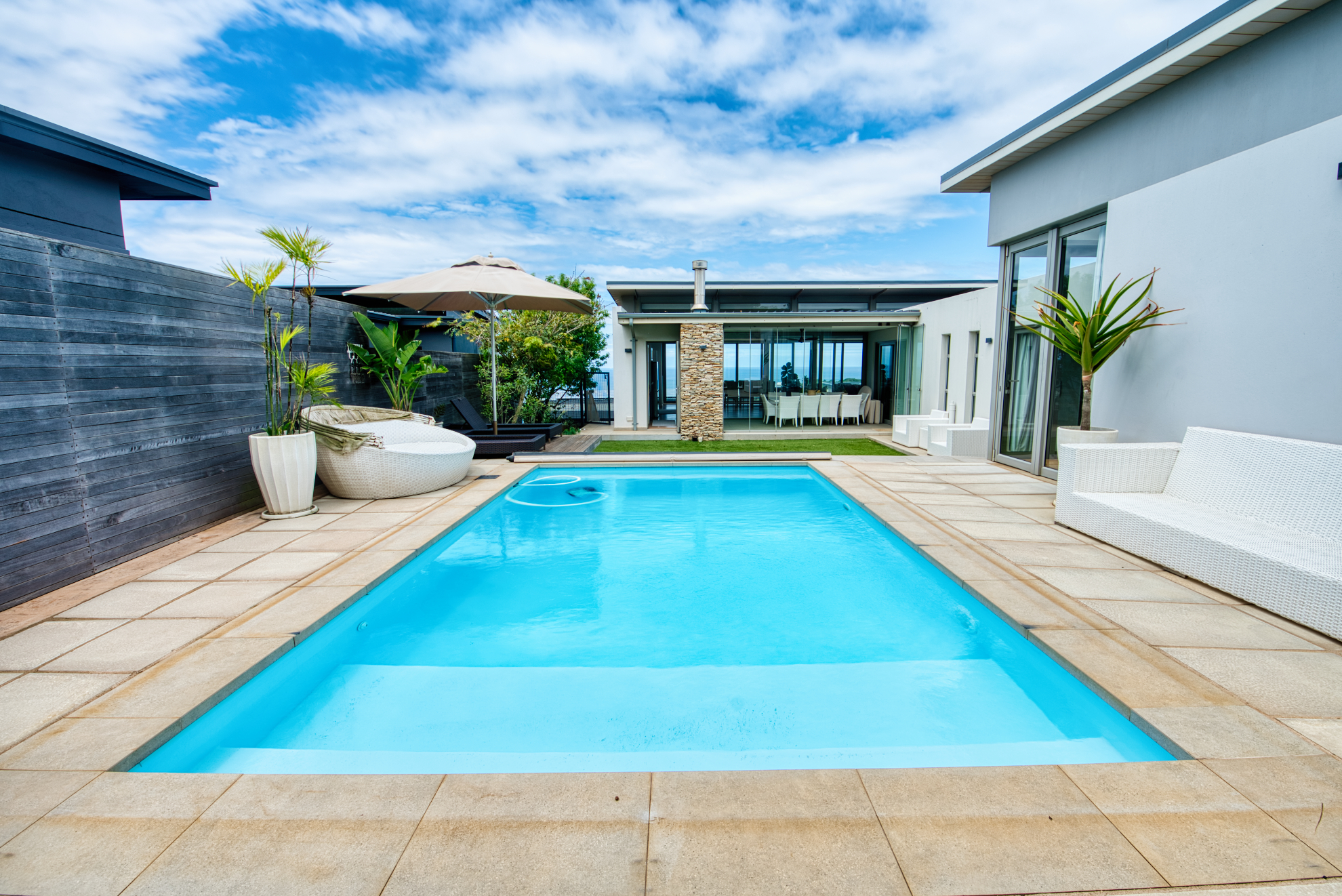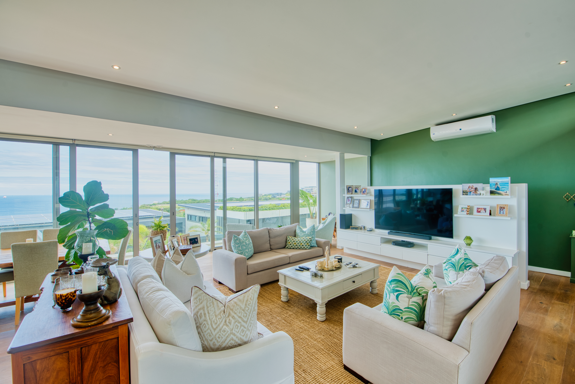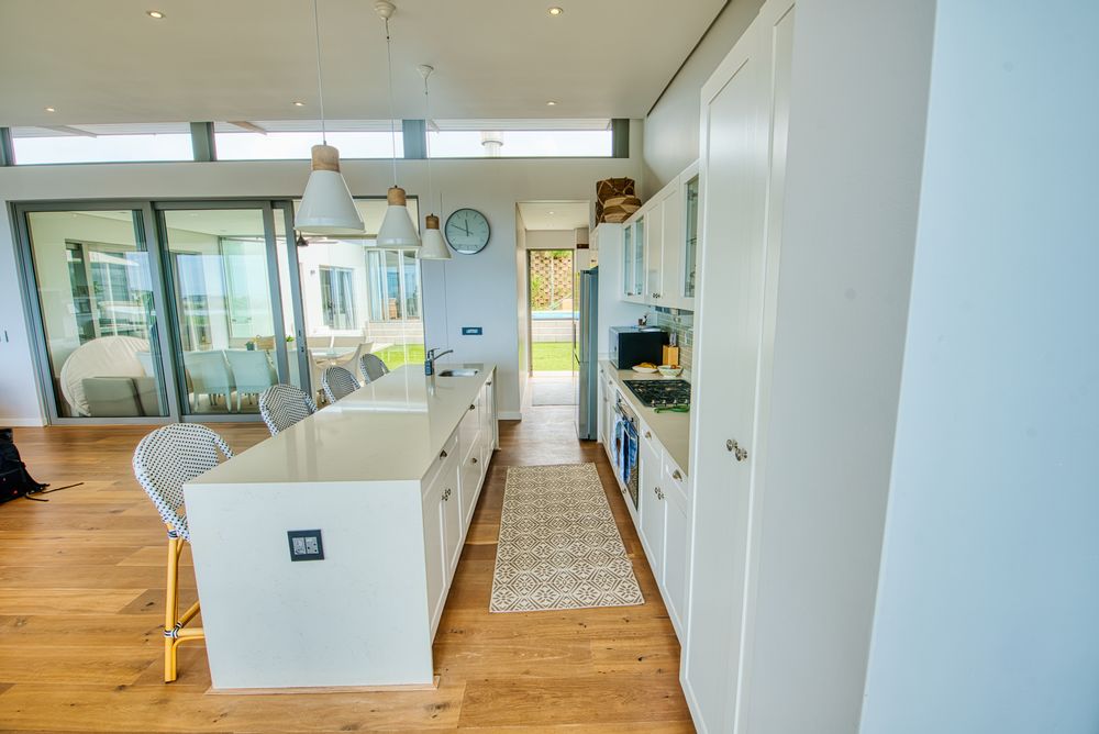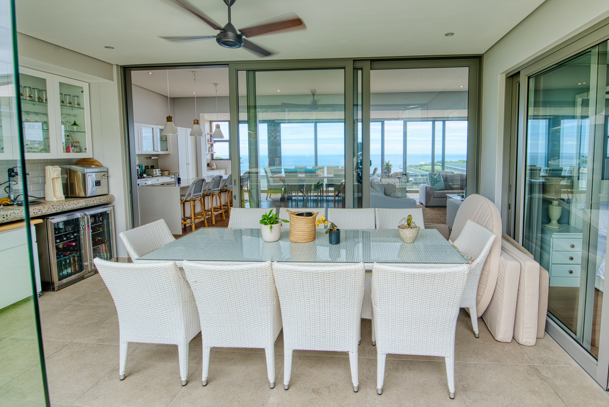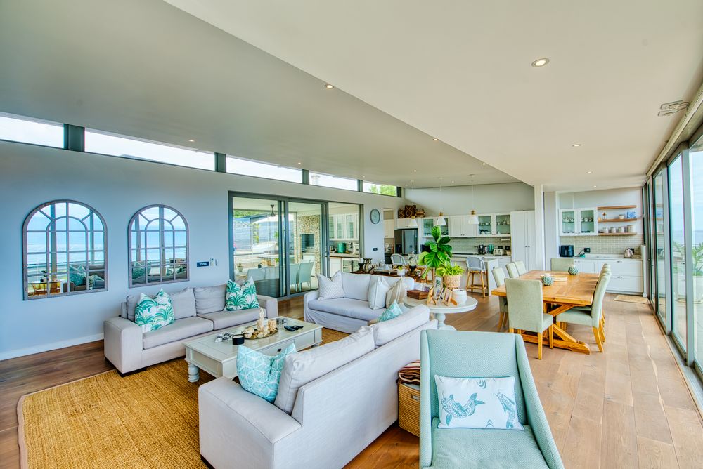 Generous open‐plan living room flows into a dining area and large sliding doors that open to a covered patio and garden, ideal for indoor‐outdoor entertaining and capturing the coastal breeze.