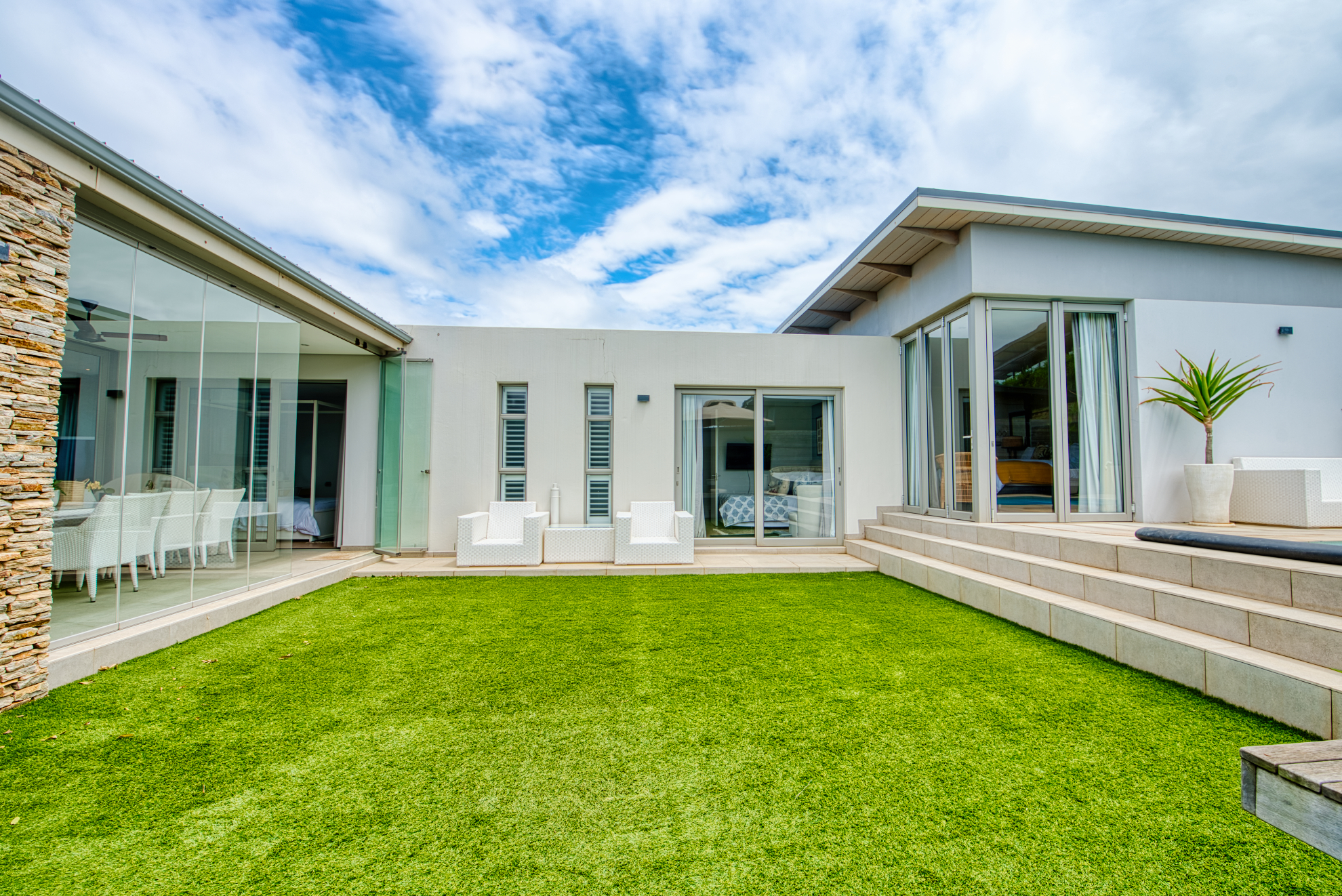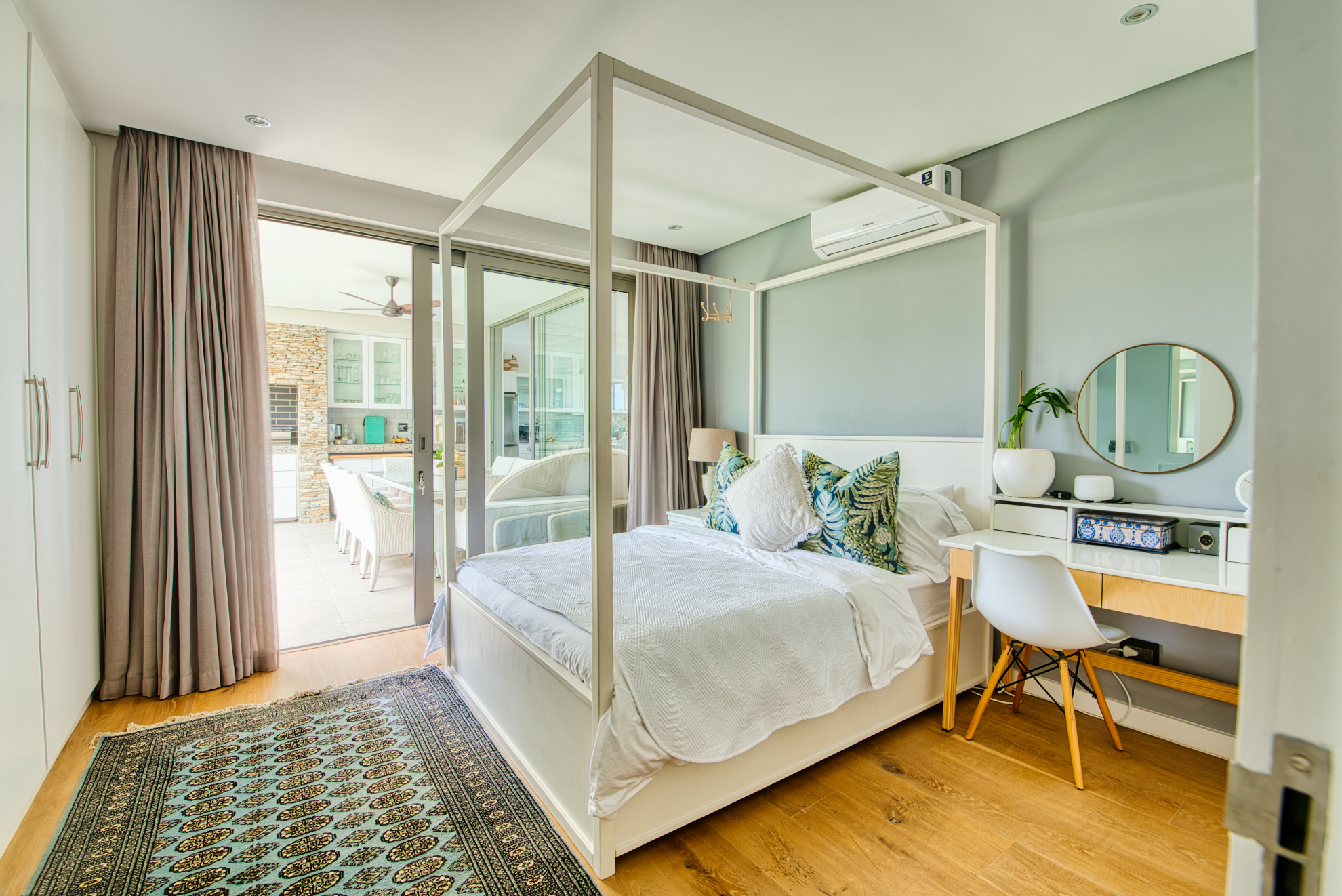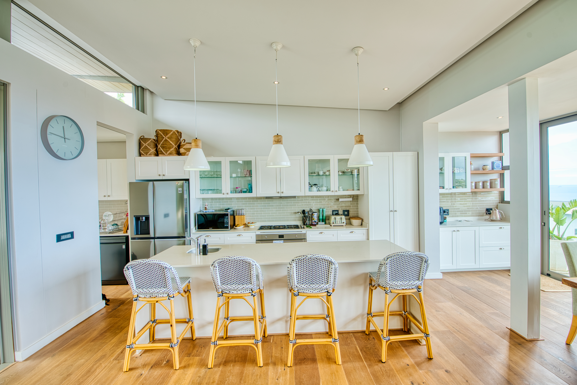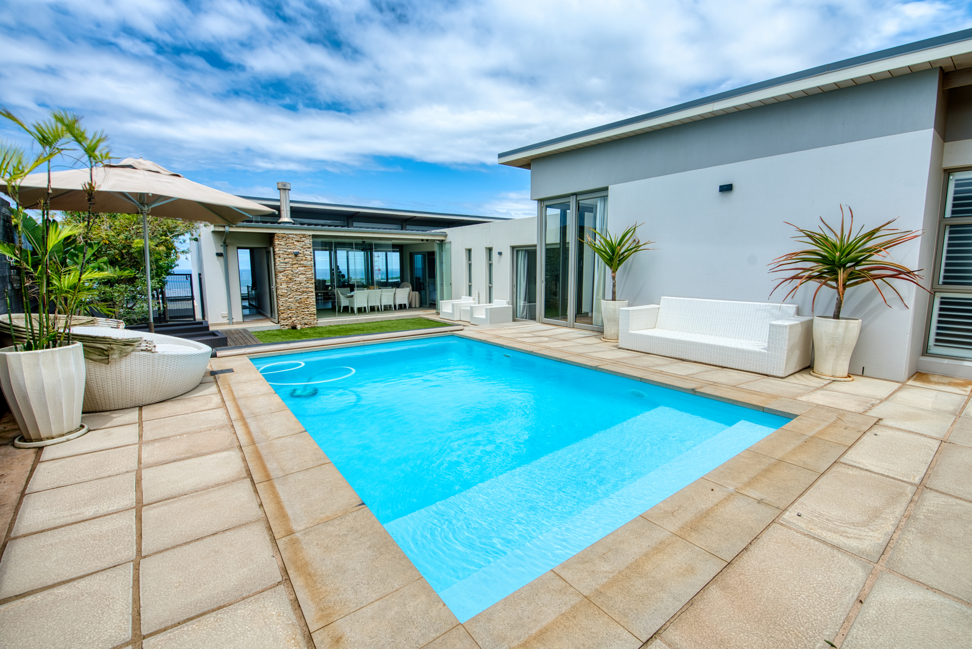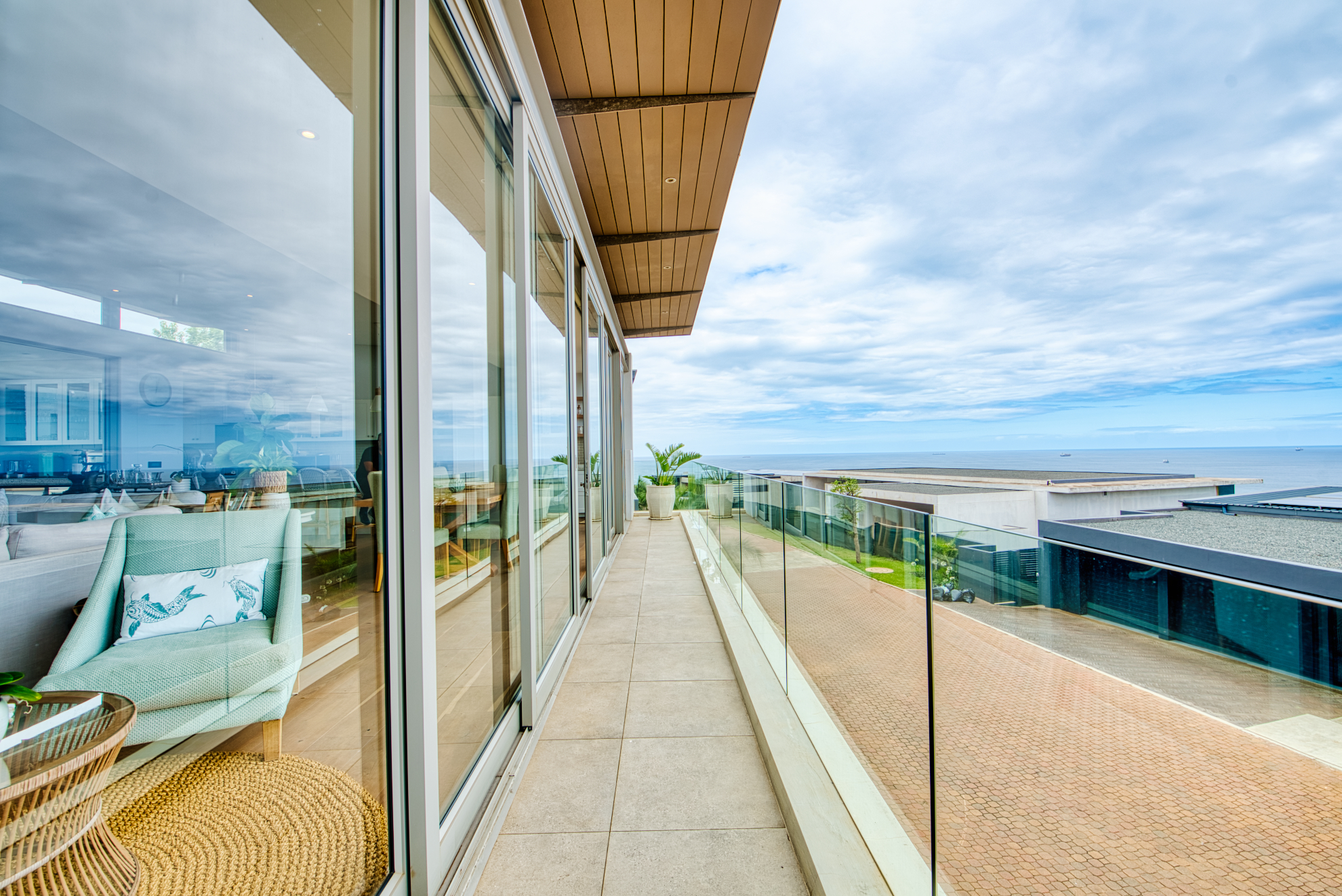 Generous open‐plan living room flows into a dining area and large sliding doors that open to a covered patio and garden, ideal for indoor‐outdoor entertaining and capturing the coastal breeze.