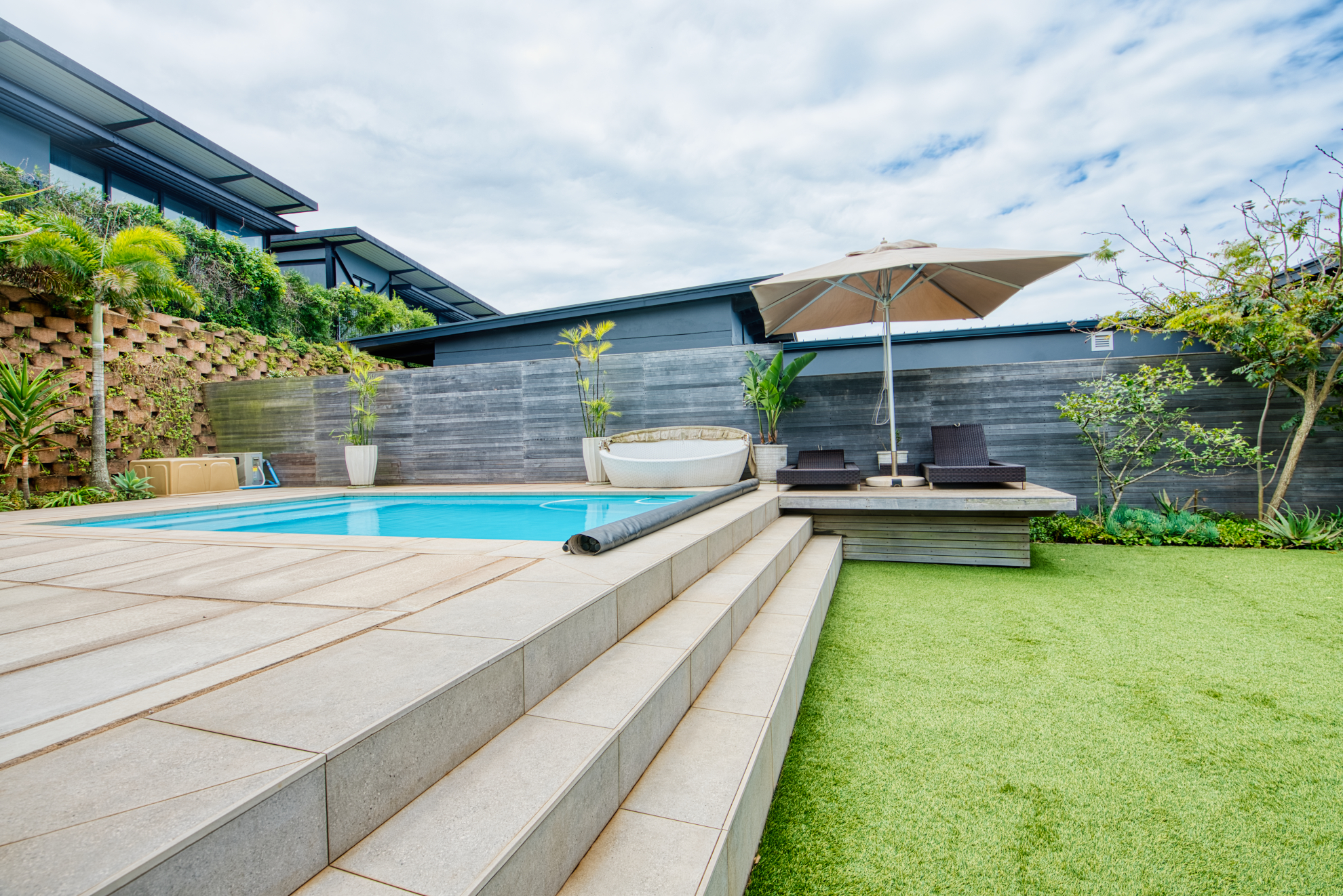 Landscaped garden and entertaining patio provide a private outdoor retreat—perfect for children, pets, or relaxed seaside living.