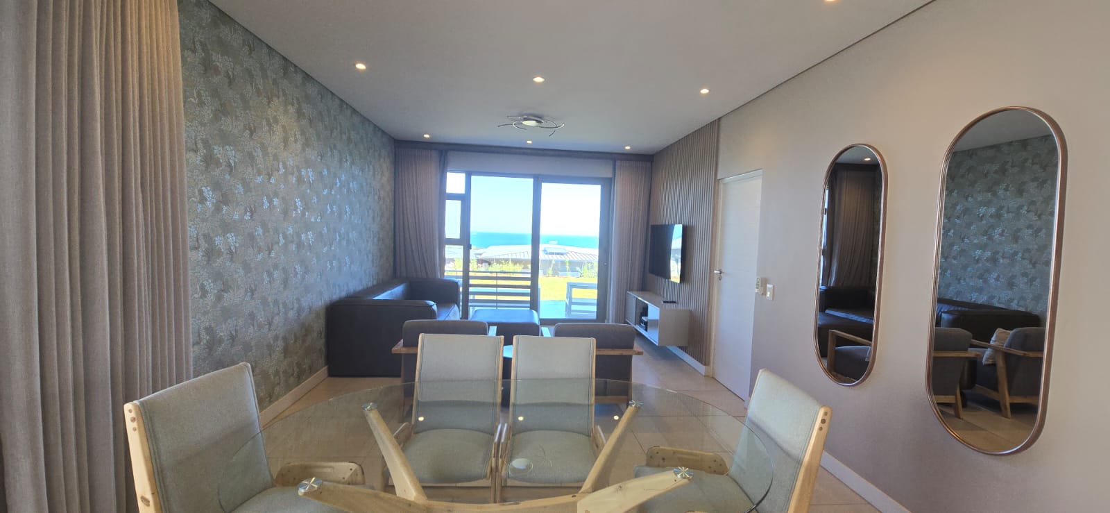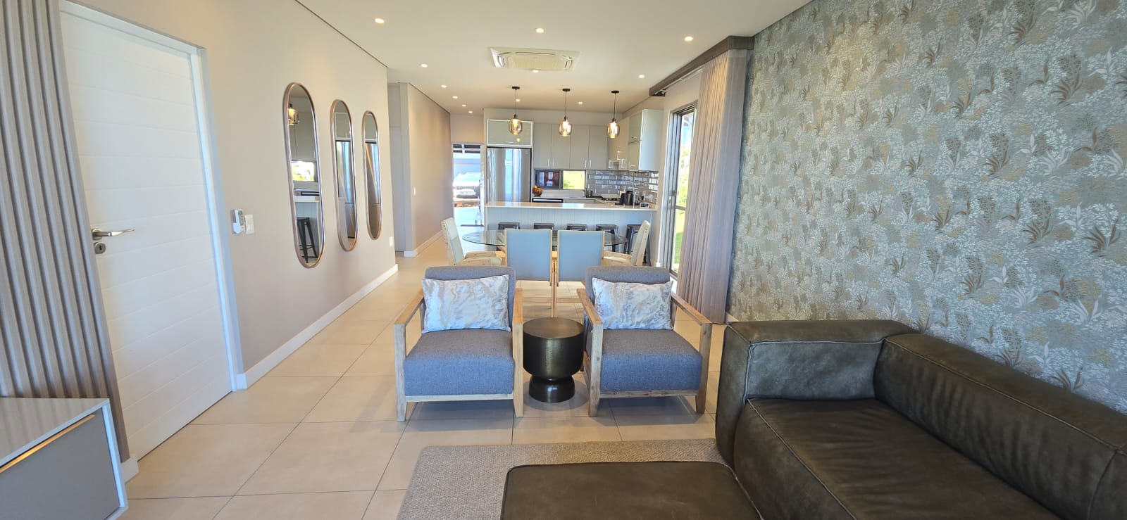A large, bright living room furnished with comfortable seating .Adjacent dining area with table and chairs for six.
