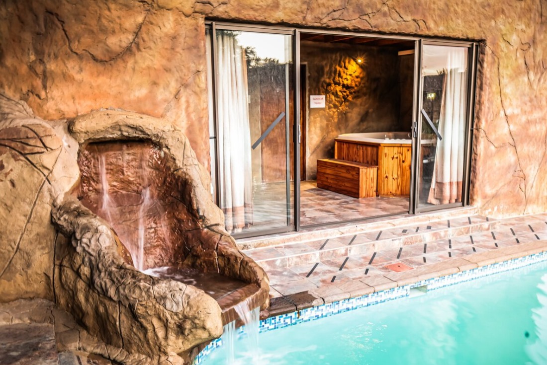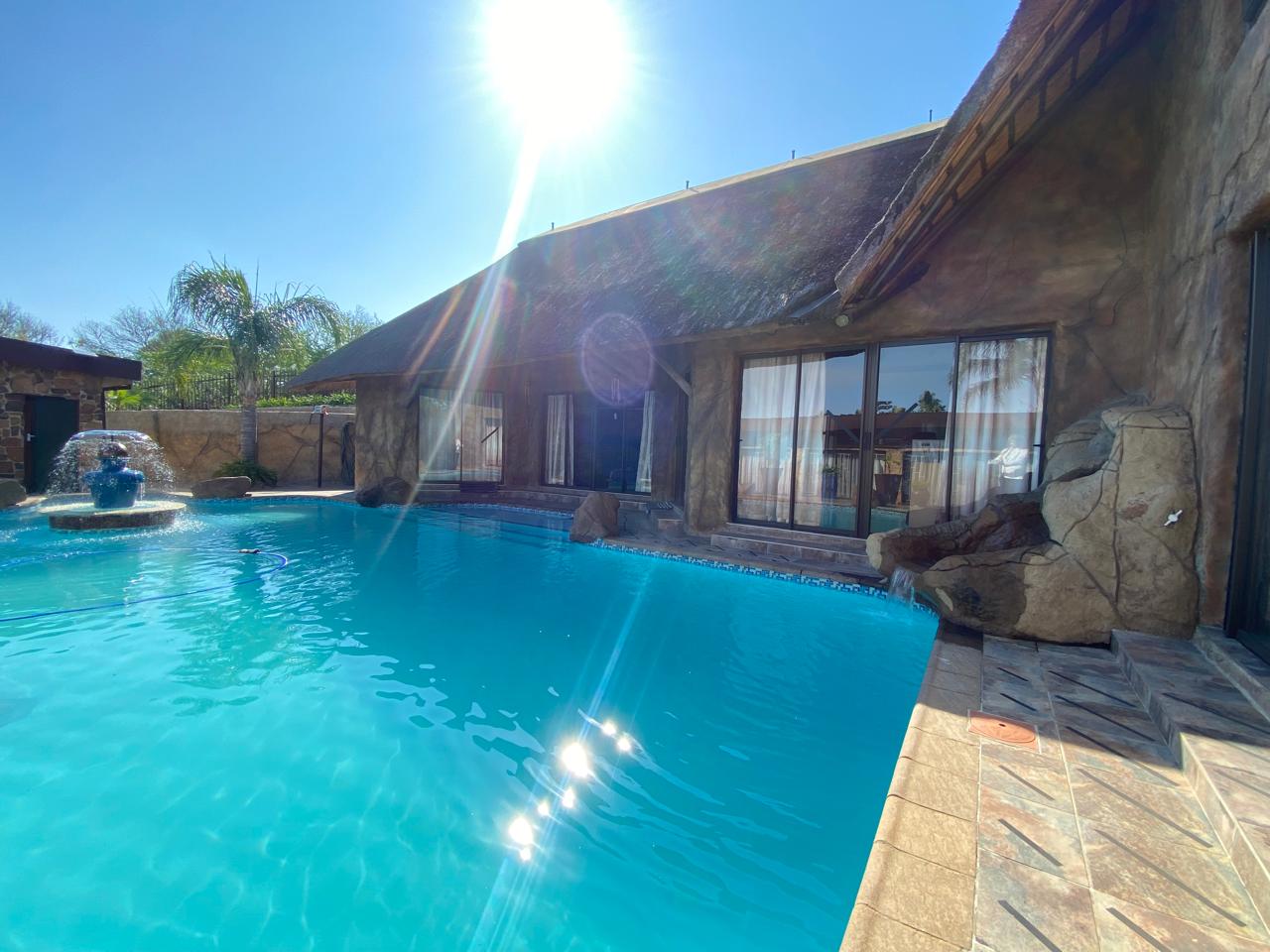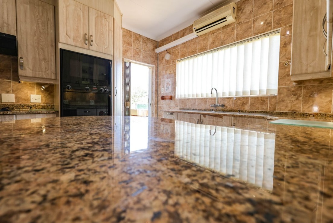 Open Plan Design: Modern kitchen with elegant granite countertops flows into a spacious seating area and indoor gas braai area—ideal for entertaining, with direct access to the pool through glass doors onto the steps into the the water.