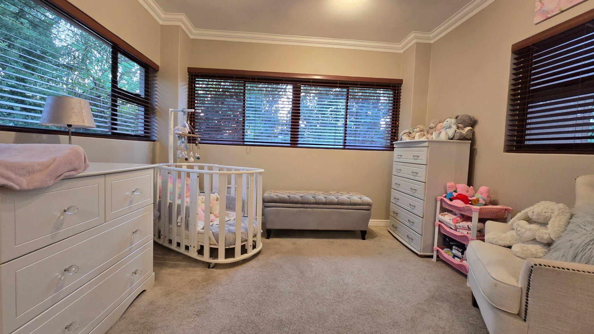 Upstairs, a safety gate provides peace of mind. Two generously sized bedrooms are fitted with modern aluminum window frames and ample closet space, serviced by a full bathroom. The primary bedroom features an extended area that can serve as a nursery or home gym, along with an en suite bathroom with double basins.