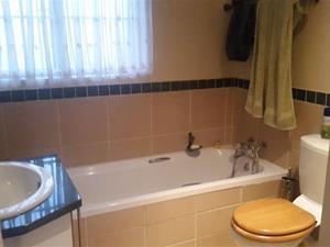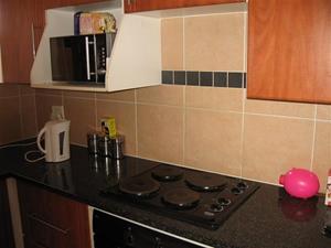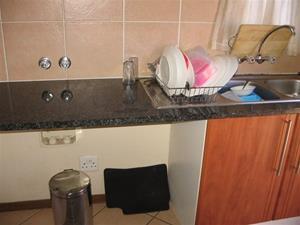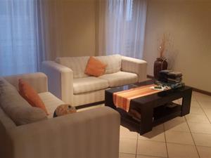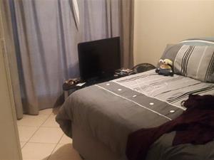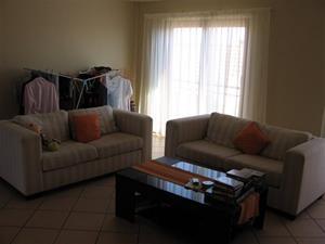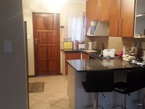 Lovely 2 bedroom top unit with 1 full bathroom, open plan living area and kitchen, balcony and 1 lock up garage. In security estate.