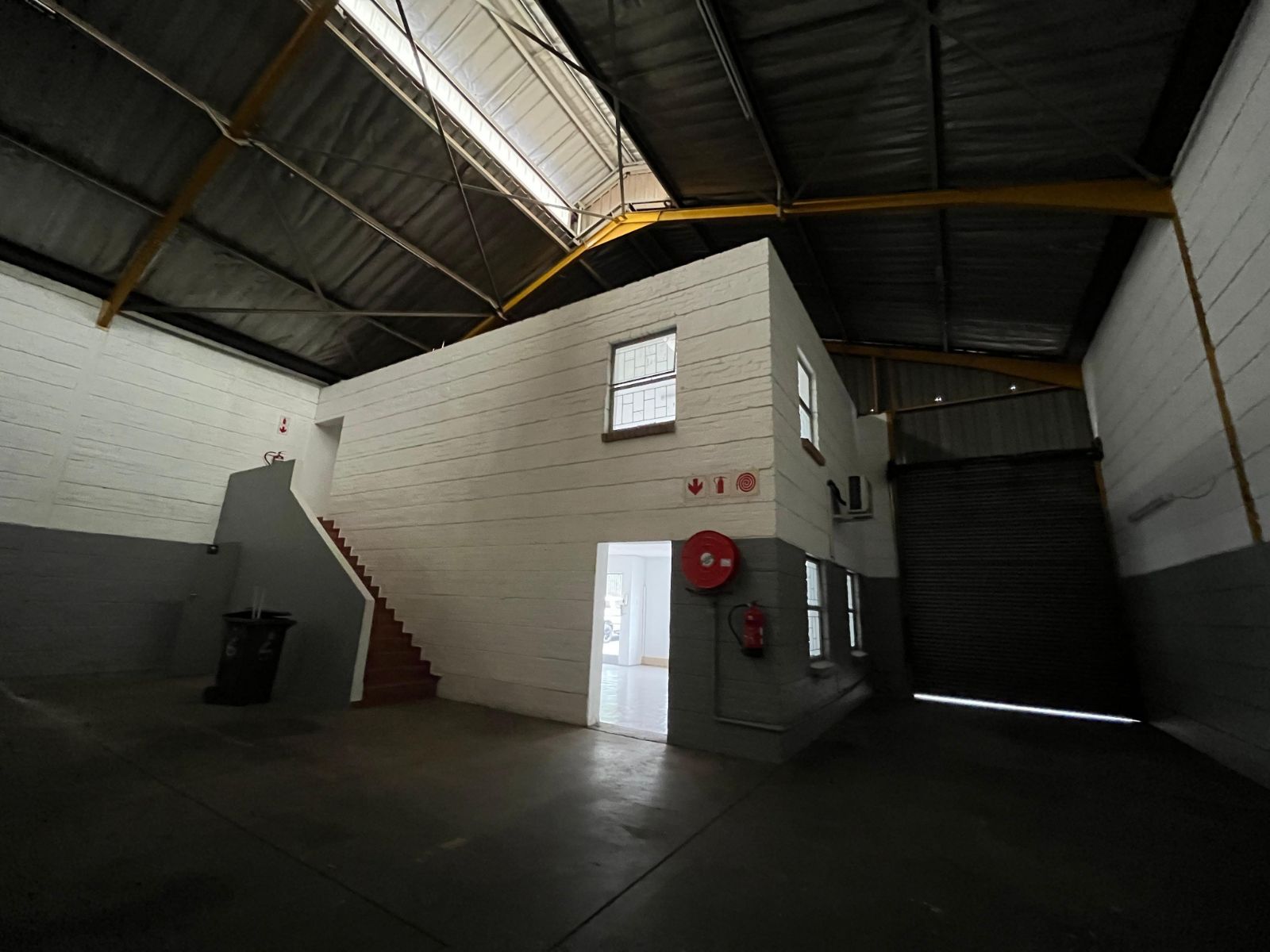 The warehouse component offers a spacious working area with concrete flooring, a high roof suitable for racking or distribution, a storeroom, kitchenette, and neat staff ablutions with showers. It is equipped with 60 Amps 3-phase power, a roller shutter door, and good natural ventilation.