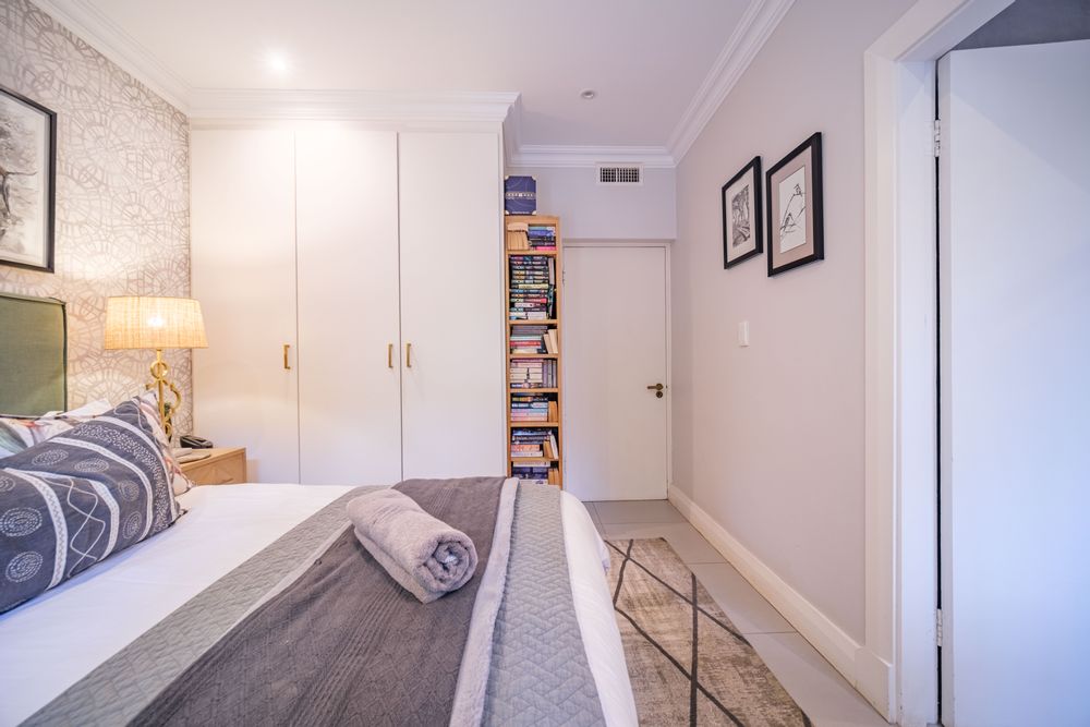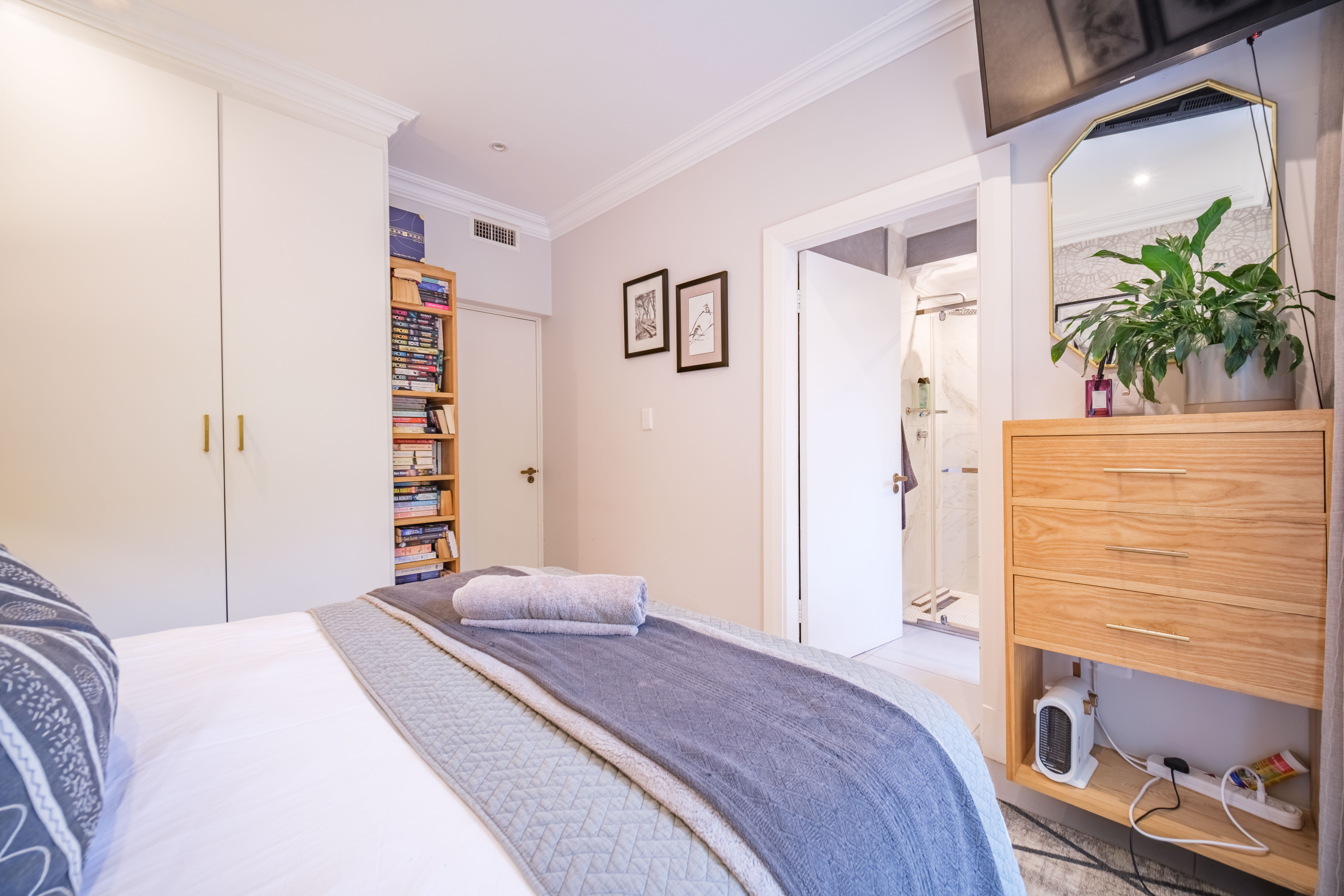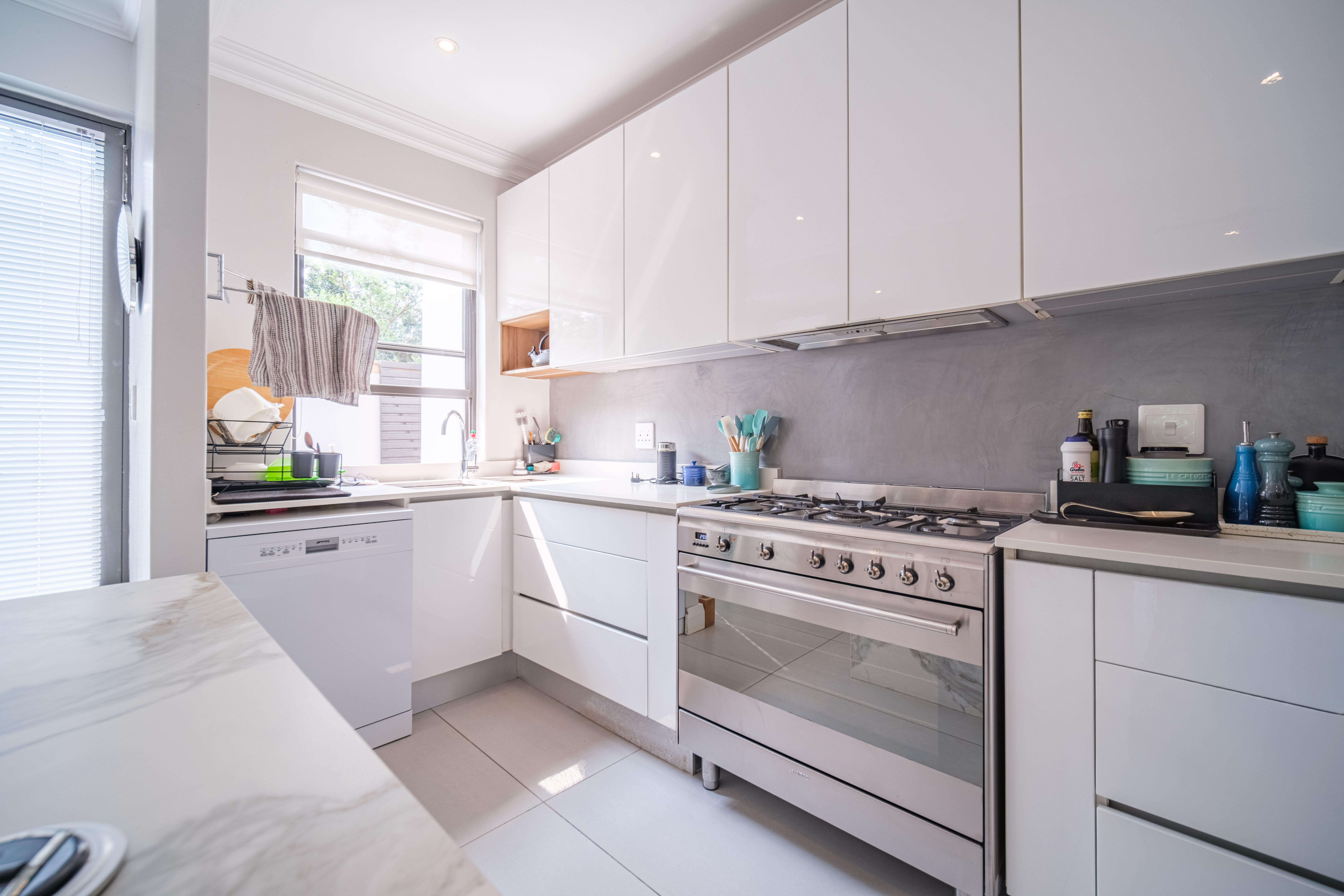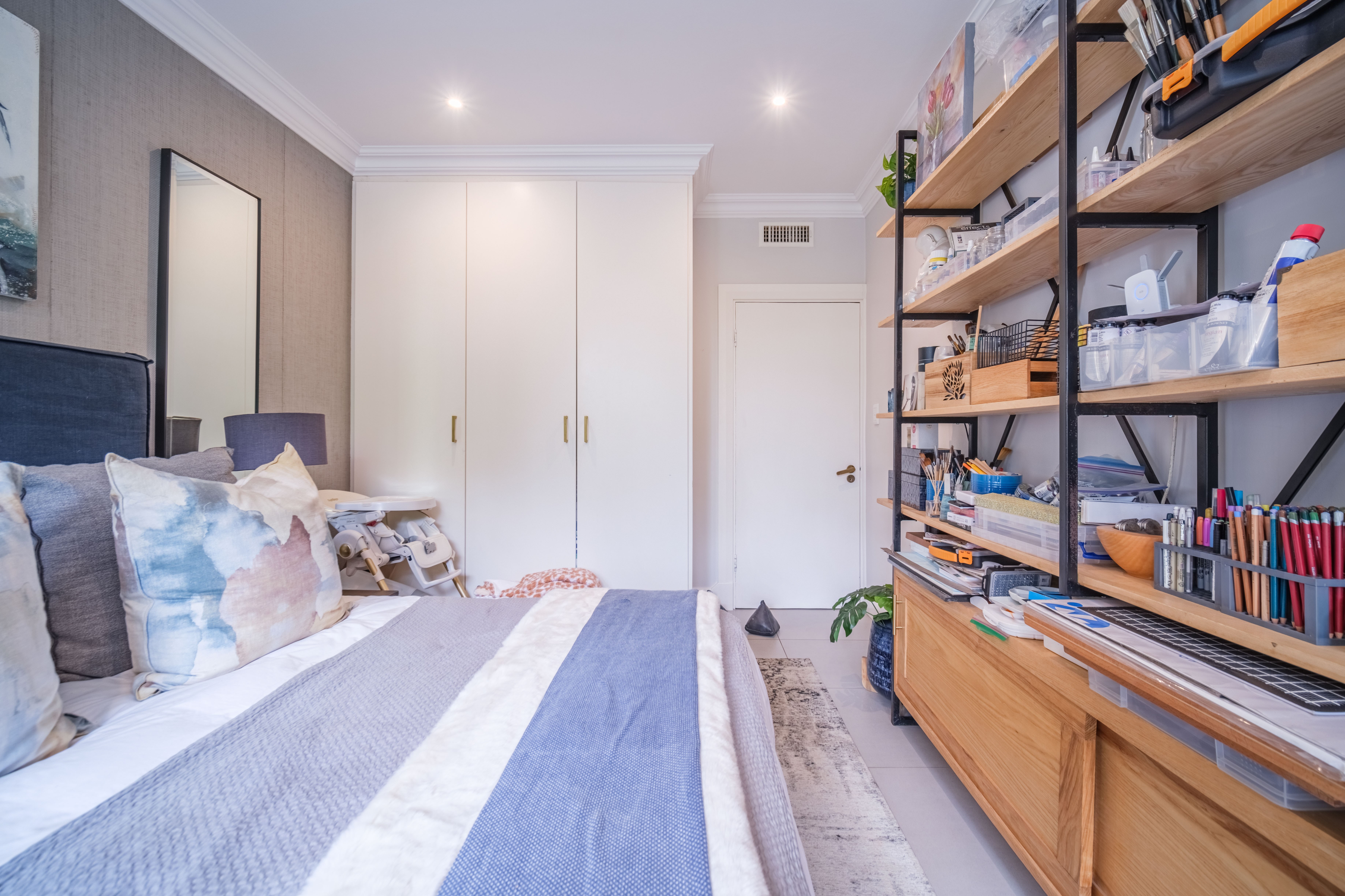 The apartment welcomes you with an elegant open plan living and dining area that flows effortlessly onto a covered patio, ideal for relaxed entertaining or quiet evenings surrounded by lush greenery. The gourmet kitchen is a true highlight, featuring a sleek centre island, quartz countertops, hidden coffee station, and a five-burner SMEG gas stove – a chef’s dream complemented by practical yard access.