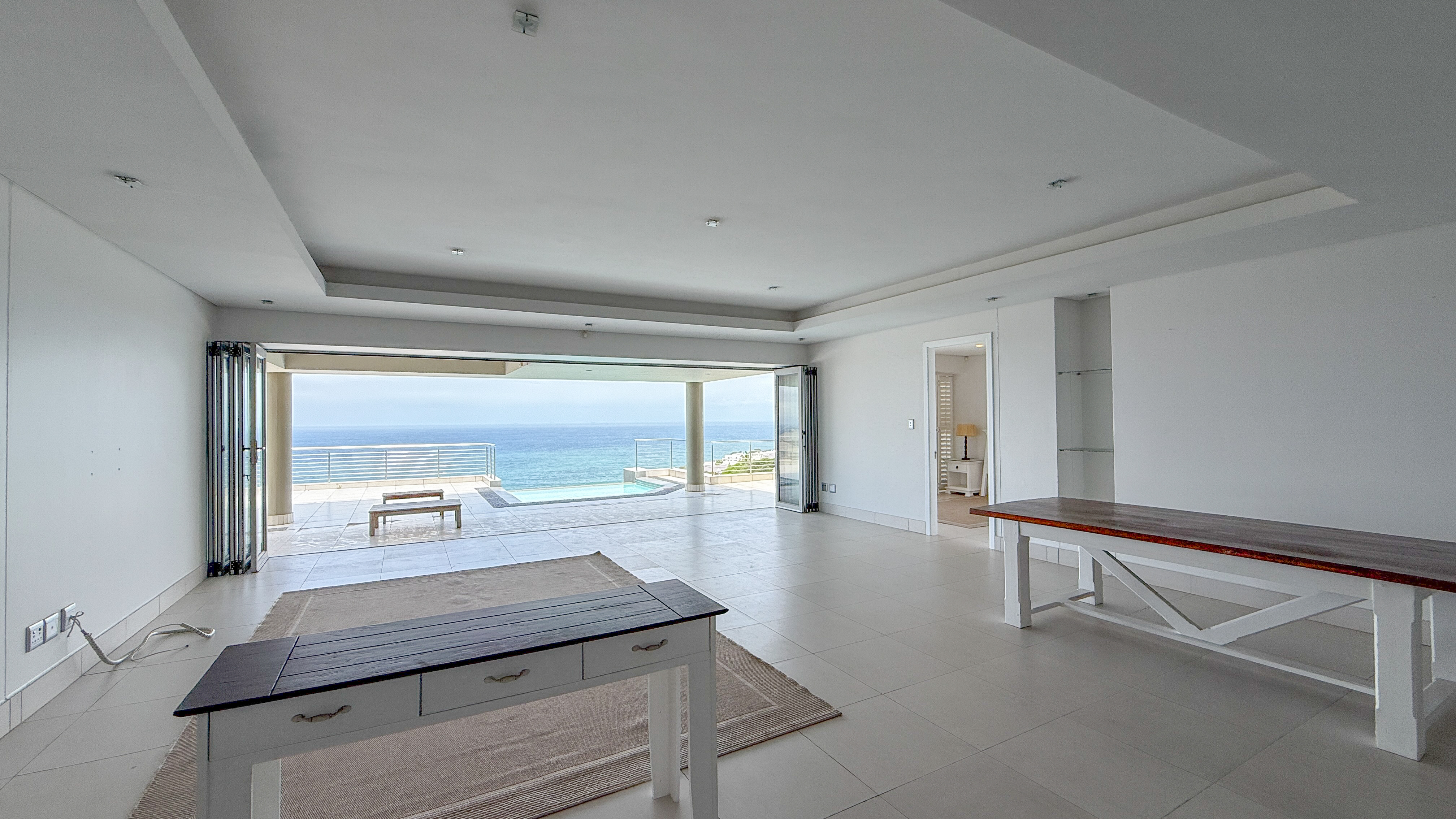 Large glass doors open fully onto a generous patio, creating a seamless indoor–outdoor living experience. Here, you can relax by your private swimming pool while enjoying the tranquil backdrop of the ocean—an everyday luxury that elevates coastal living to new heights.