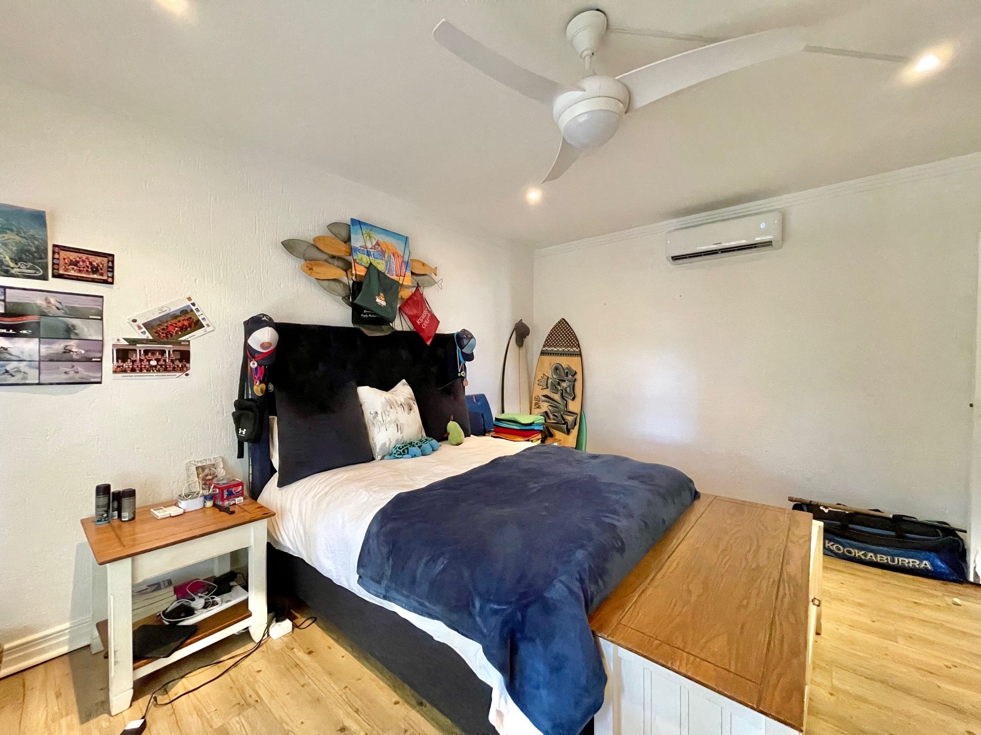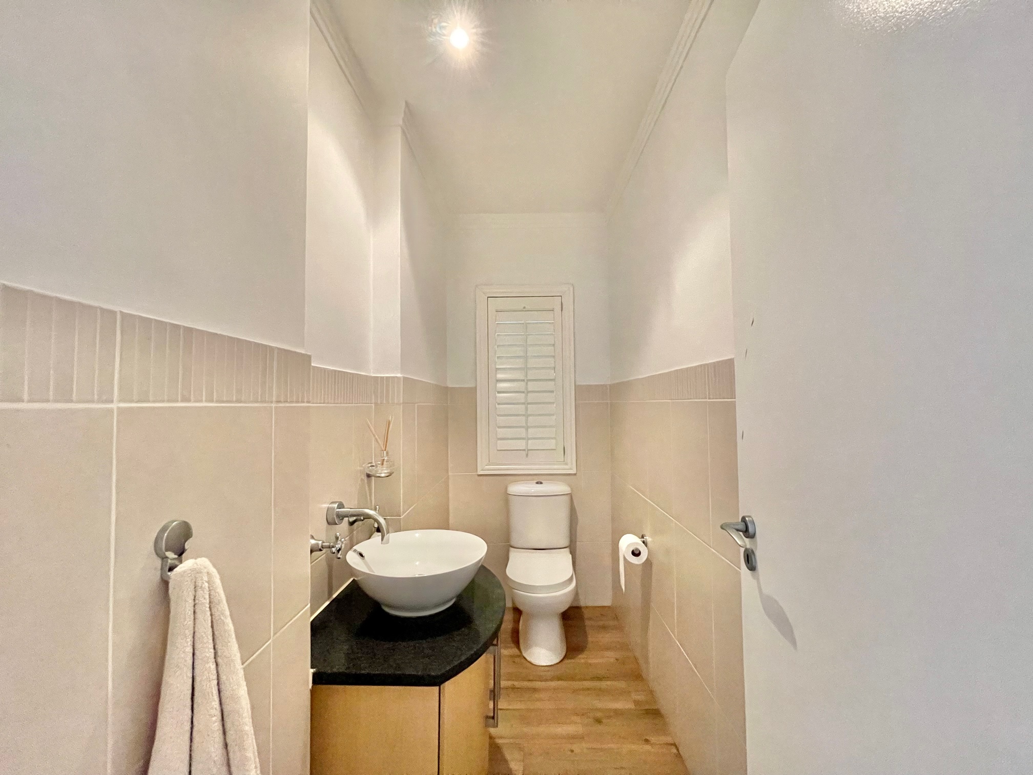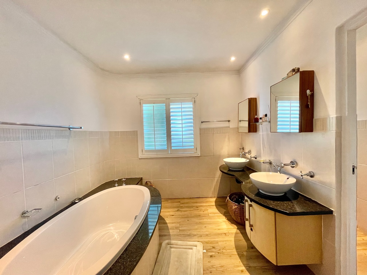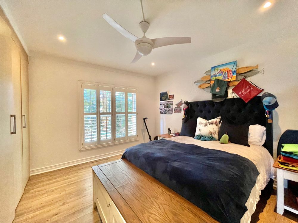 The main bedroom is a private sanctuary complete with a full en-suite bathroom with double vanities. The two generously sized guest bedrooms share a full family bath. Each bedroom is thoughtfully designed with air conditioning and timeless American shutters for year-round comfort.
