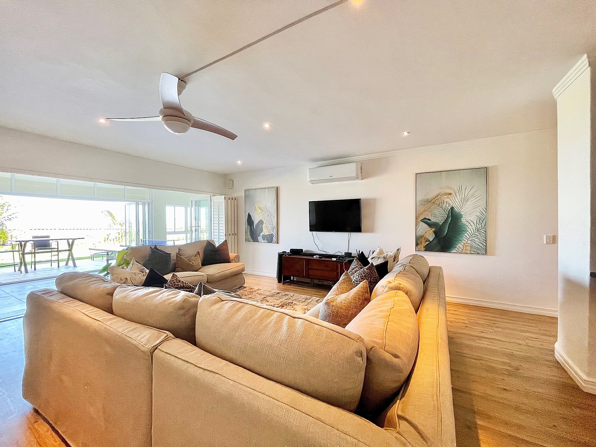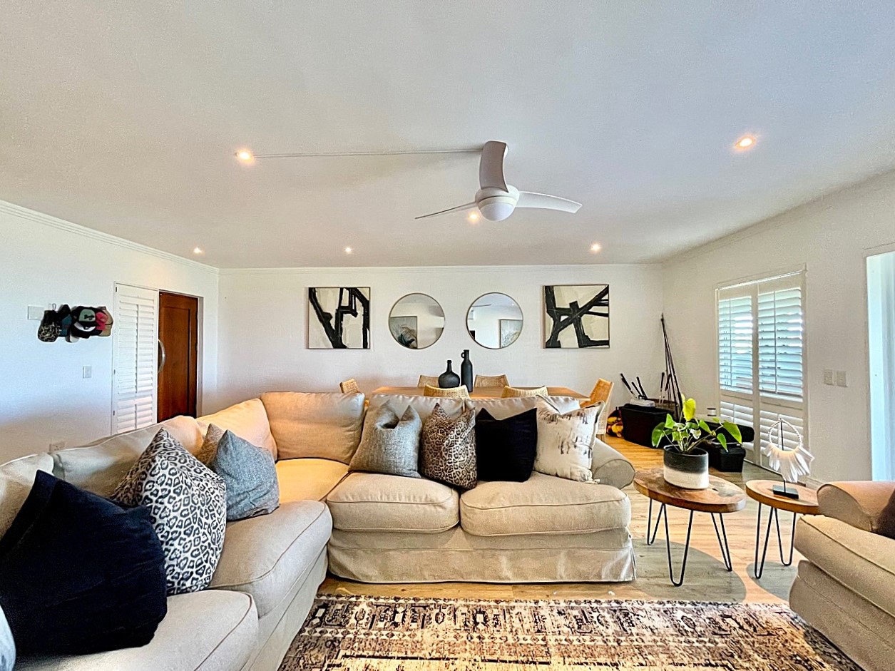 The expansive living spaces include a kitchen, lounge and dinning area with stacking doors open onto a spacious decked patio, creating a natural flow to a level grassed garden and tranquil ocean backdrop.