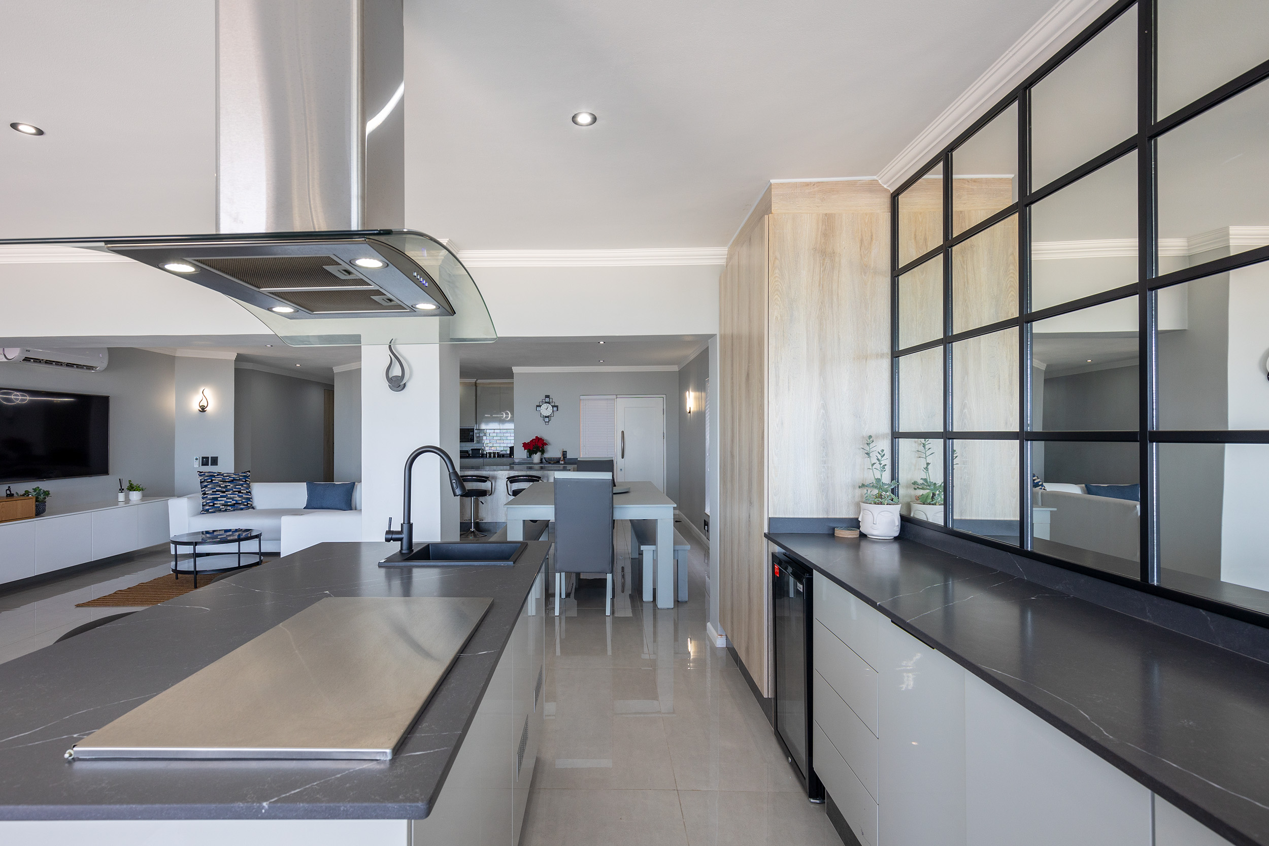The expansive open-plan living areas flow seamlessly onto an entertainer’s haven, complete with a designer built-in bar, integrated braai, and a private jacuzzi, creating the perfect balance of elegance and leisure. Sleek architectural lines, premium finishes, and tasteful furnishings define the home’s contemporary aesthetic.