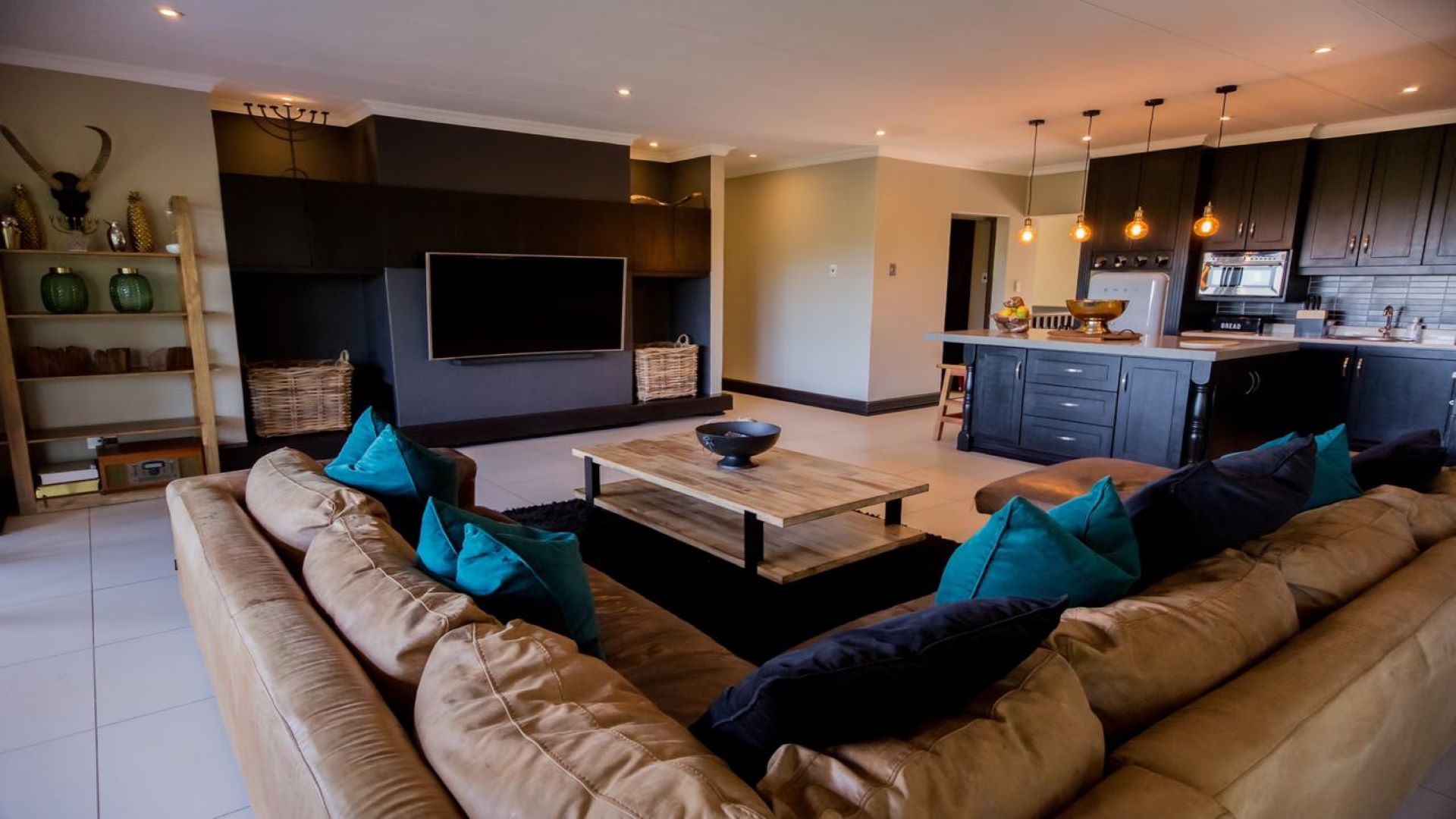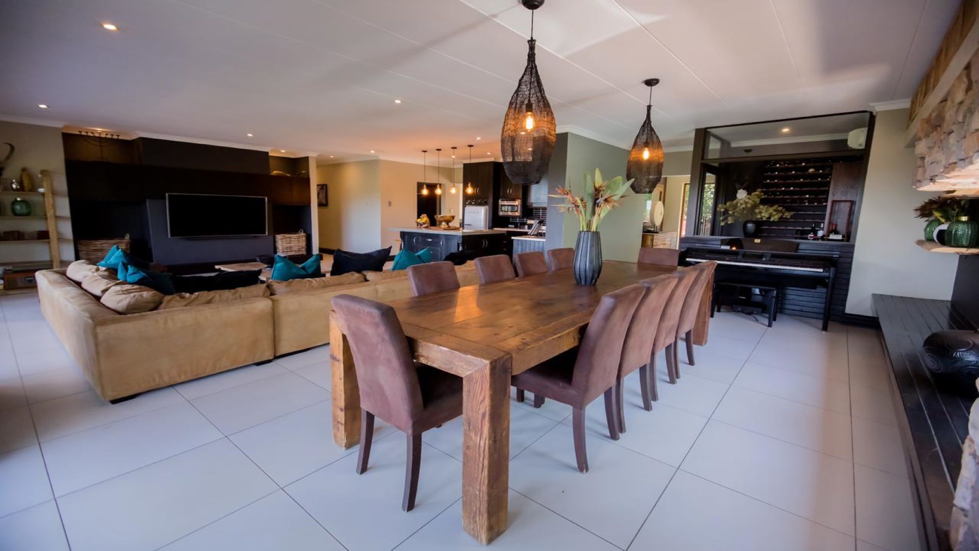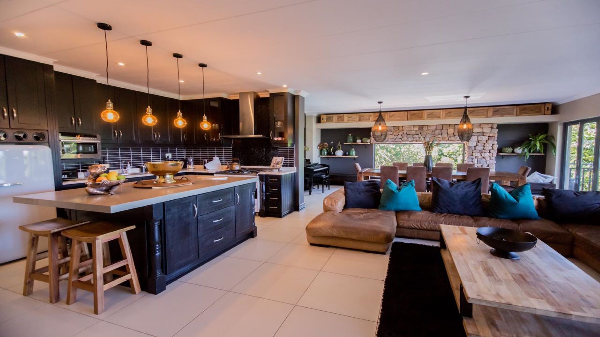 The home is thoughtfully designed over multiple levels, blending elegant interiors with expansive outdoor living. The upper floor welcomes you into a flowing open-plan layout that integrates the lounge, dining room, and gourmet kitchen with a separate scullery. This entire level opens onto a generous pool deck featuring a built-in braai and firepit area, creating a seamless indoor-outdoor lifestyle with views of the surrounding greenery.