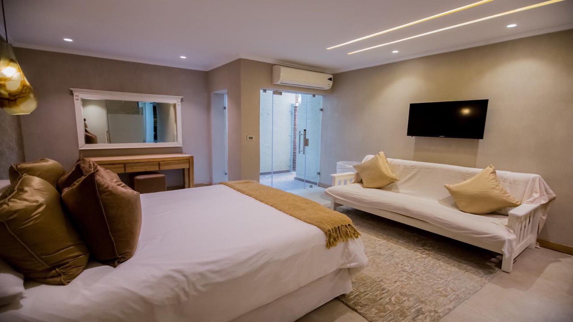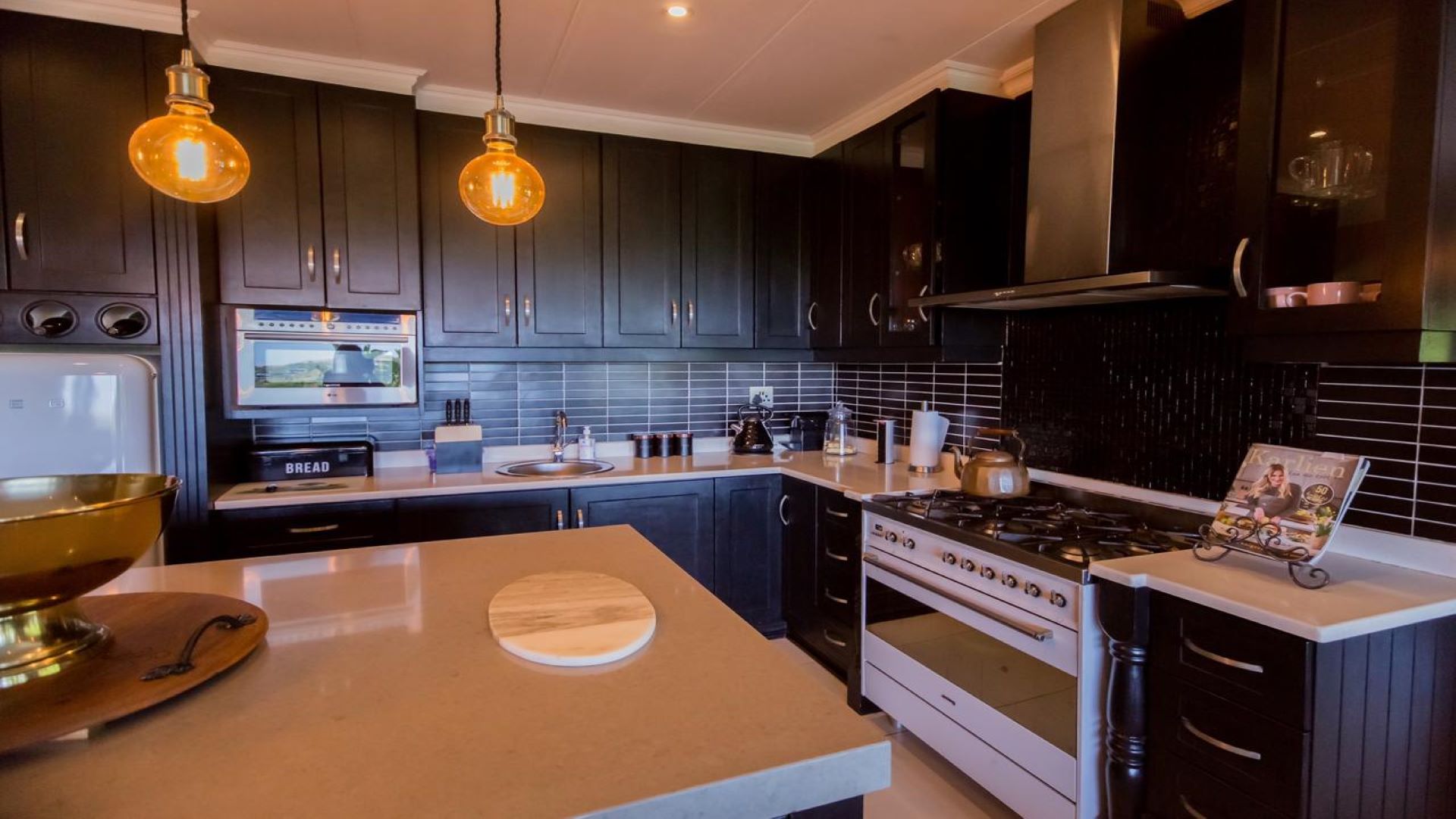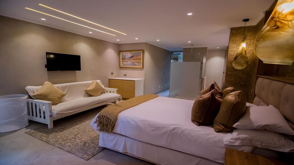 The home is thoughtfully designed over multiple levels, blending elegant interiors with expansive outdoor living. The upper floor welcomes you into a flowing open-plan layout that integrates the lounge, dining room, and gourmet kitchen with a separate scullery. This entire level opens onto a generous pool deck featuring a built-in braai and firepit area, creating a seamless indoor-outdoor lifestyle with views of the surrounding greenery.