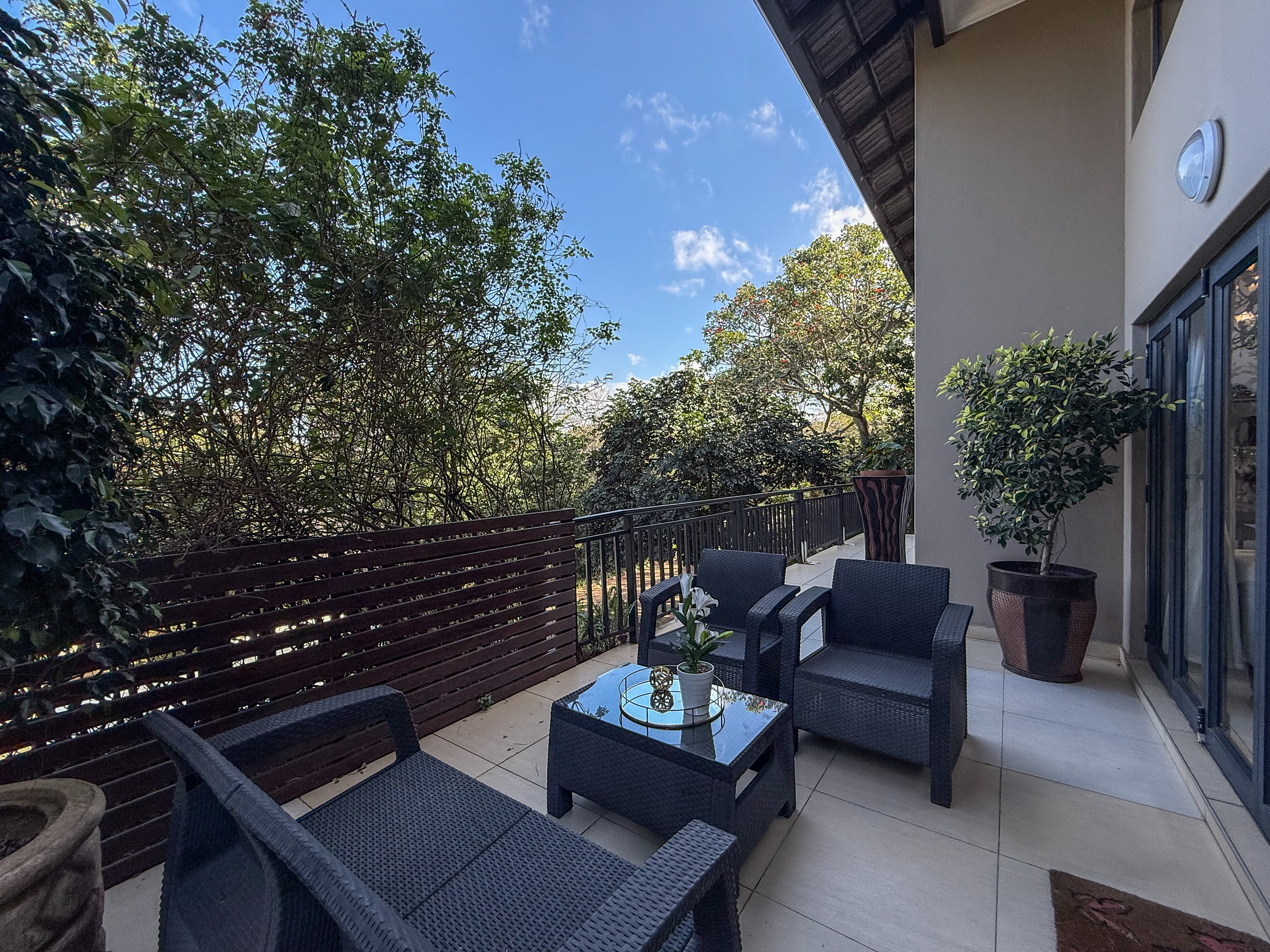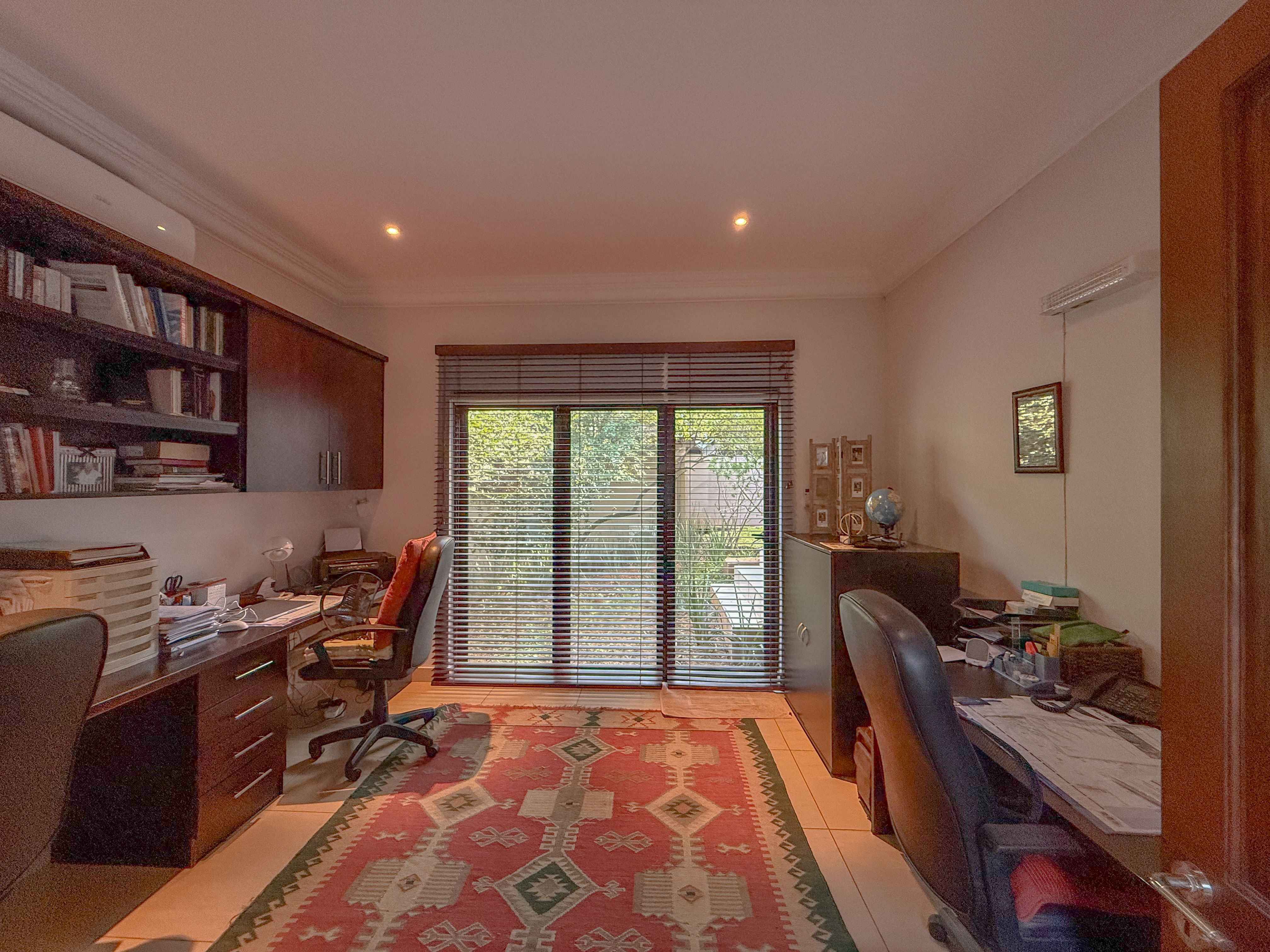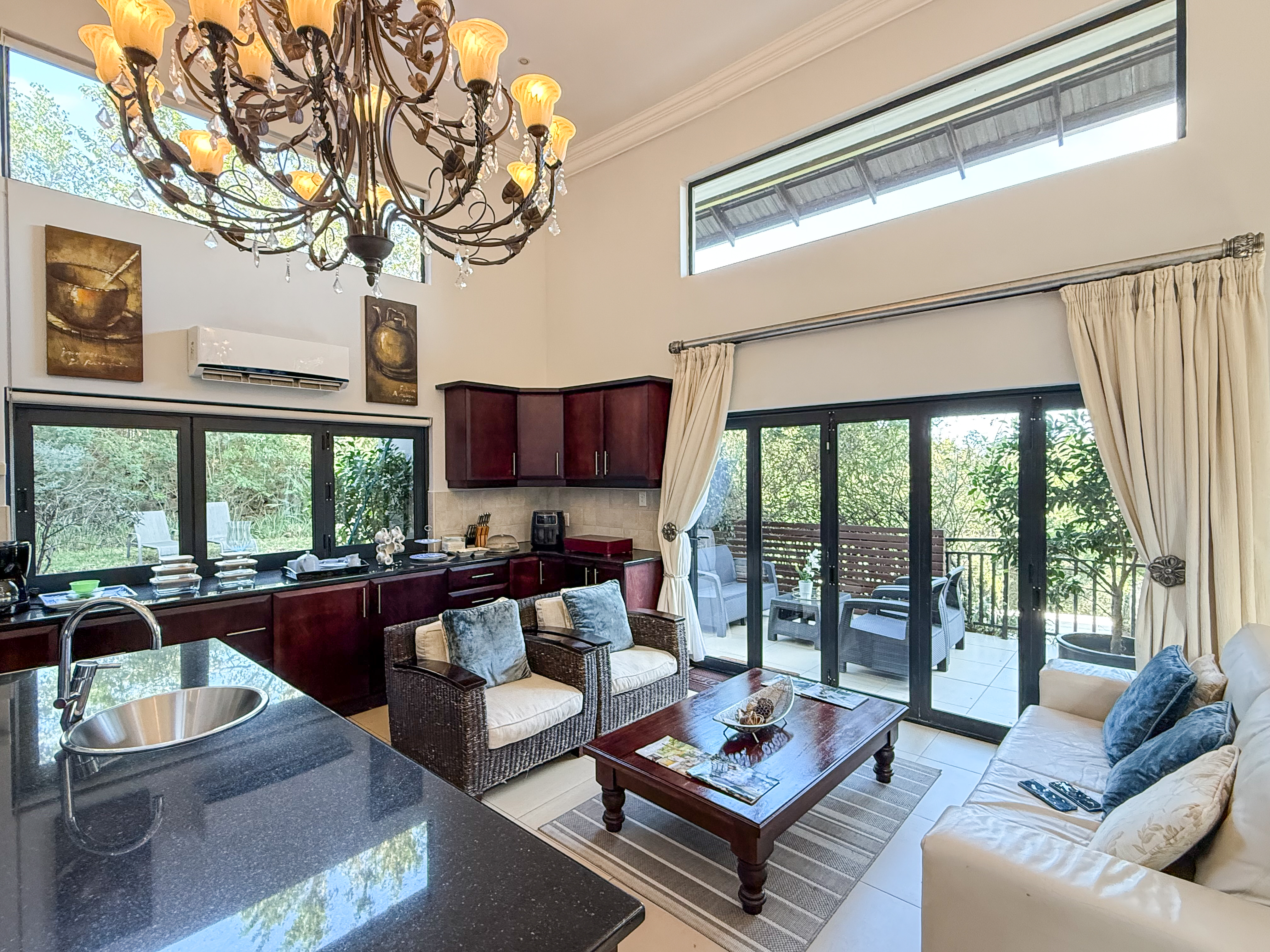 Up a few gentle steps, a sunlit office with built-in desks opens onto the garden, offering an inspiring work-from-home setting. Adjacent to it, a second lounge doubles as a TV room and entertainment zone, complete with a custom-designed bar. This space opens onto a stylish elevated deck with a pagoda-style roof, providing sweeping panoramic views over Simbithi Eco Estate — an ideal vantage point for sunset gatherings.