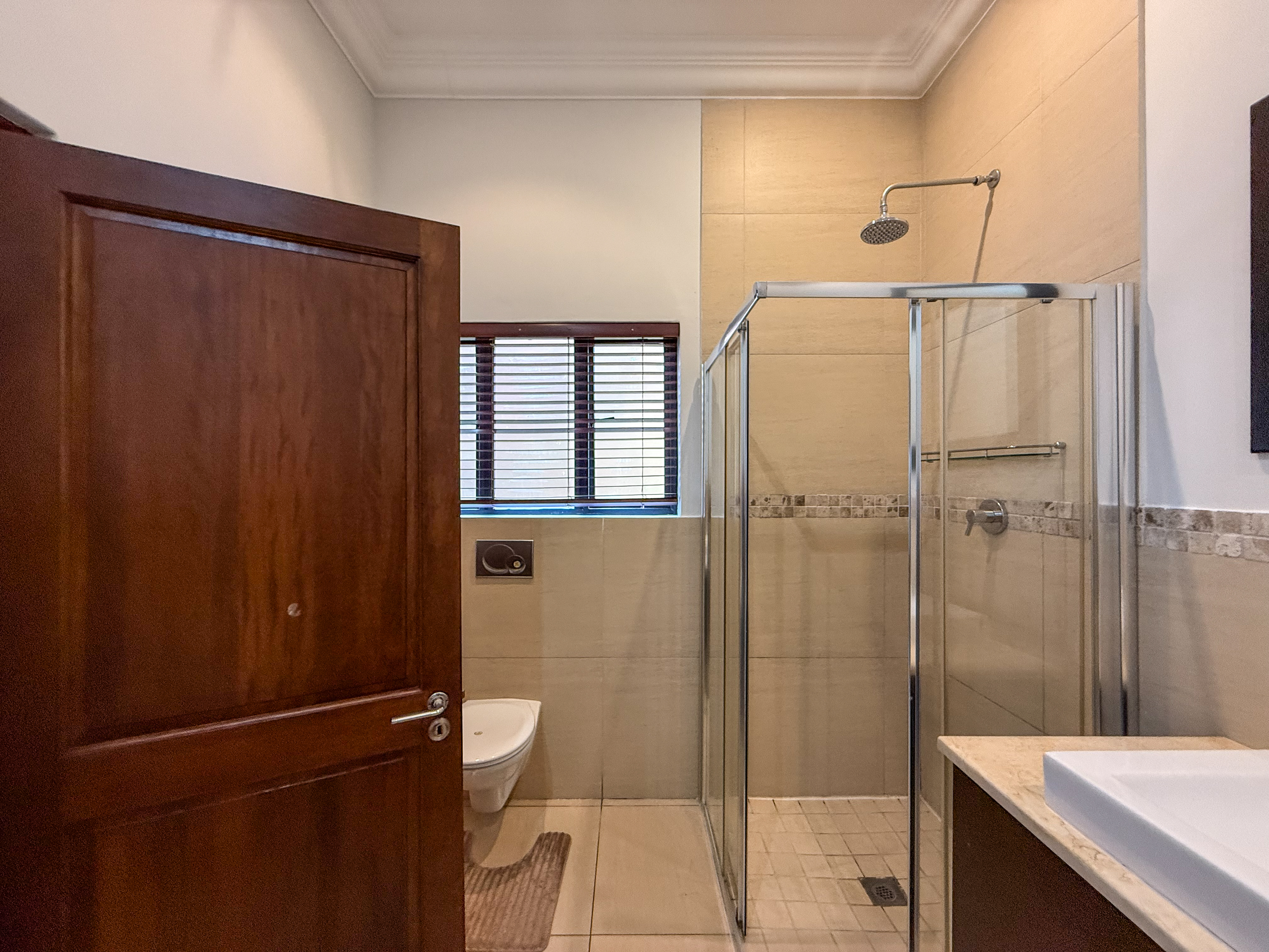 A sleek, well-appointed kitchen with a separate scullery and abundant cabinetry forms the social centre of the home. It merges effortlessly with the lounge and spills out onto an inviting covered patio — a perfect setting for entertaining, with a built-in braai and sparkling private pool that lies nestled within a level garden.