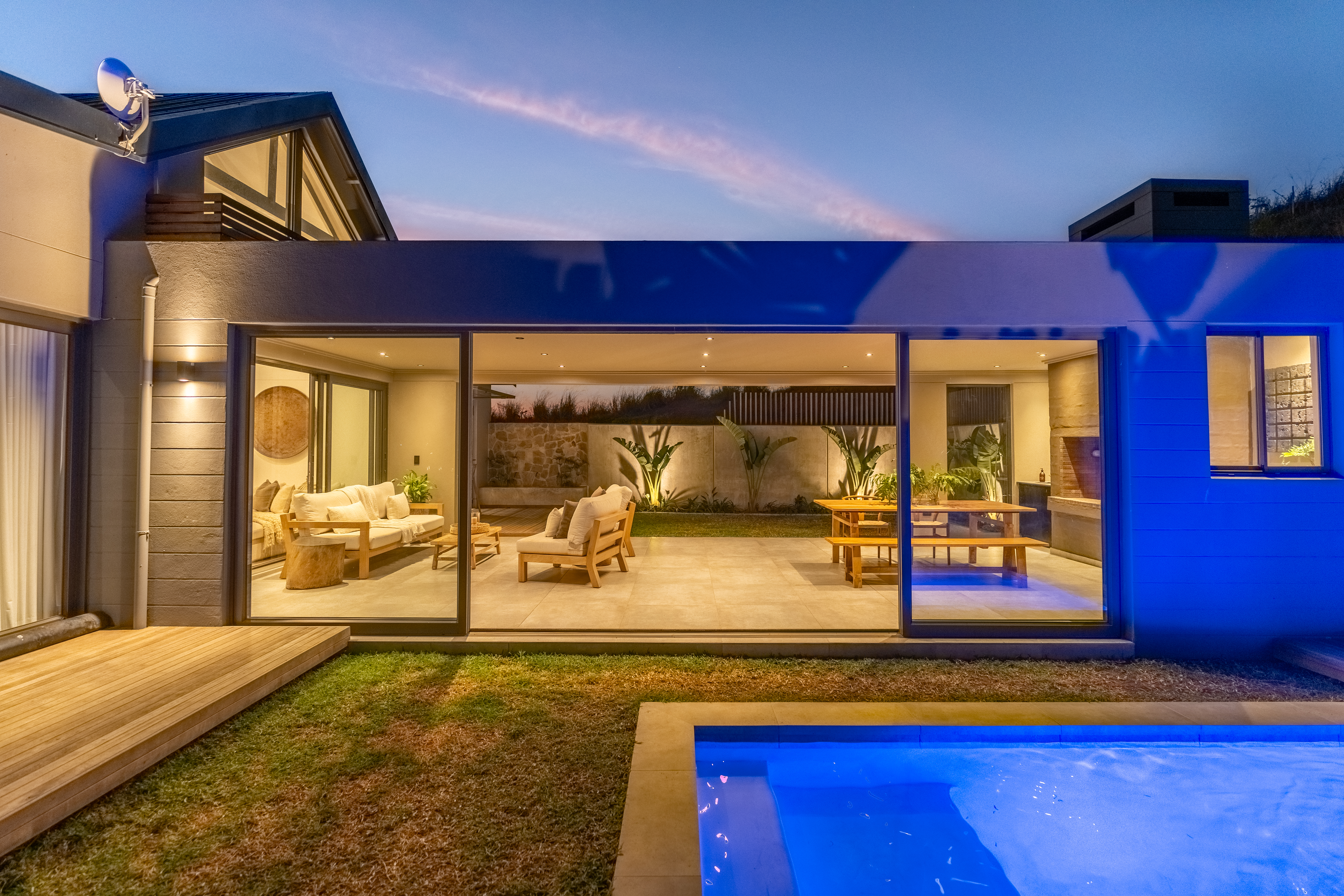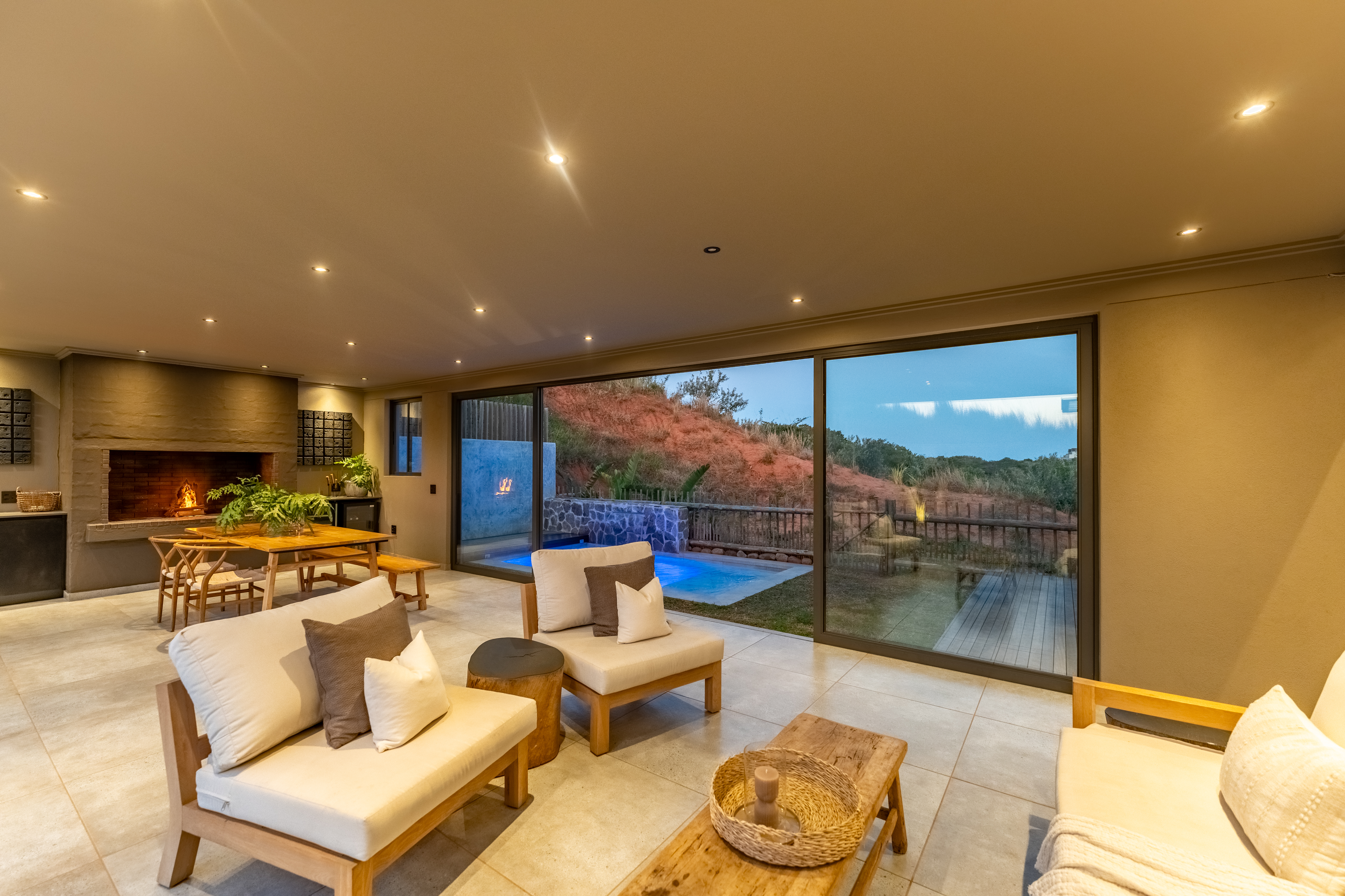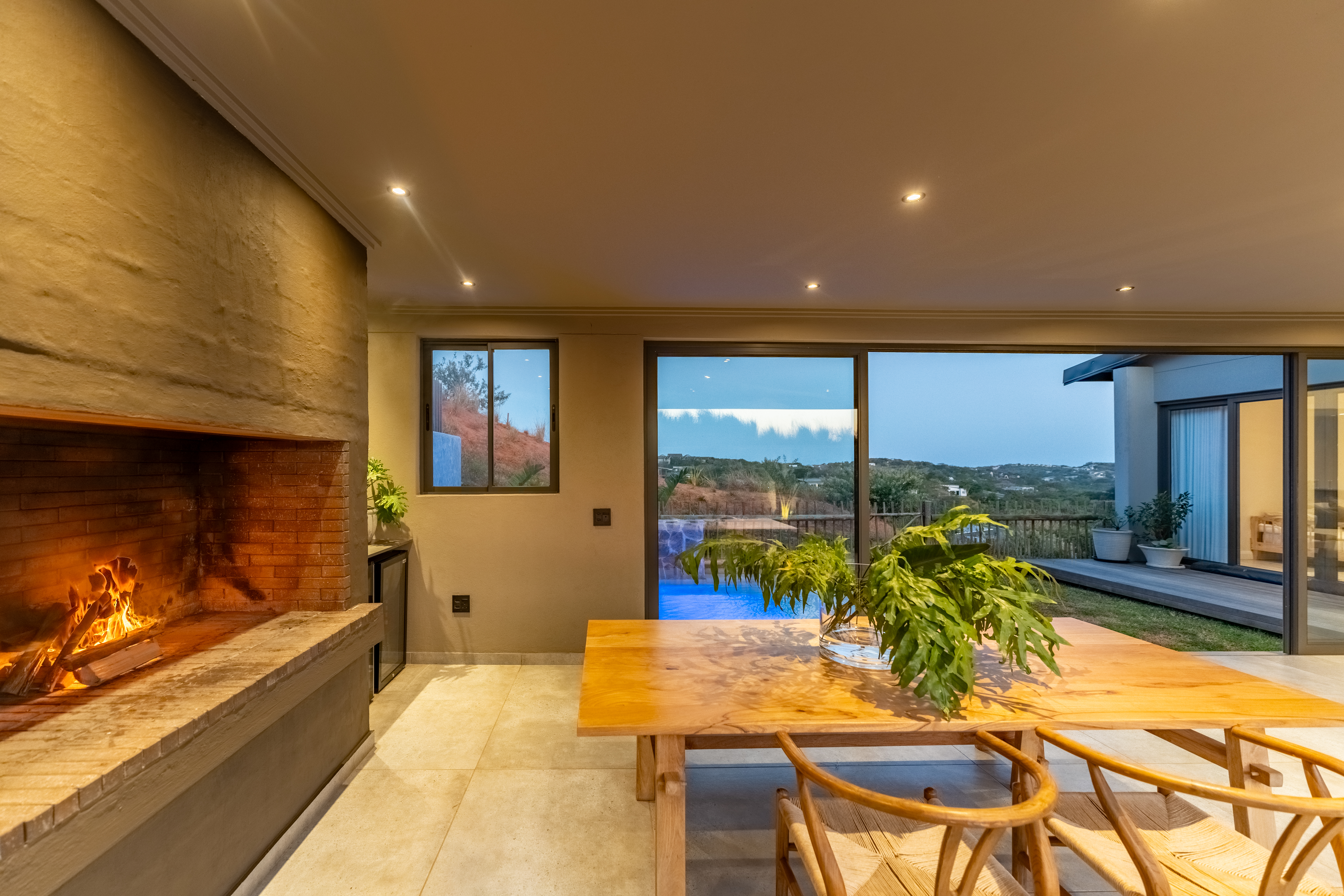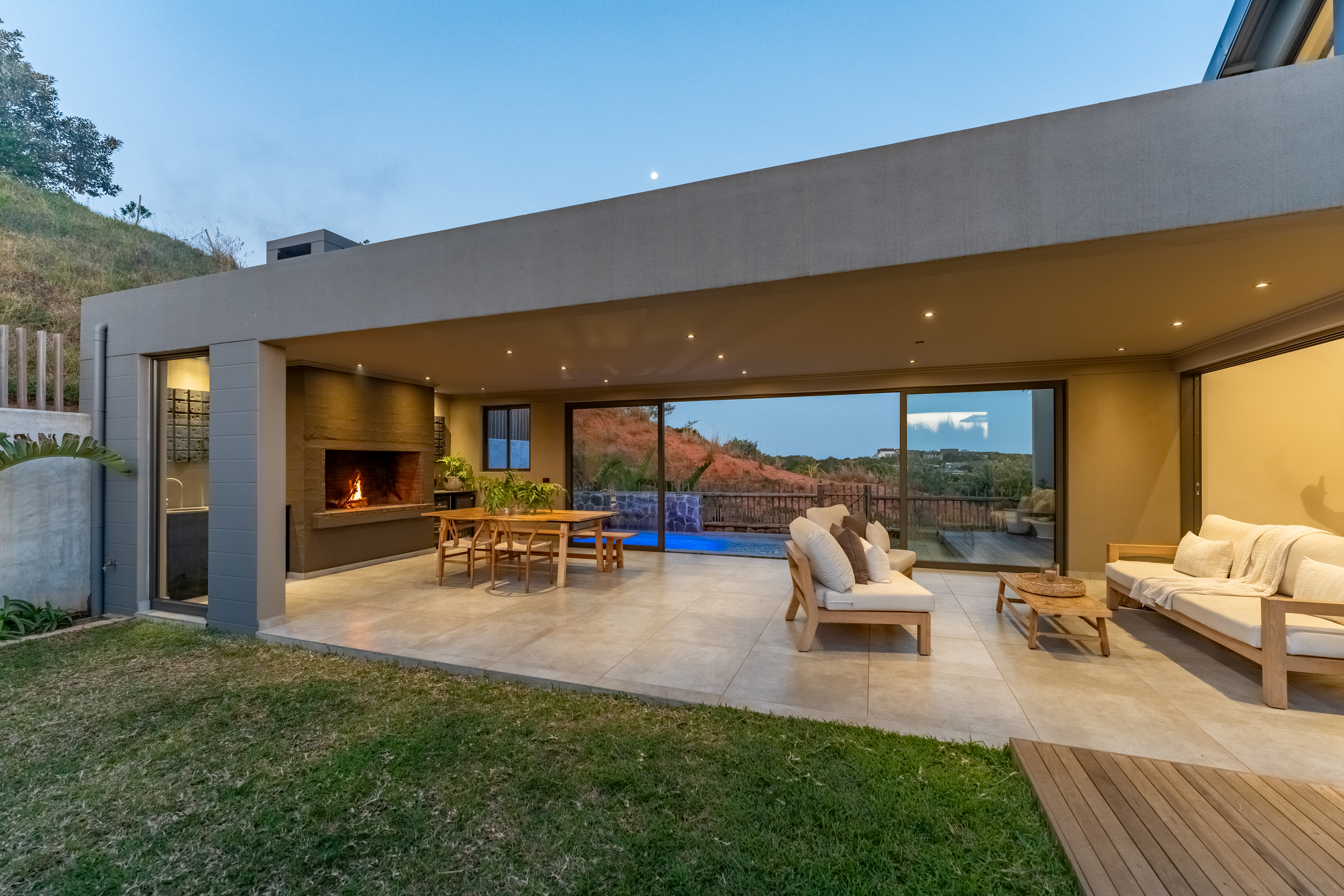 Step inside and experience open plan living at its best. The spacious lounge and dining area flow seamlessly into a stylish kitchen and out to a beautifully designed entertainment area complete with built in braai and a sparkling pool. Large sliding doors invite the outdoors in and frame scenic views over the estate.