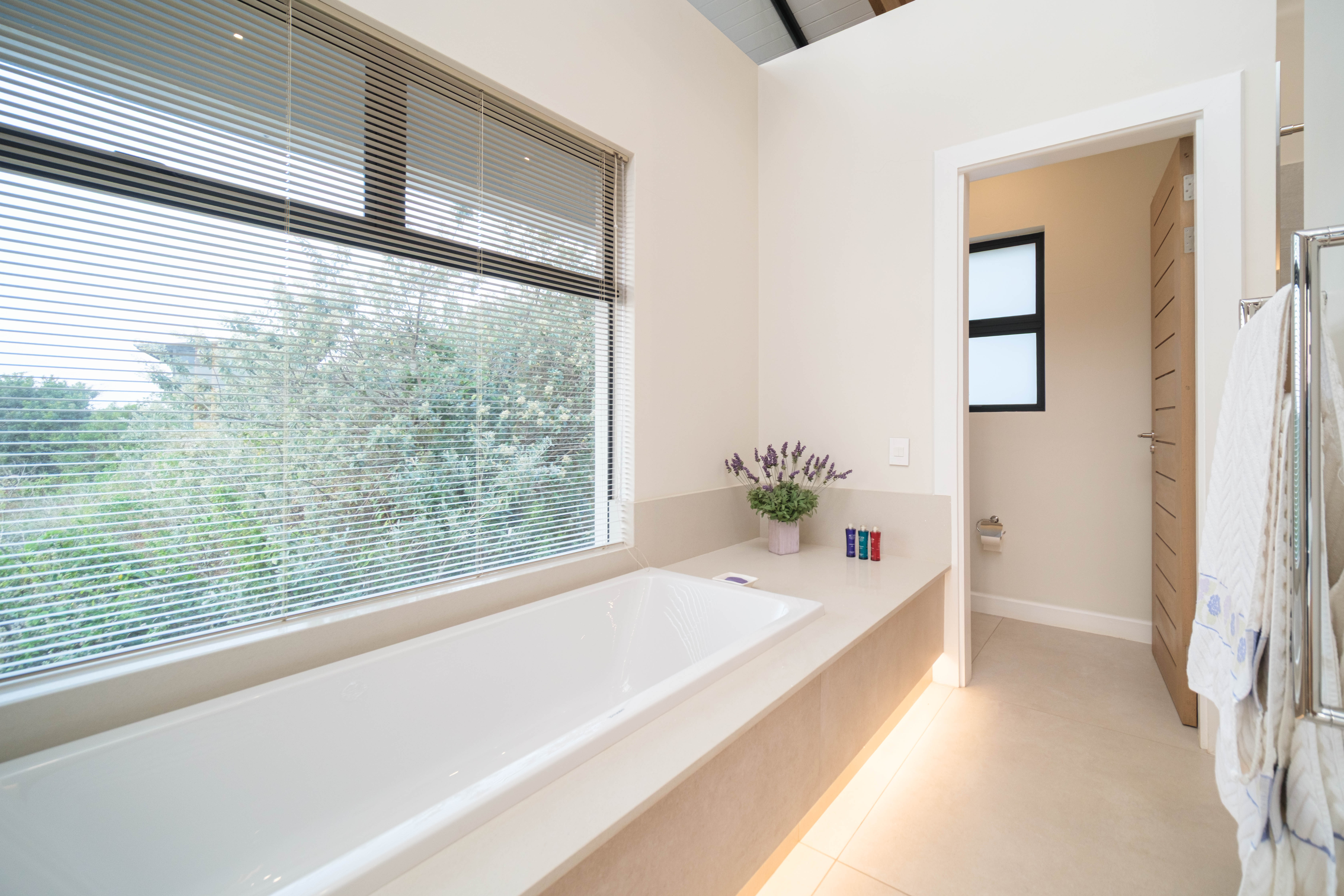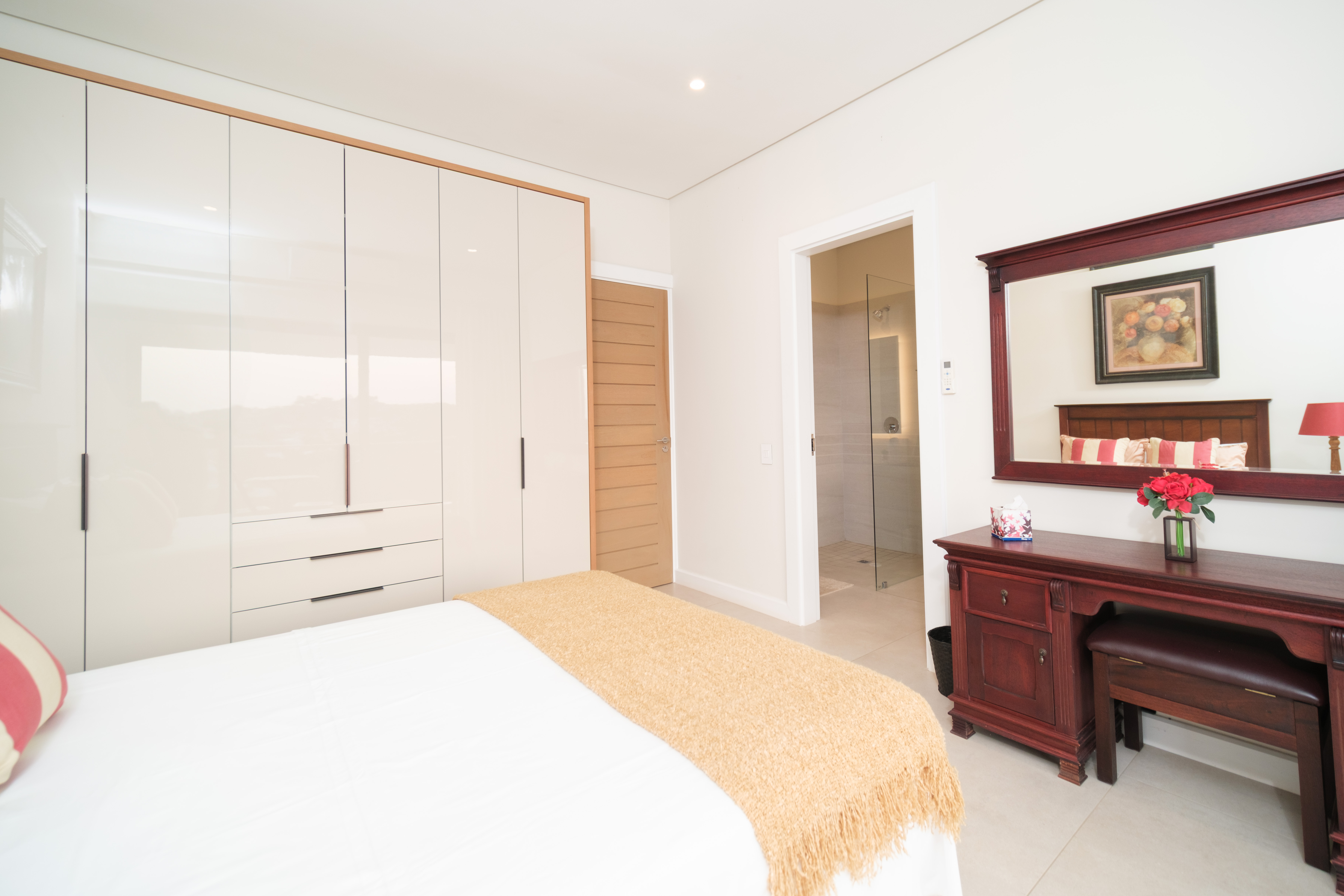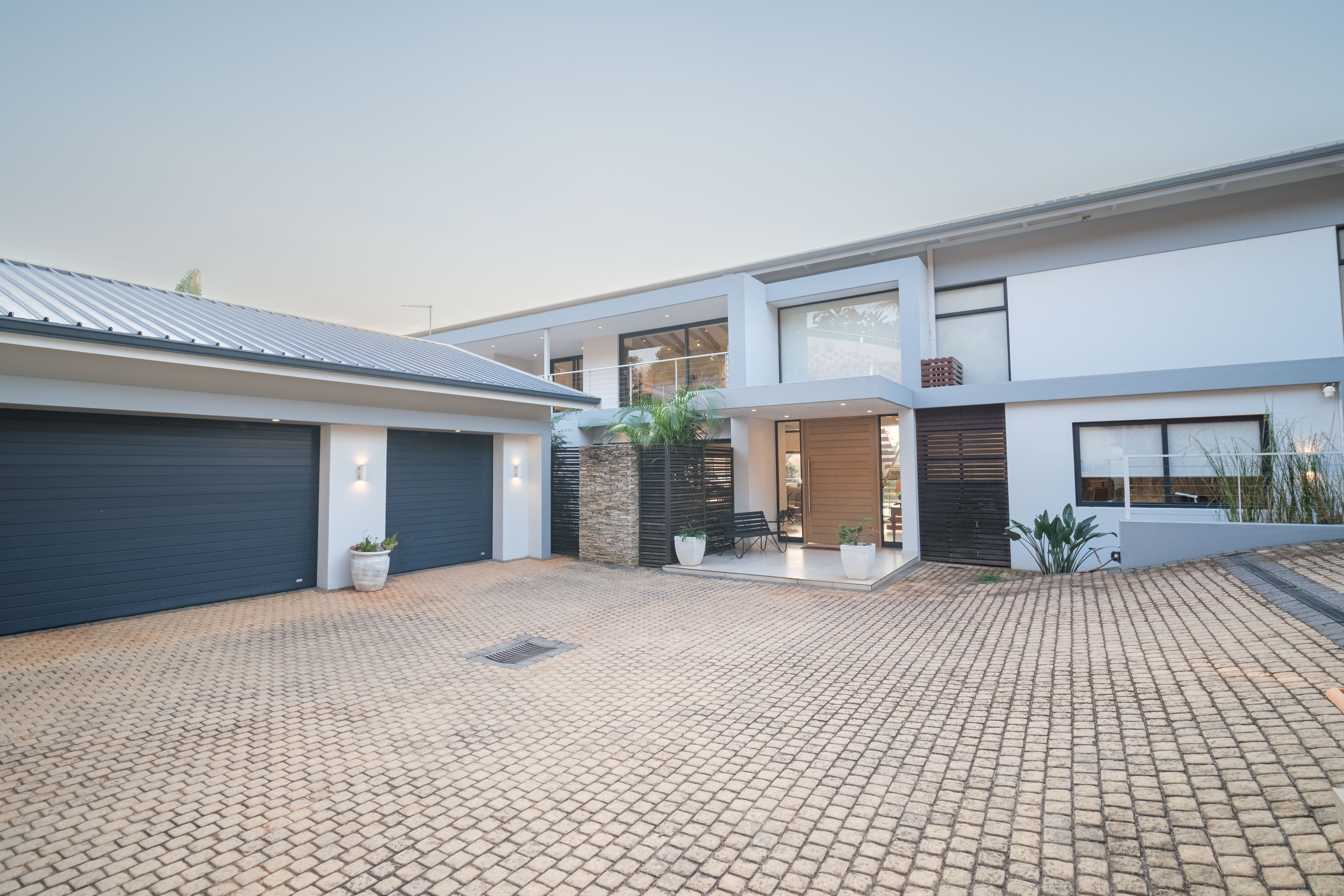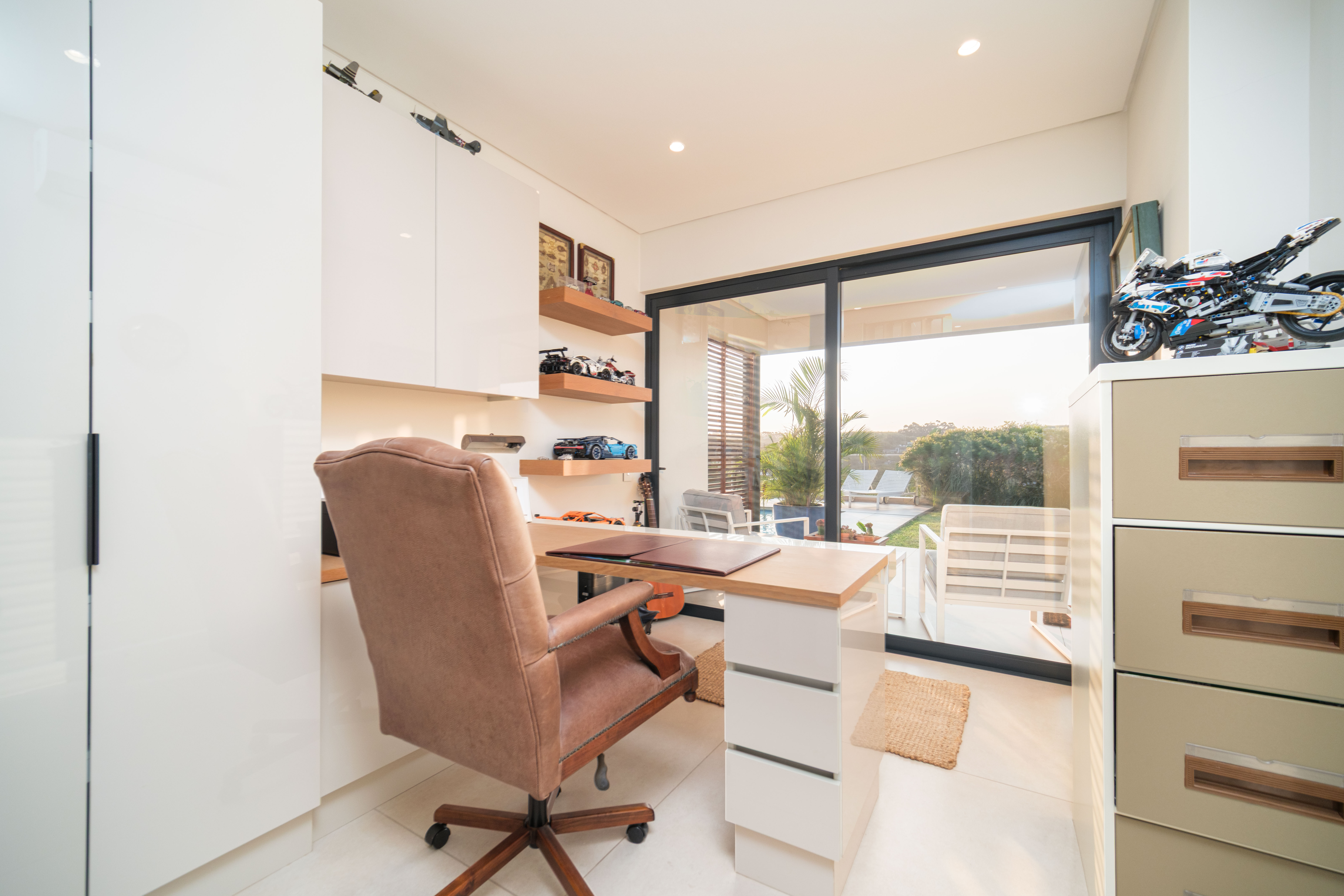 The bespoke designer kitchen, featuring sleek cabinetry and a separate scullery, anchors the integrated living areas that flow into a formal dining room overlooking a landscaped atrium, dual lounge spaces, and a superbly appointed bar complete with a built-in braai and pizza oven. A sophisticated office with poolside views and outdoor access provides an inspiring workspace, complemented by a second office located on the walk-in level. A lavish ground-floor bedroom suite enjoys direct garden access and tranquil poolside vistas through a wall of glass doors, offering a built-in dressing table, a luxurious dressing area, and a sumptuous full bathroom with premium finishes.