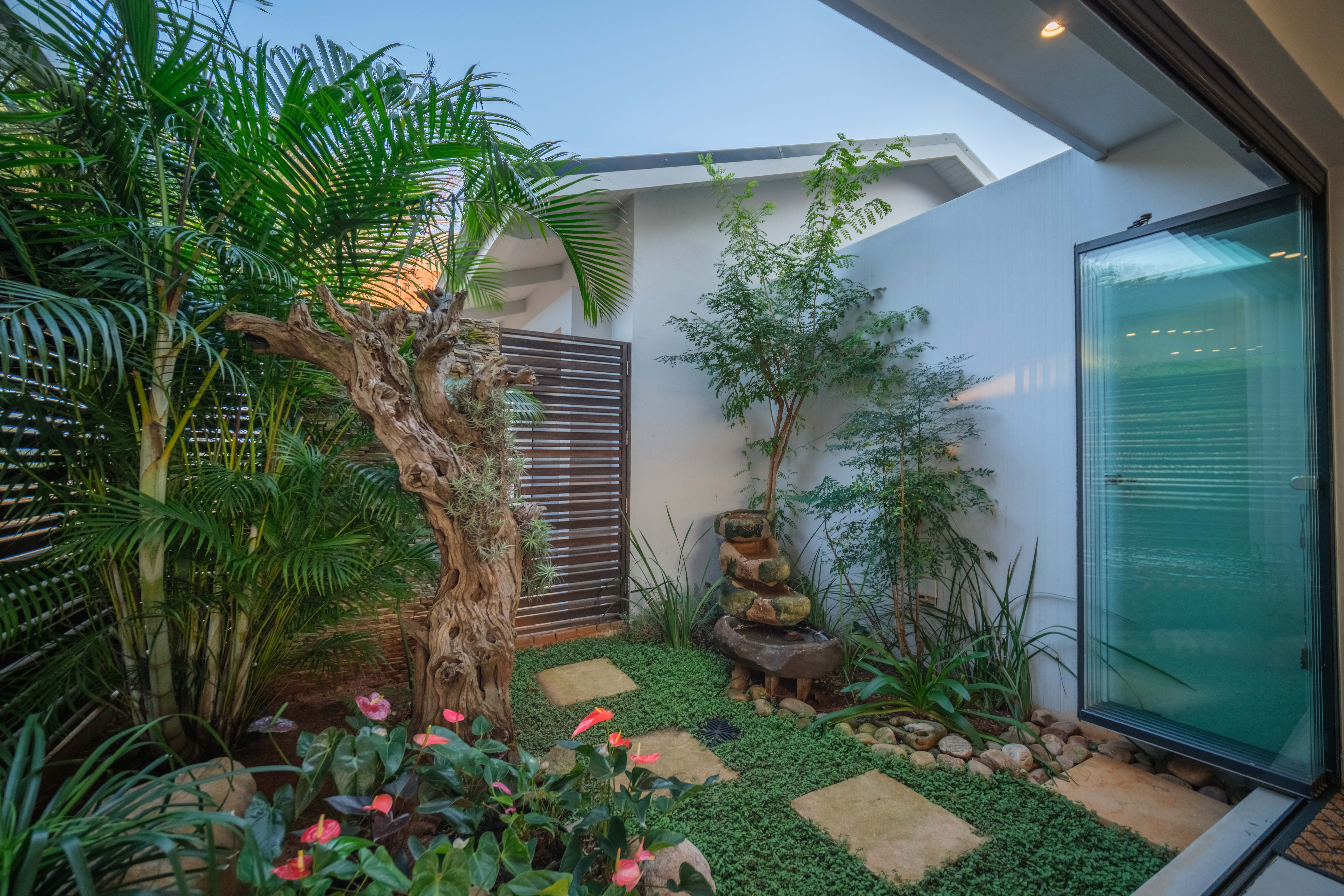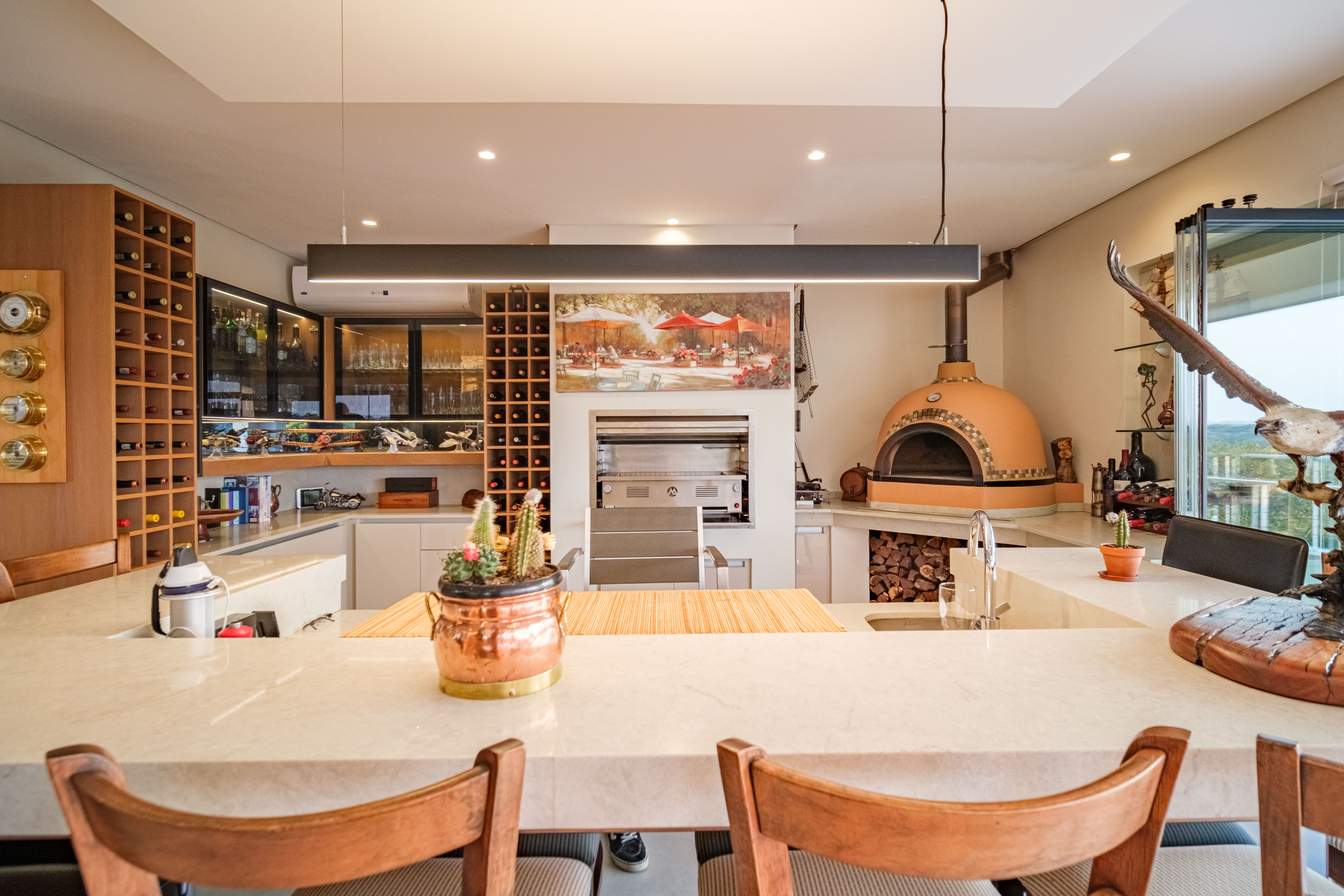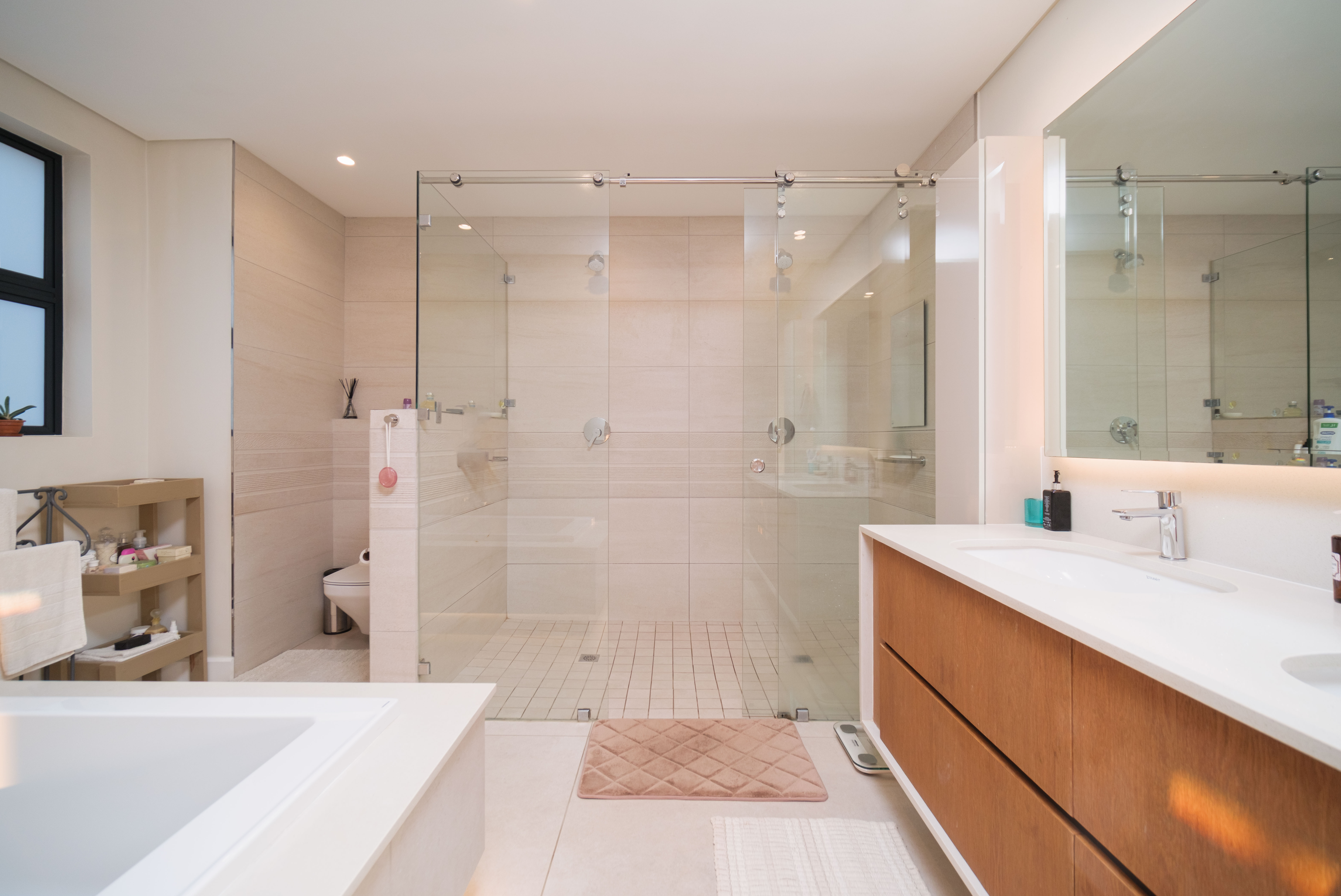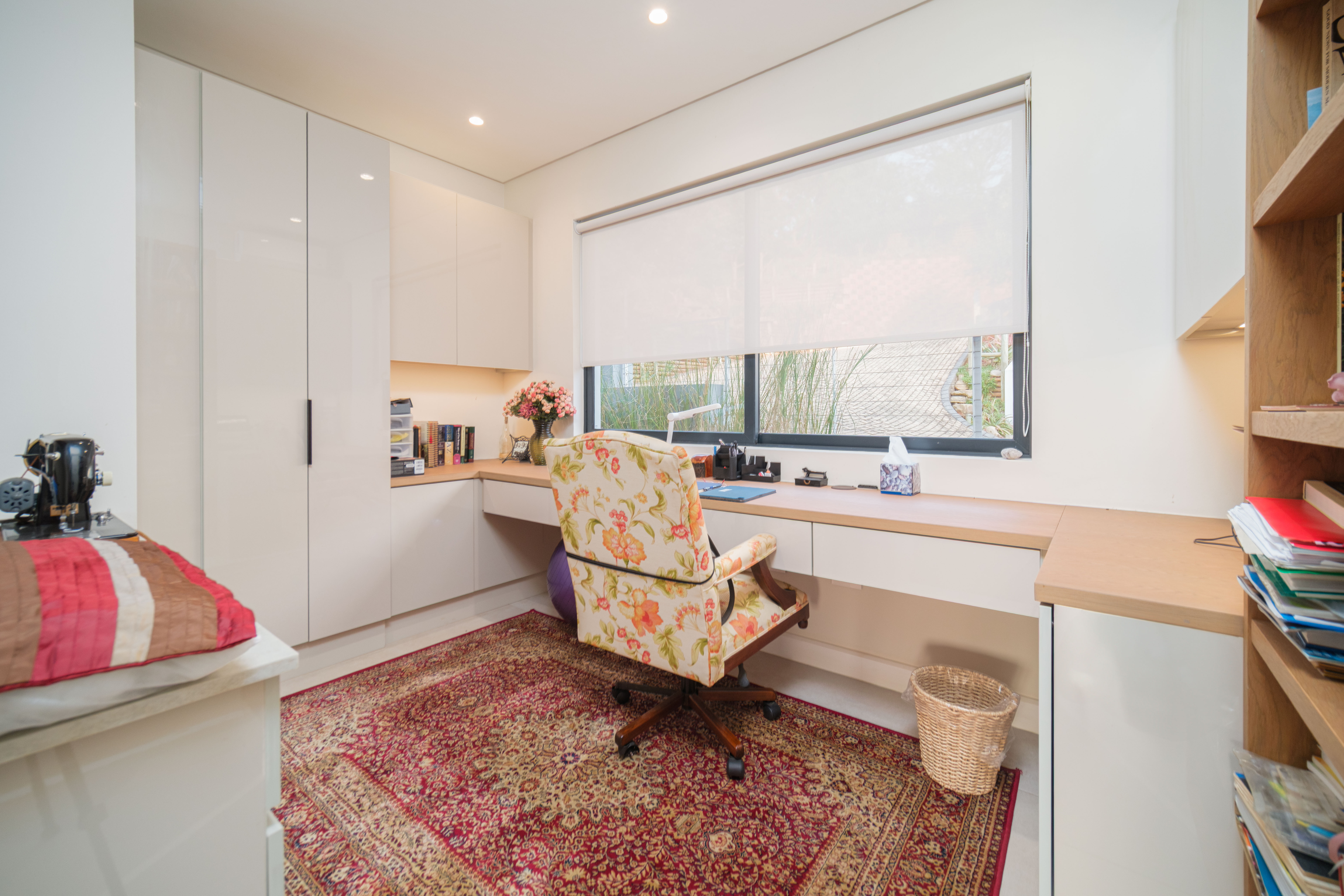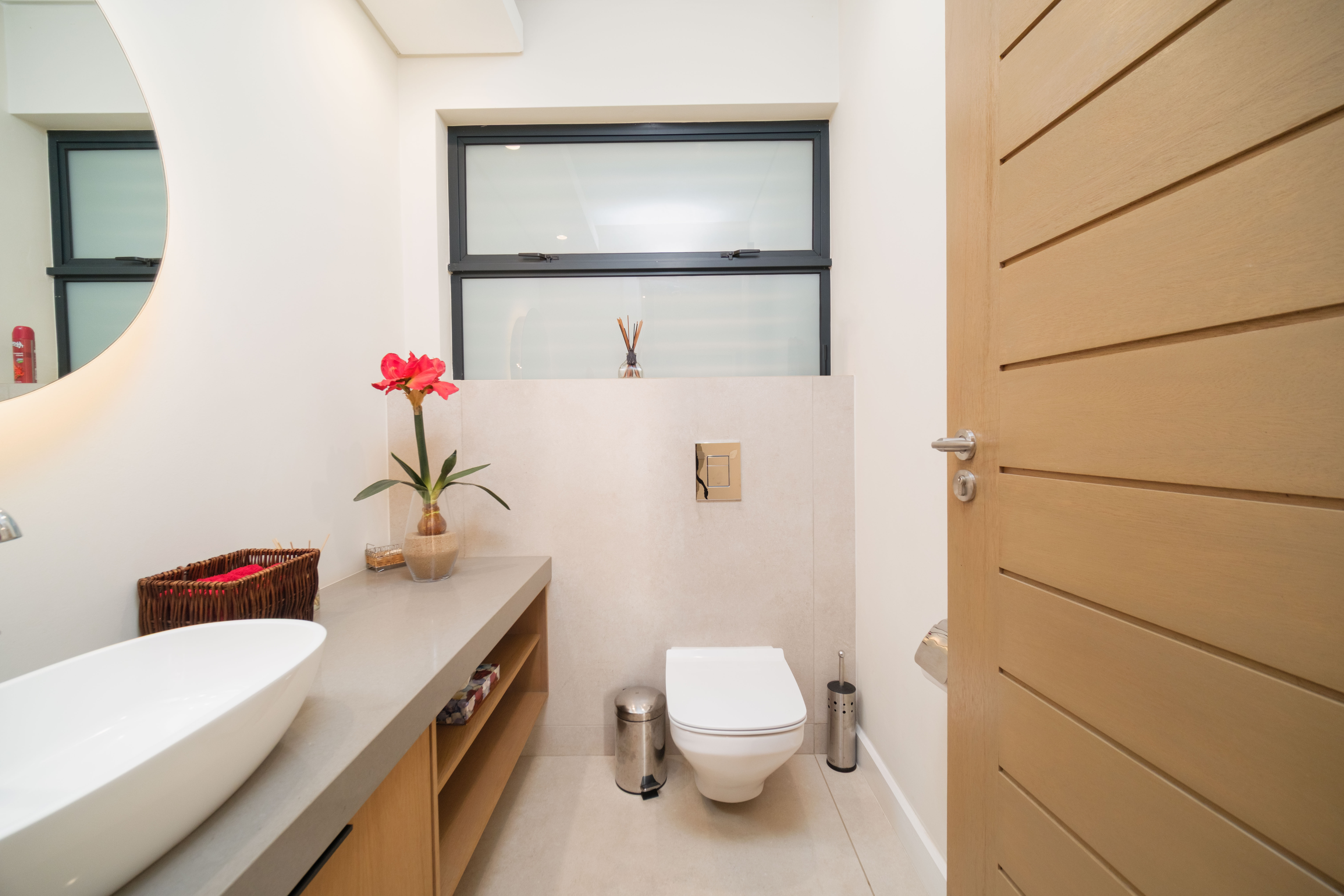The bespoke designer kitchen, featuring sleek cabinetry and a separate scullery, anchors the integrated living areas that flow into a formal dining room overlooking a landscaped atrium, dual lounge spaces, and a superbly appointed bar complete with a built-in braai and pizza oven. A sophisticated office with poolside views and outdoor access provides an inspiring workspace, complemented by a second office located on the walk-in level. A lavish ground-floor bedroom suite enjoys direct garden access and tranquil poolside vistas through a wall of glass doors, offering a built-in dressing table, a luxurious dressing area, and a sumptuous full bathroom with premium finishes.