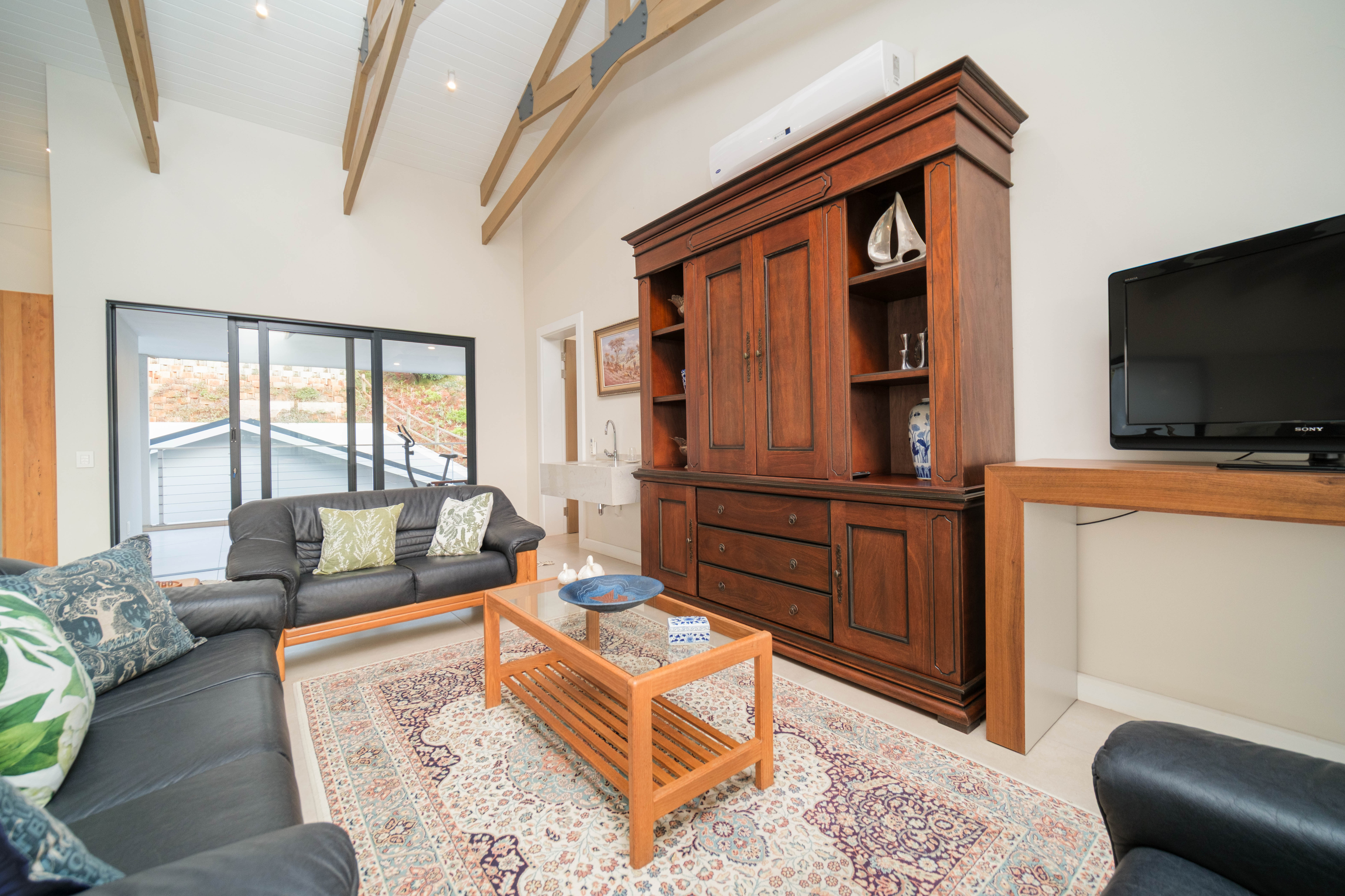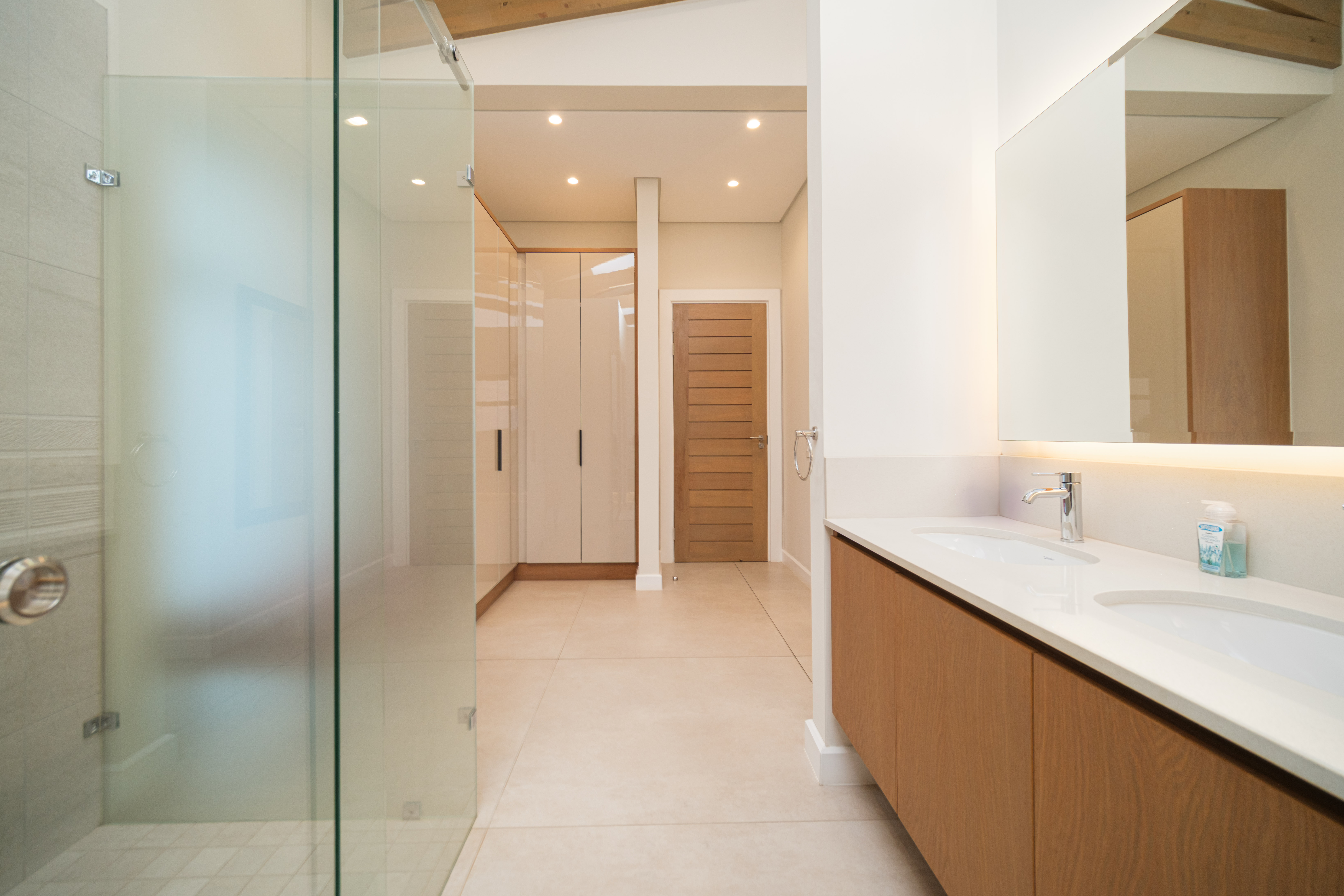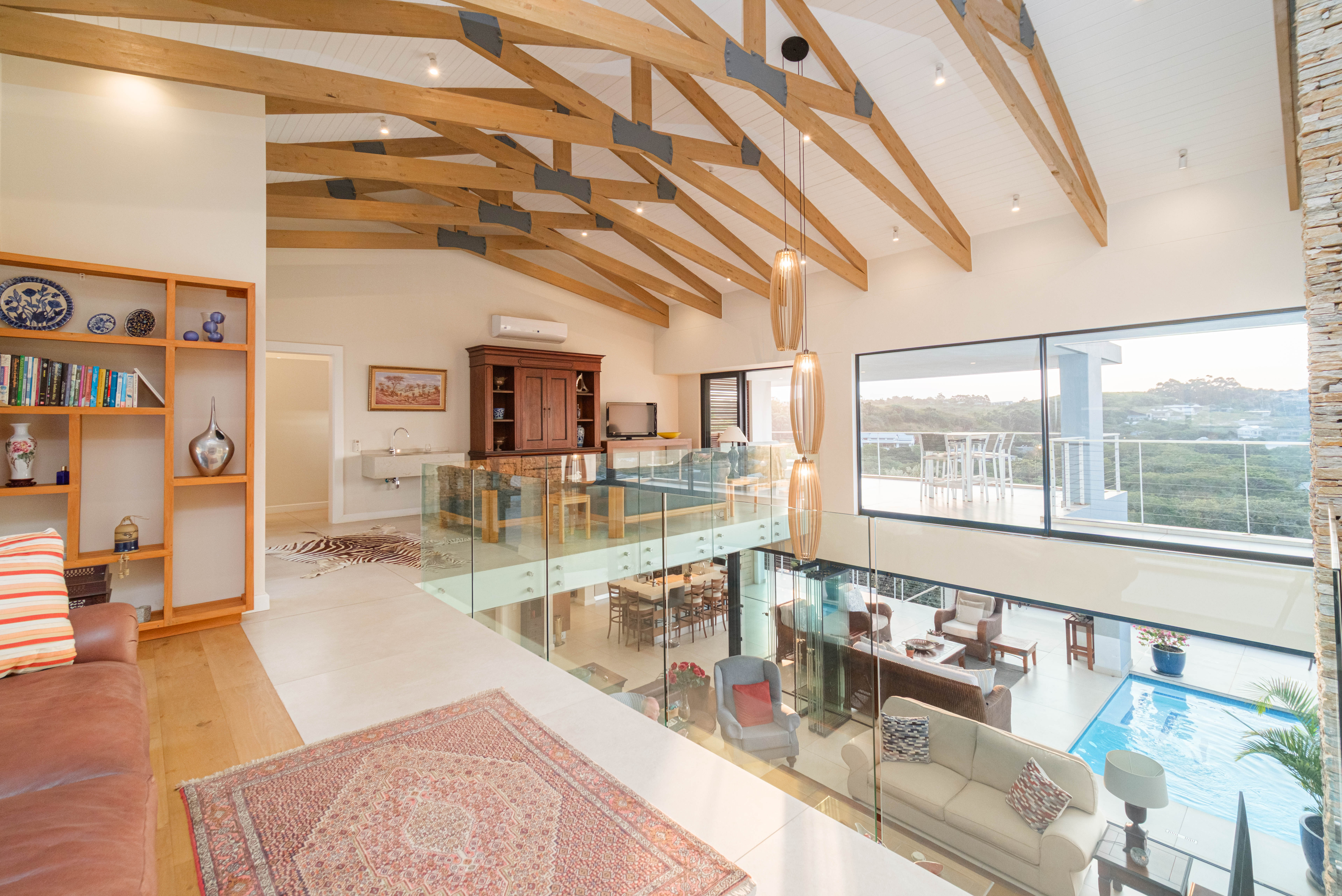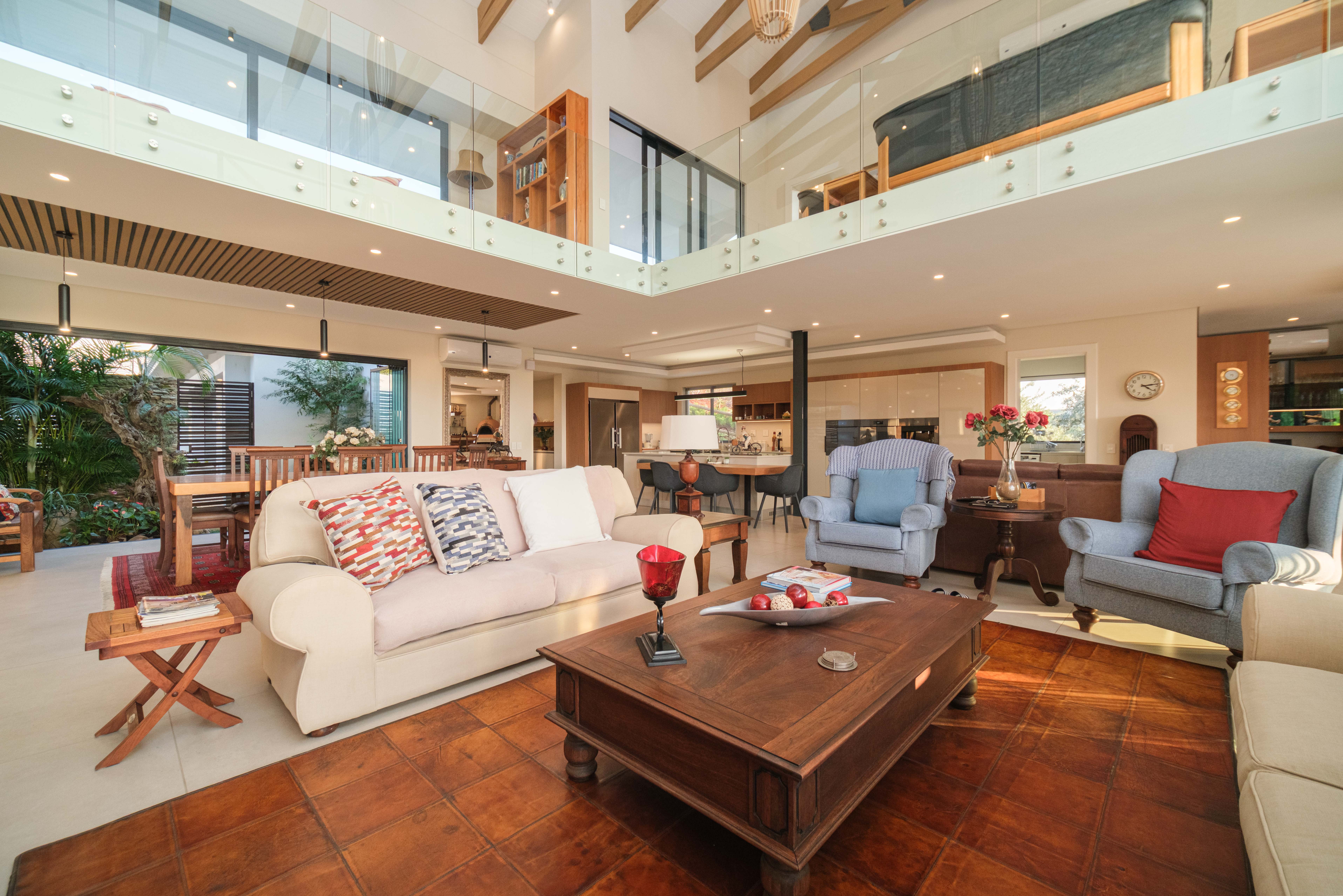 The home’s double-volume living spaces are bathed in natural light, streaming through floor-to-ceiling glass panels that frame the magnificent surroundings. A striking stone feature wall, open rafter ceilings, and generous proportions enhance the sense of grandeur, while multiple glass stacking doors open to an expansive veranda that overlooks a sparkling L-shaped swimming pool, manicured gardens, and endless views beyond. Designed for both intimate moments and grand-scale entertaining, the residence effortlessly blends glamour and functionality in every detail.