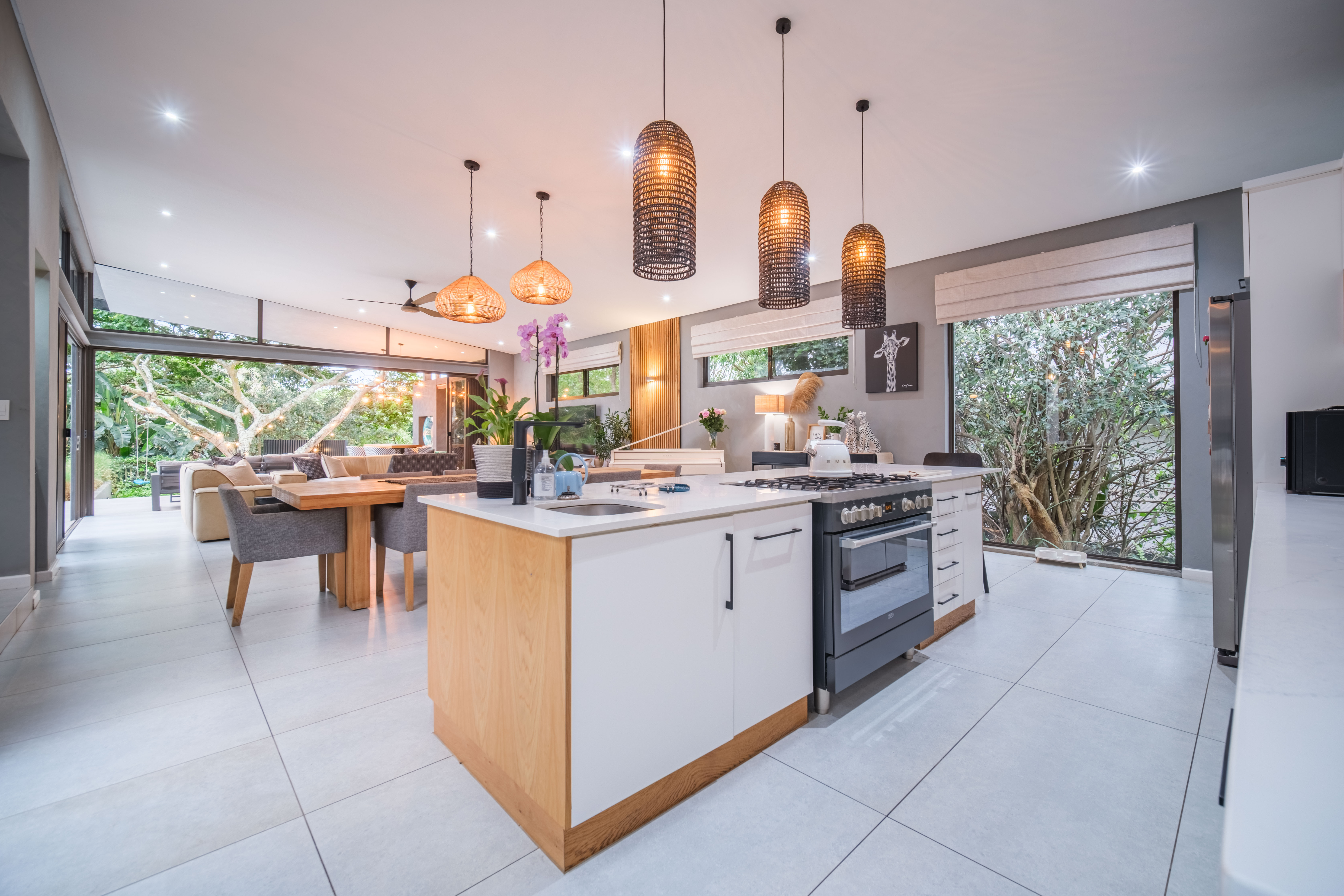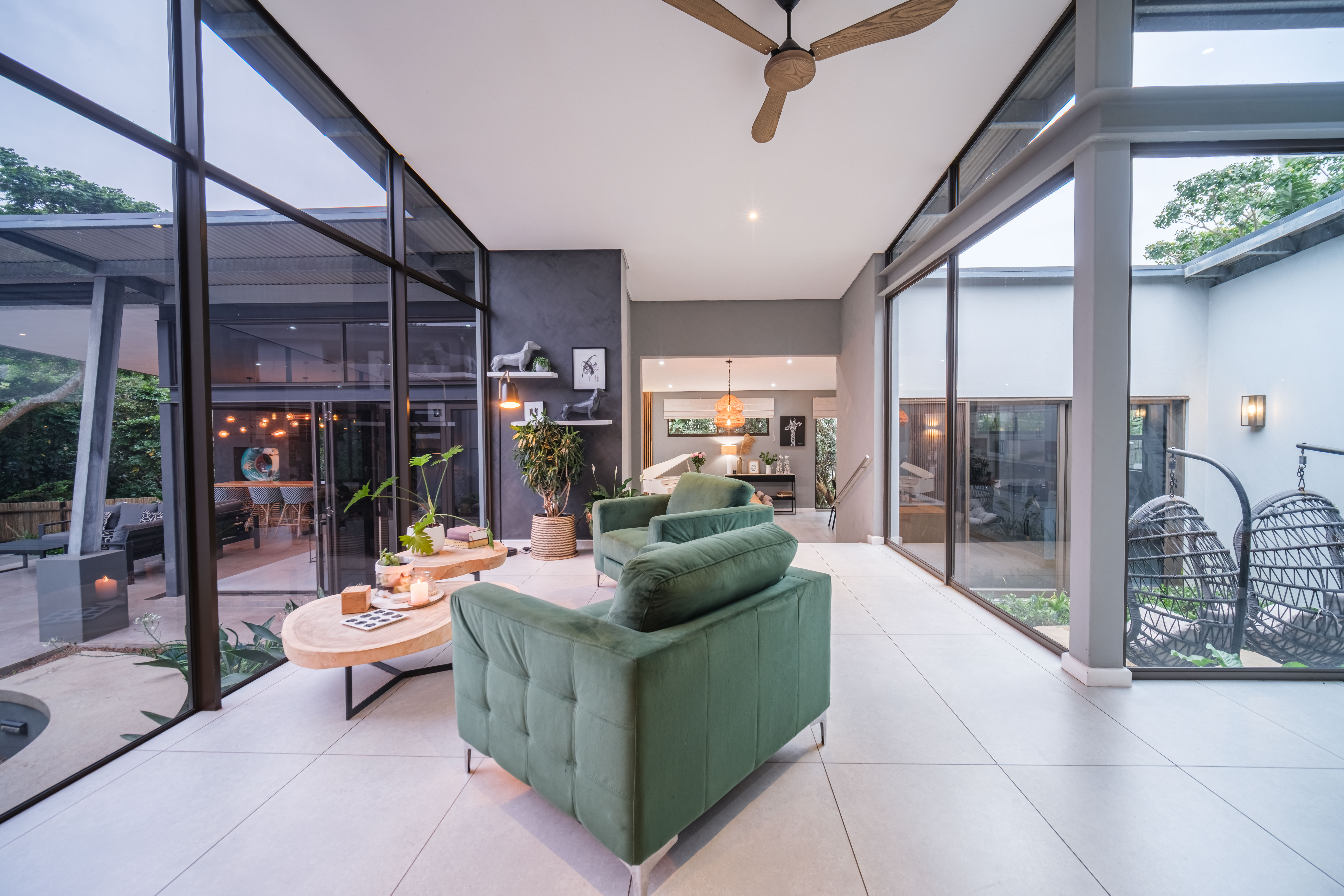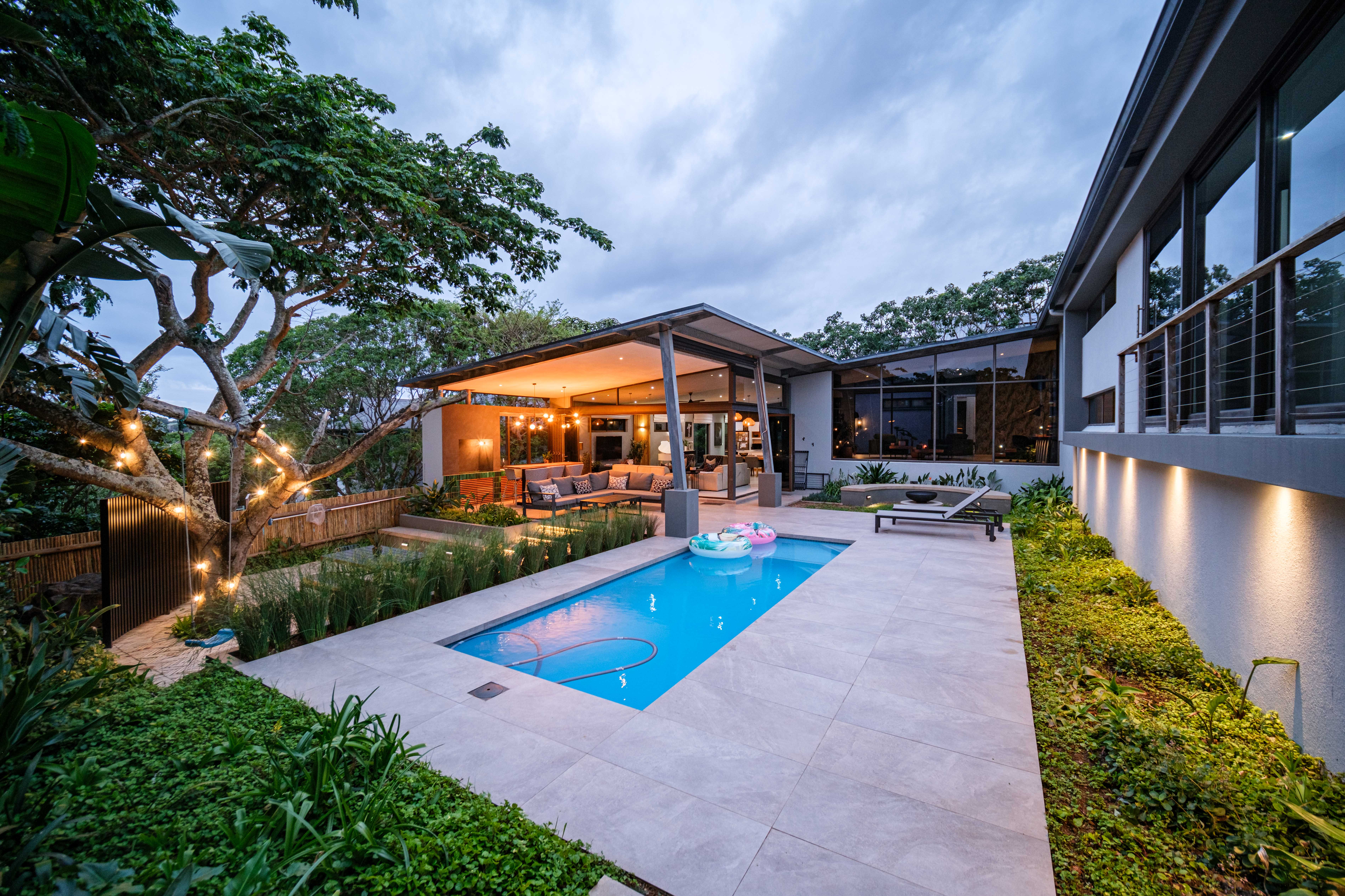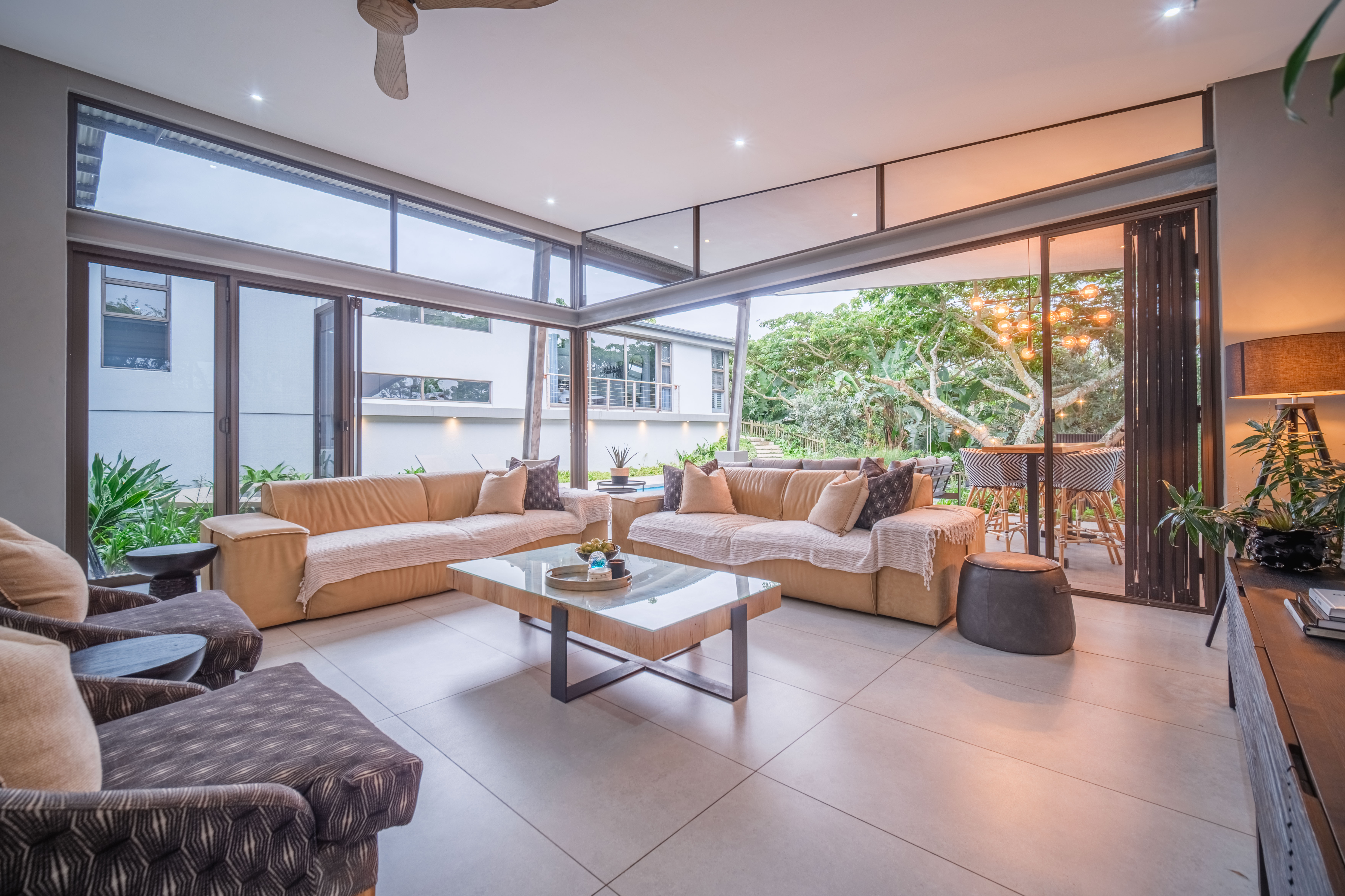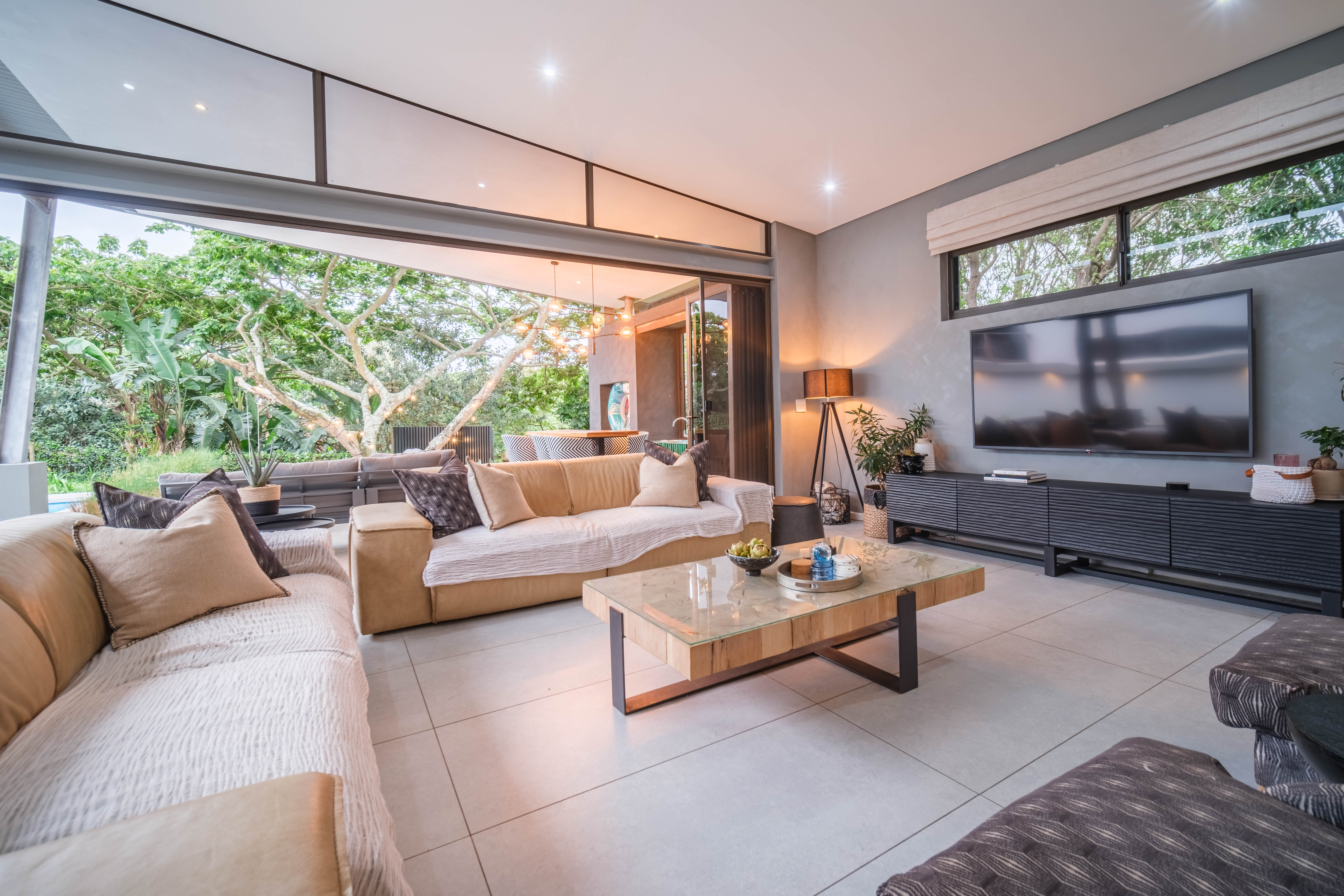 Experience the epitome of coastal luxury in this exquisite Simbithi Eco Estate home, where open-plan living meets modern elegance. The expansive living area flows effortlessly through large glass sliders onto a stunning entertainment space featuring a sparkling pool, fire pit, and braai area—perfect for relaxed afternoons or elegant evening gatherings. Every element has been designed for comfort and style, creating an inviting atmosphere ideal for both family living and entertaining guests.