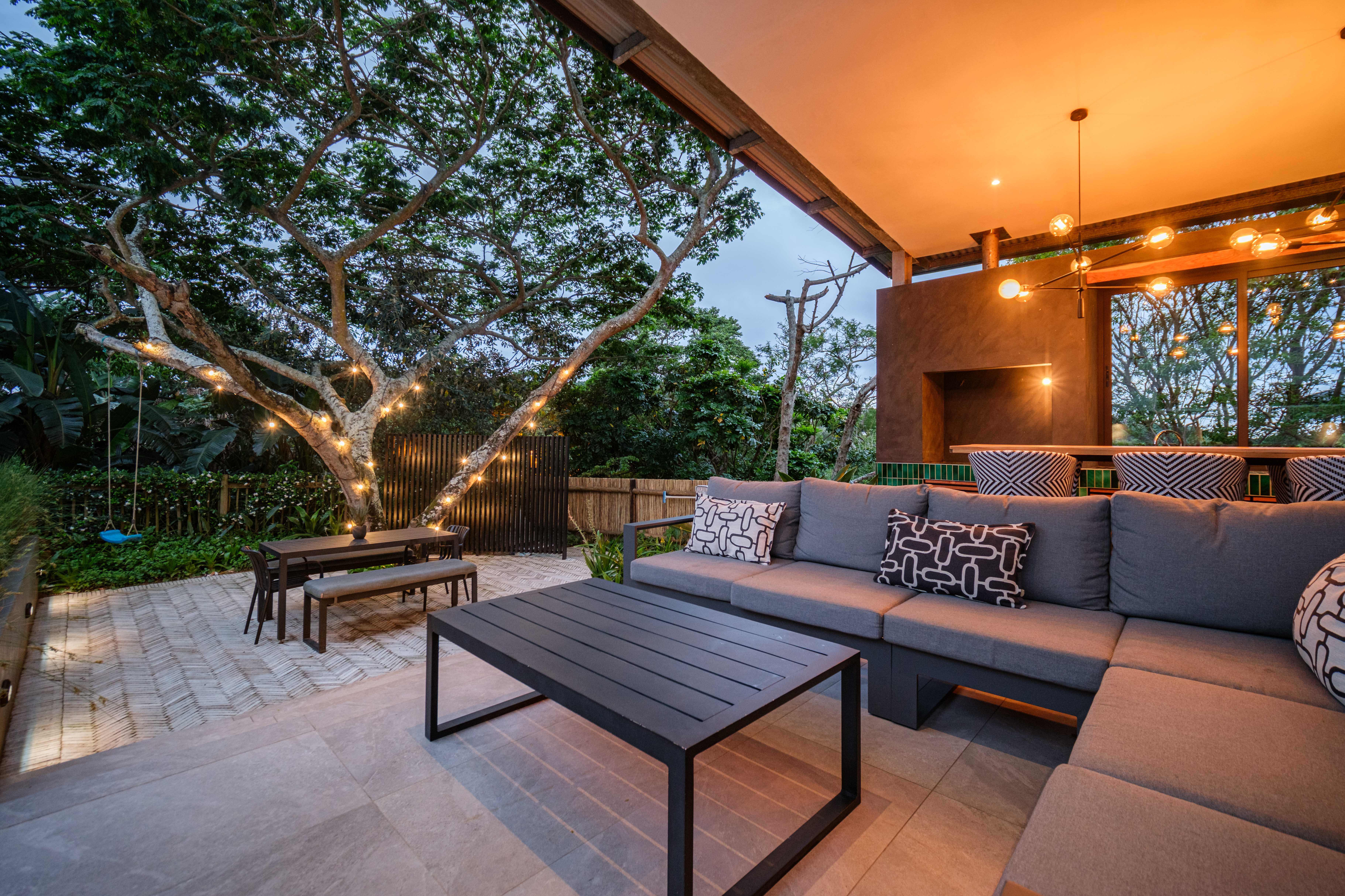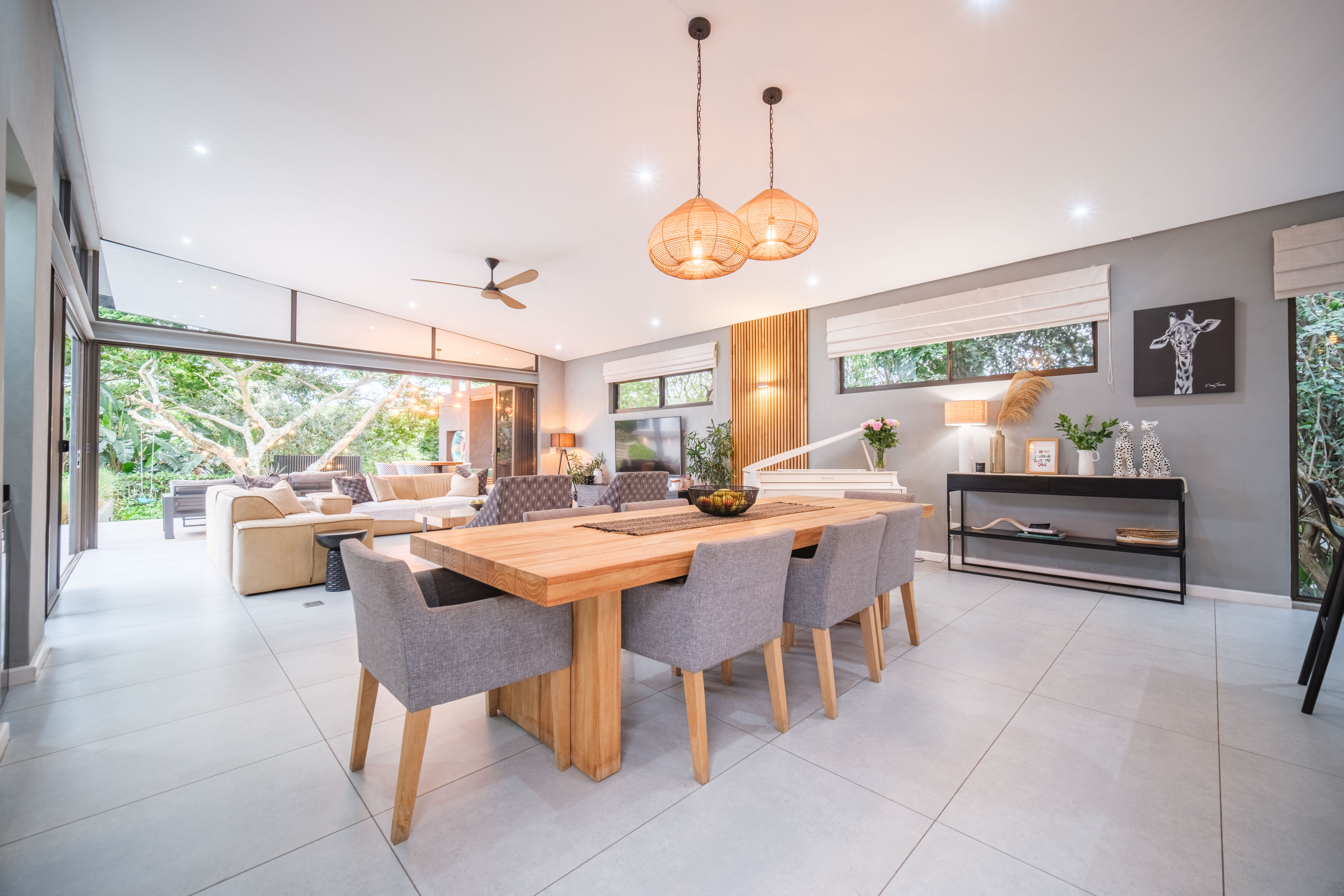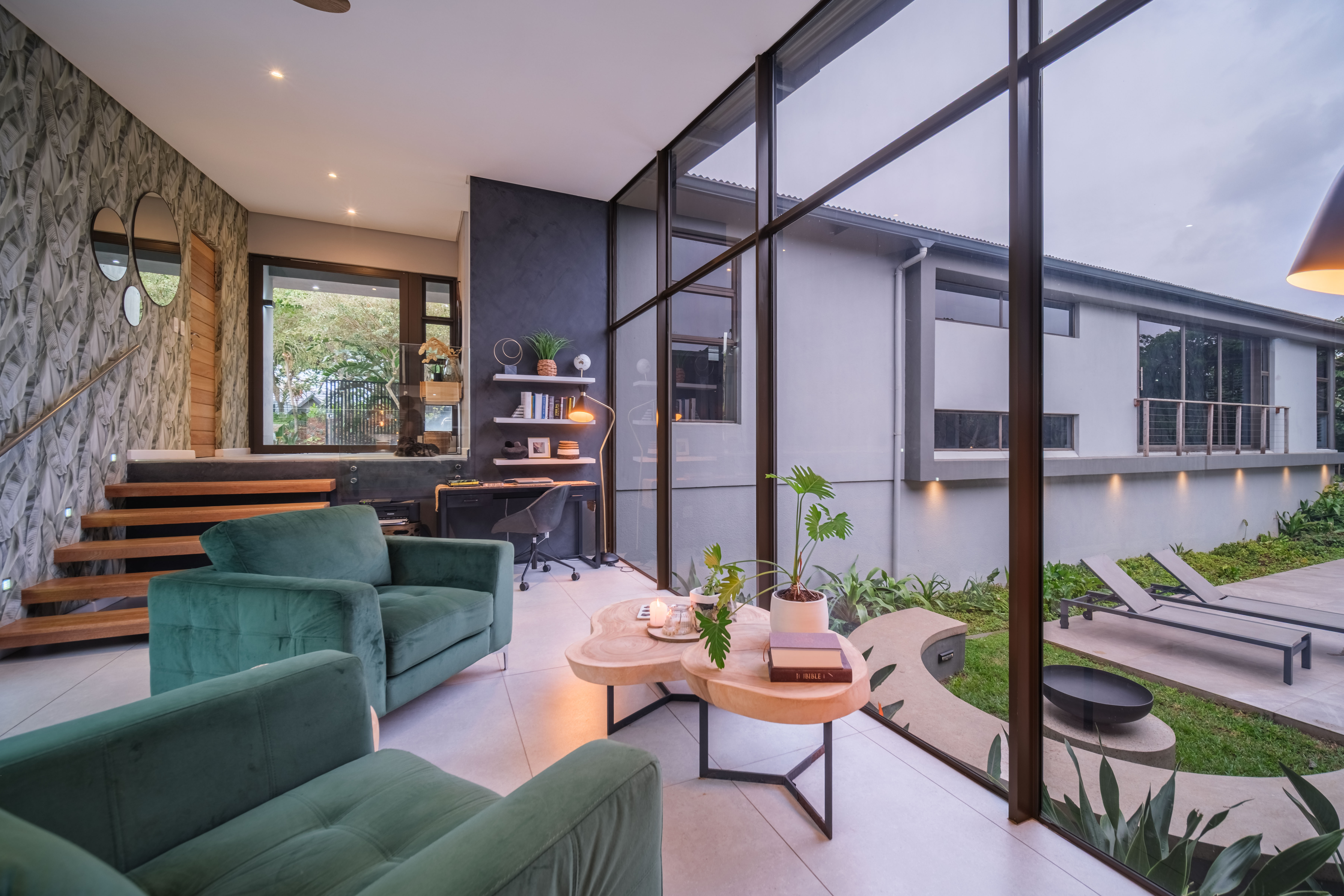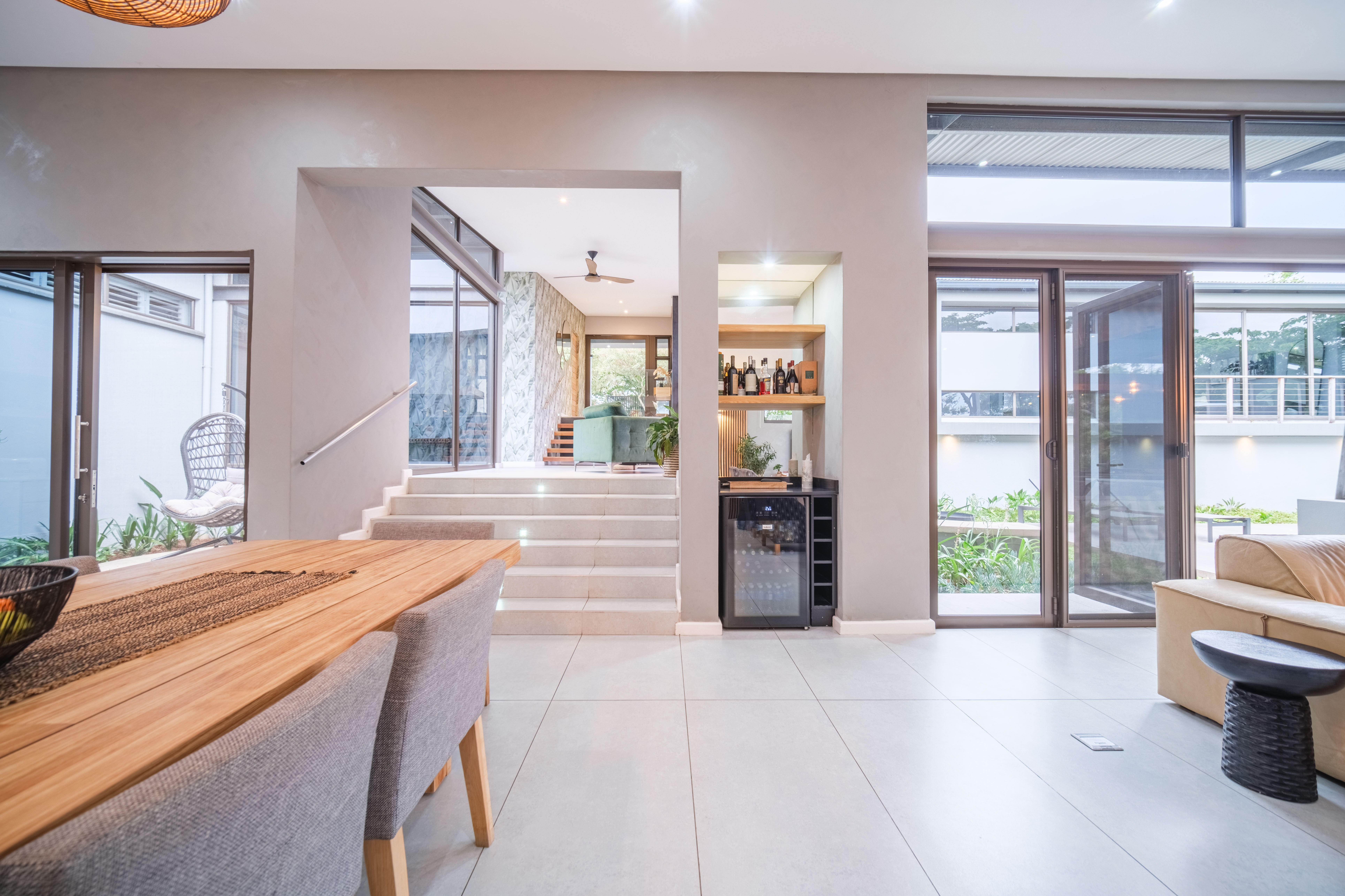 Experience the epitome of coastal luxury in this exquisite Simbithi Eco Estate home, where open-plan living meets modern elegance. The expansive living area flows effortlessly through large glass sliders onto a stunning entertainment space featuring a sparkling pool, fire pit, and braai area—perfect for relaxed afternoons or elegant evening gatherings. Every element has been designed for comfort and style, creating an inviting atmosphere ideal for both family living and entertaining guests.
