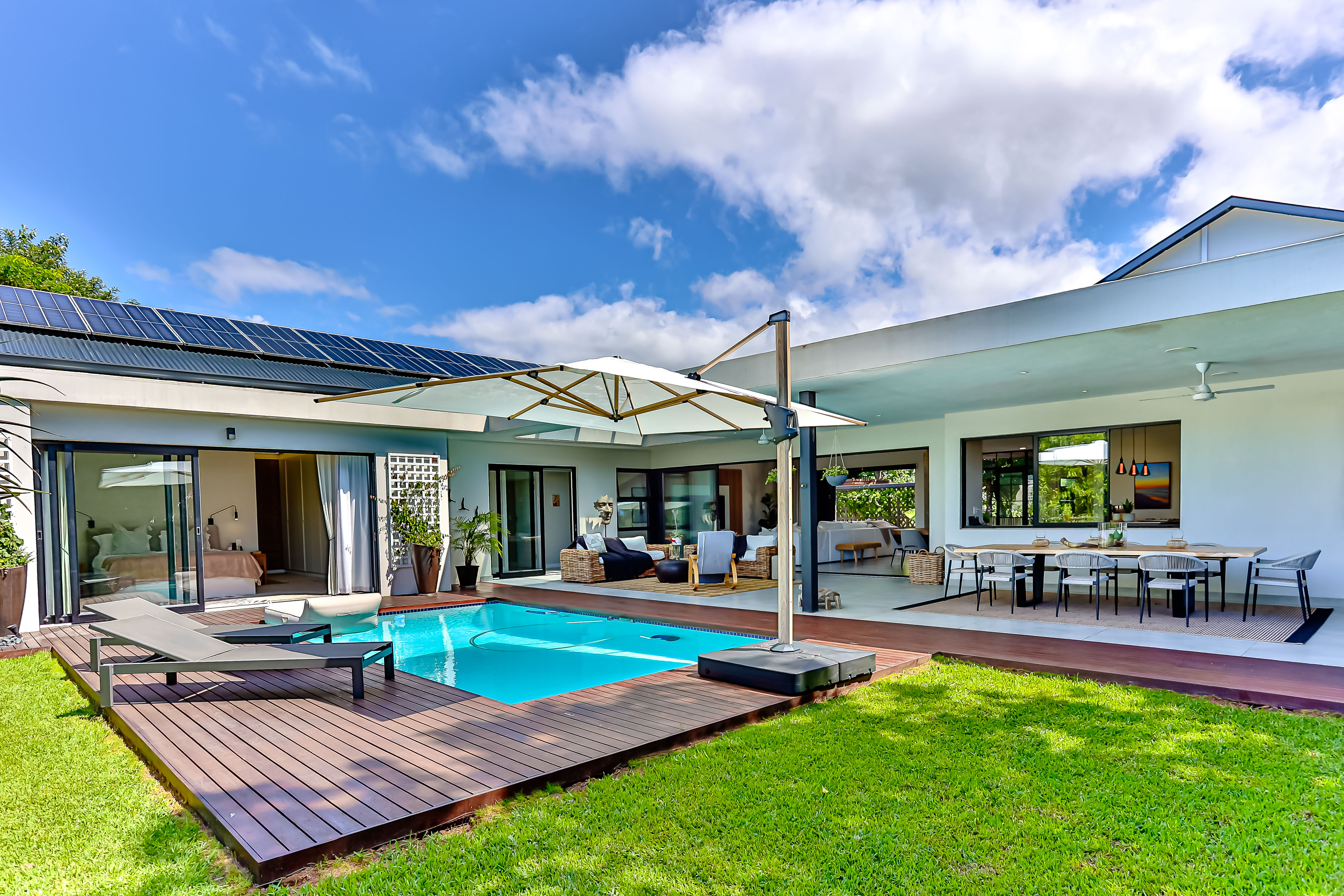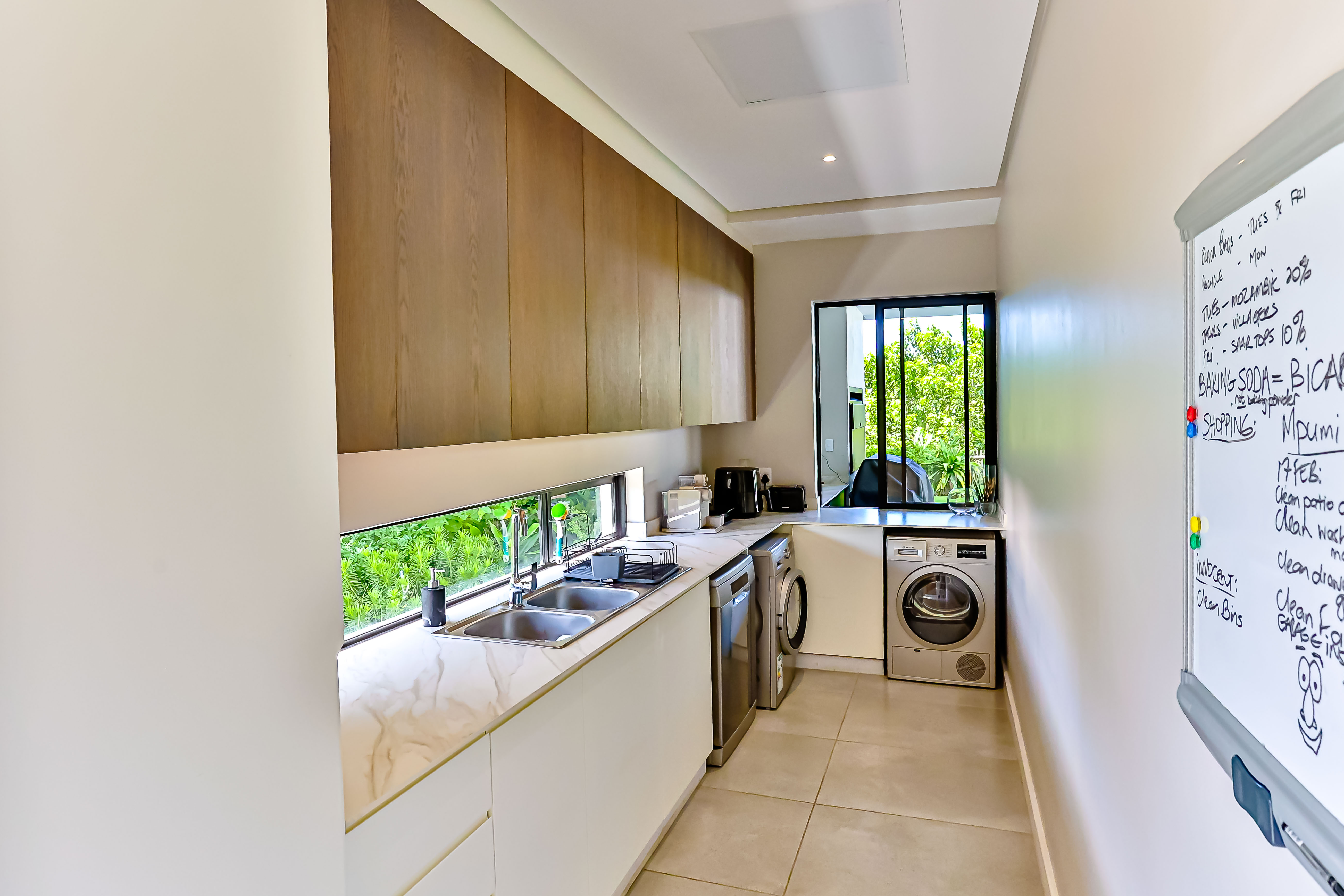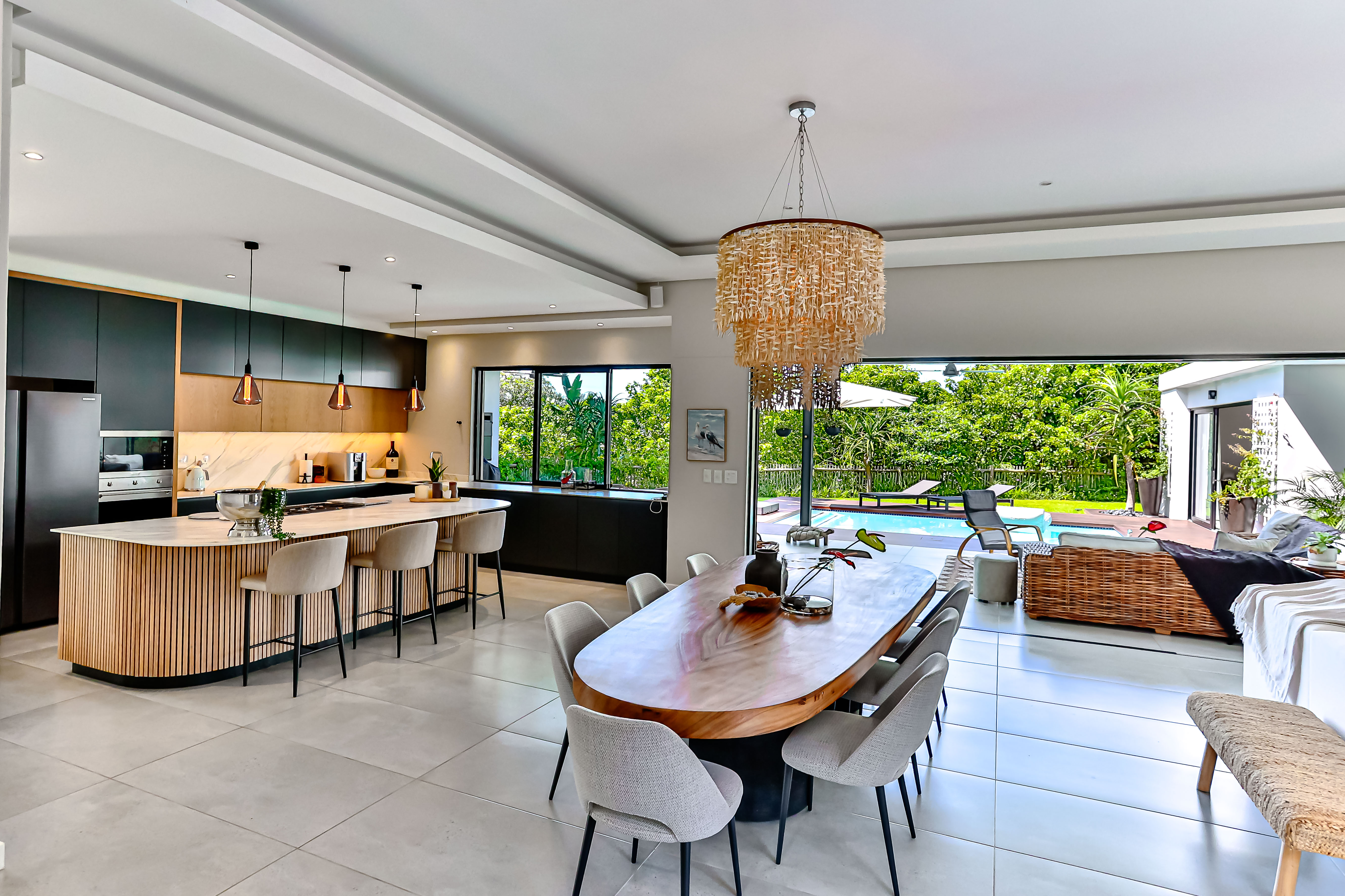 Designed for seamless indoor-outdoor living, the expansive open-plan living area flows effortlessly onto a covered patio, where an inviting outdoor lounge and dining space—complete with a built-in braai—overlook a shimmering swimming pool. This idyllic space is perfect for entertaining or unwinding in peaceful solitude.