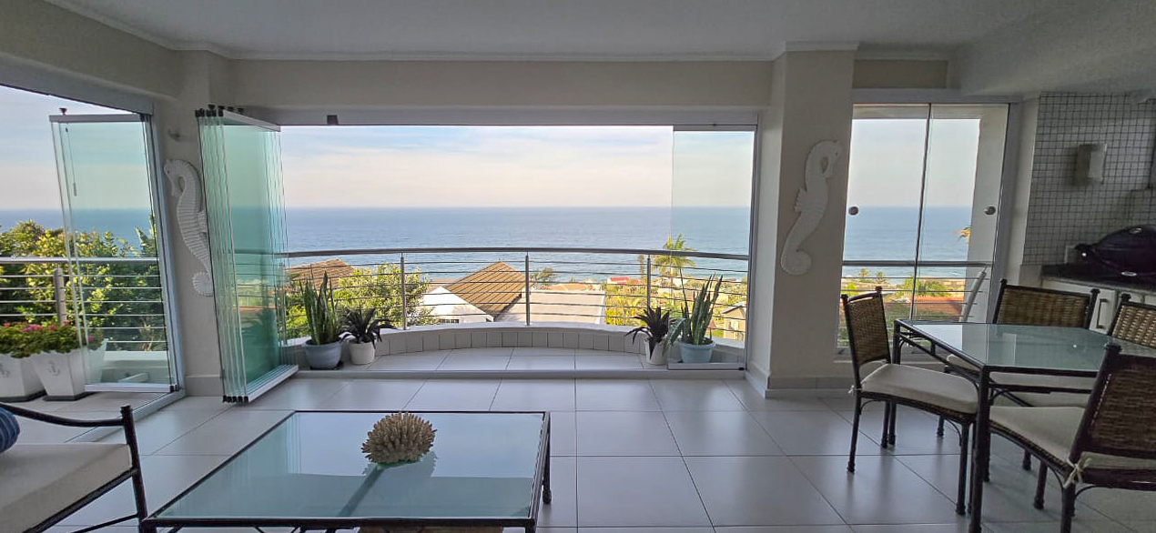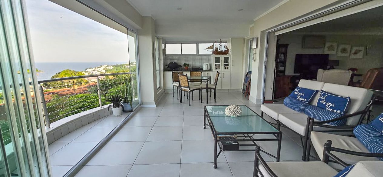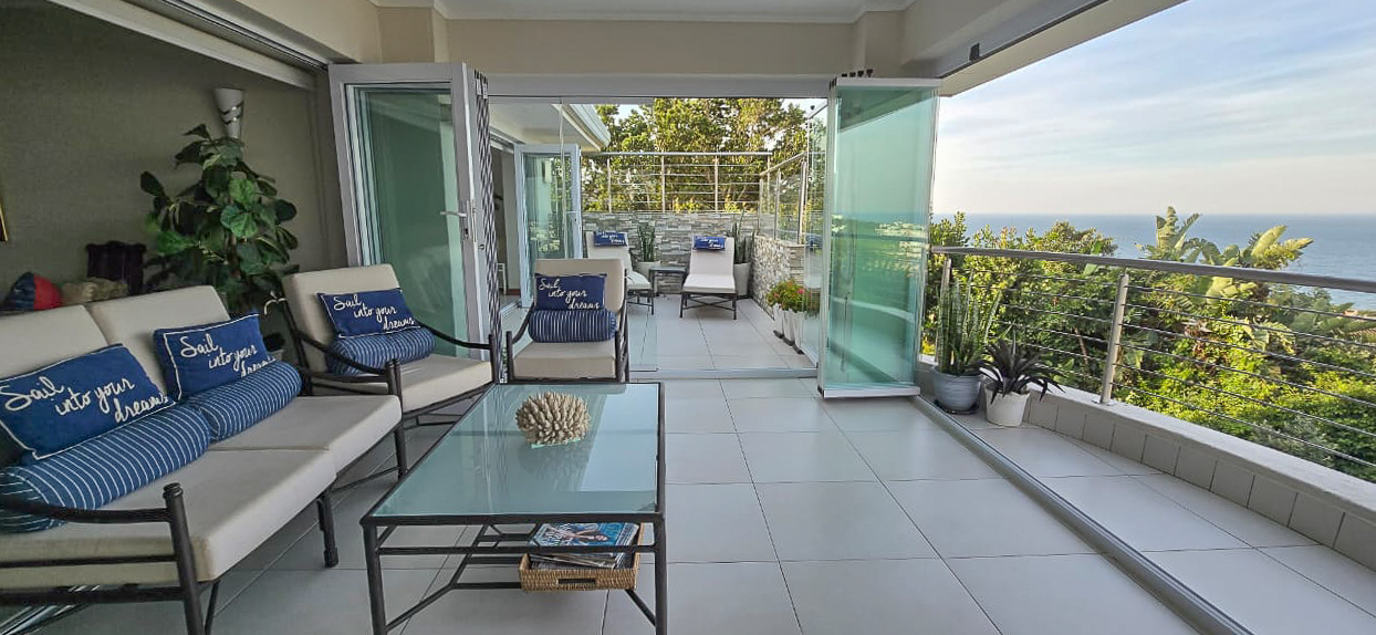 The sunlit open-plan living area transitions effortlessly onto a glass-enclosed verandah through expansive stack-back doors, creating a versatile space that blends indoor comfort with outdoor beauty. This enclosed veranda currently serves as a casual lounge and dining area, complete with a built-in serving counter, where you can relax and dine while gazing at the magnificent ocean beyond. From here, another set of glass doors opens onto a sun-soaked patio, offering the perfect spot for al fresco enjoyment. Designed for year-round use, the glass enclosure ensures comfort even during unpredictable coastal weather.