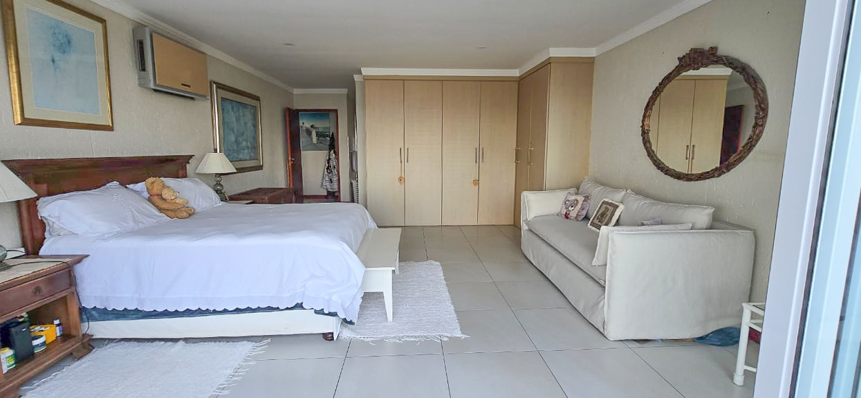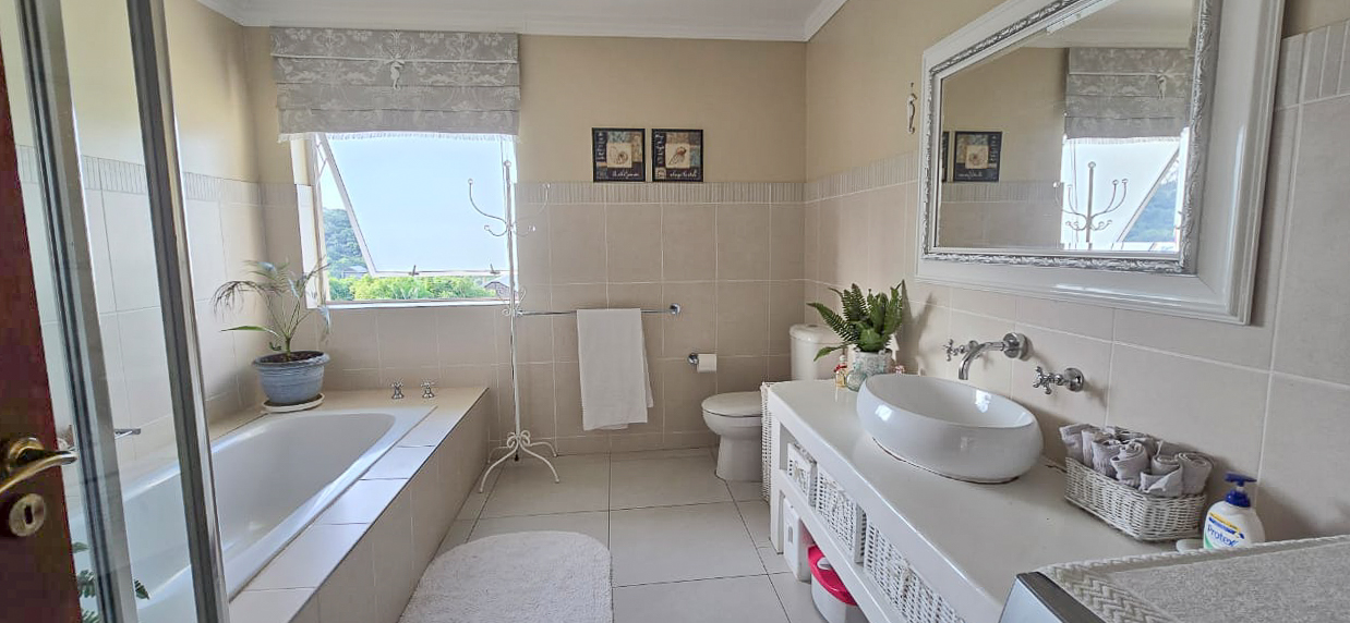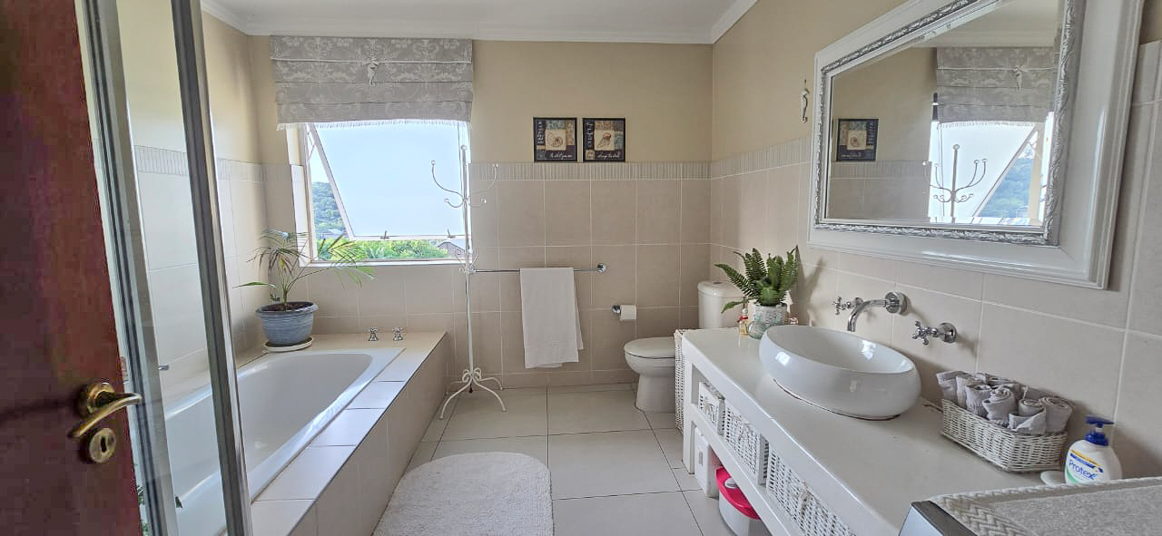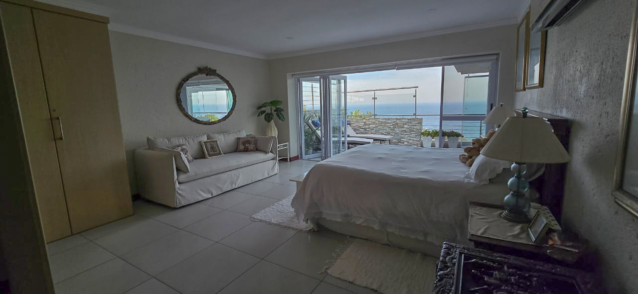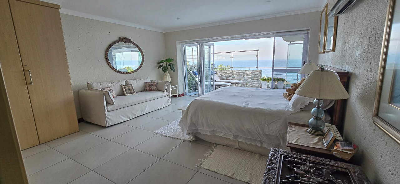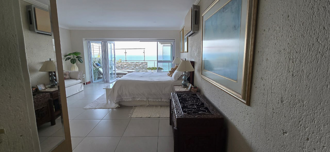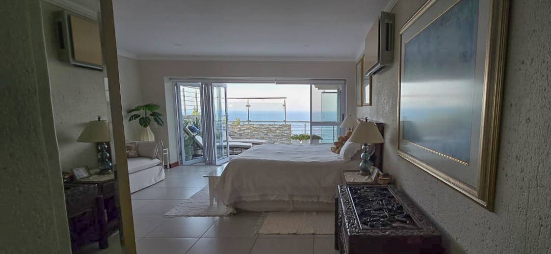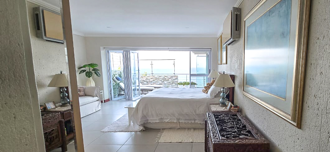 Accommodation comprises three generously proportioned bedrooms. The master suite is a true sanctuary, facing the sea and opening directly onto the patio. It features abundant cupboard space and a luxurious full en-suite bathroom with double vanities. The two additional bedrooms are equally spacious and share a striking, beautifully finished full bathroom.