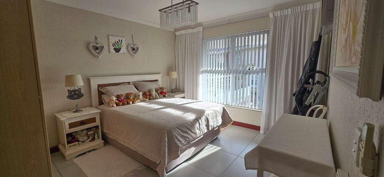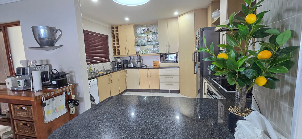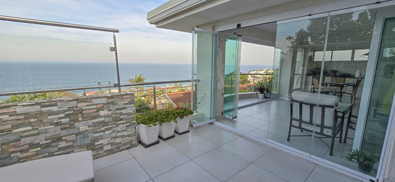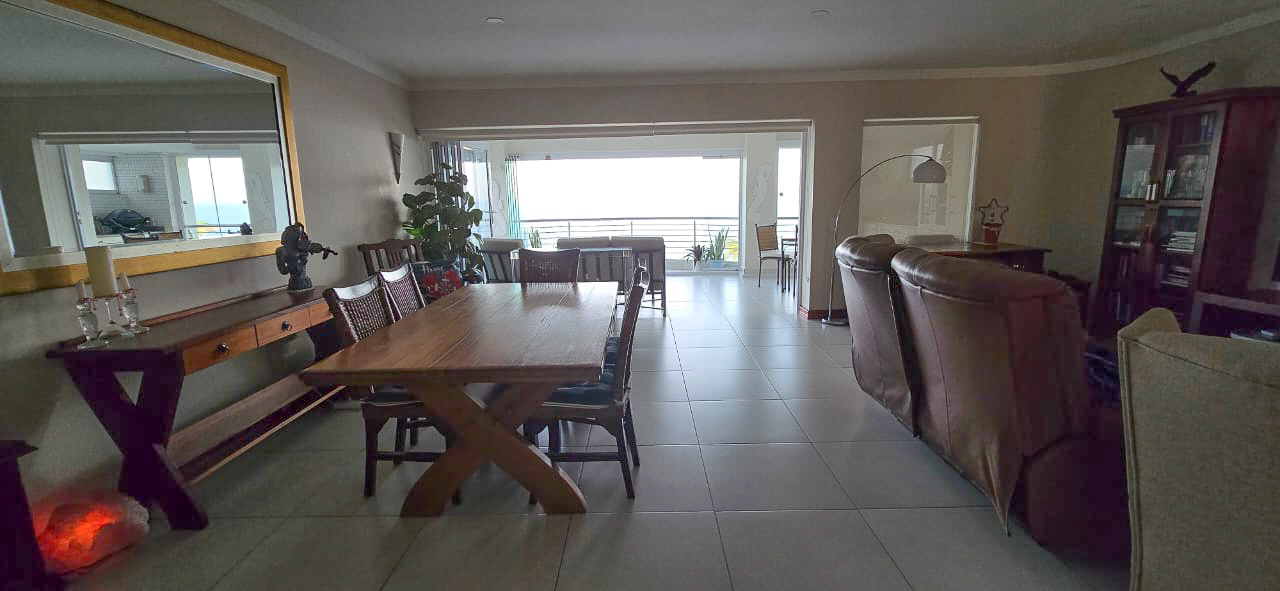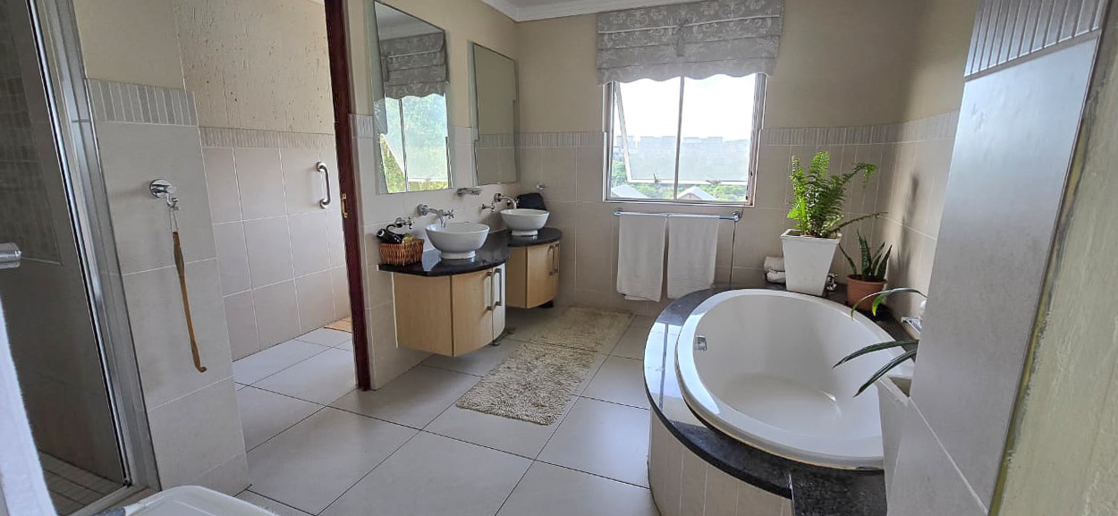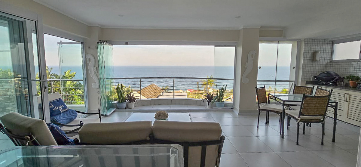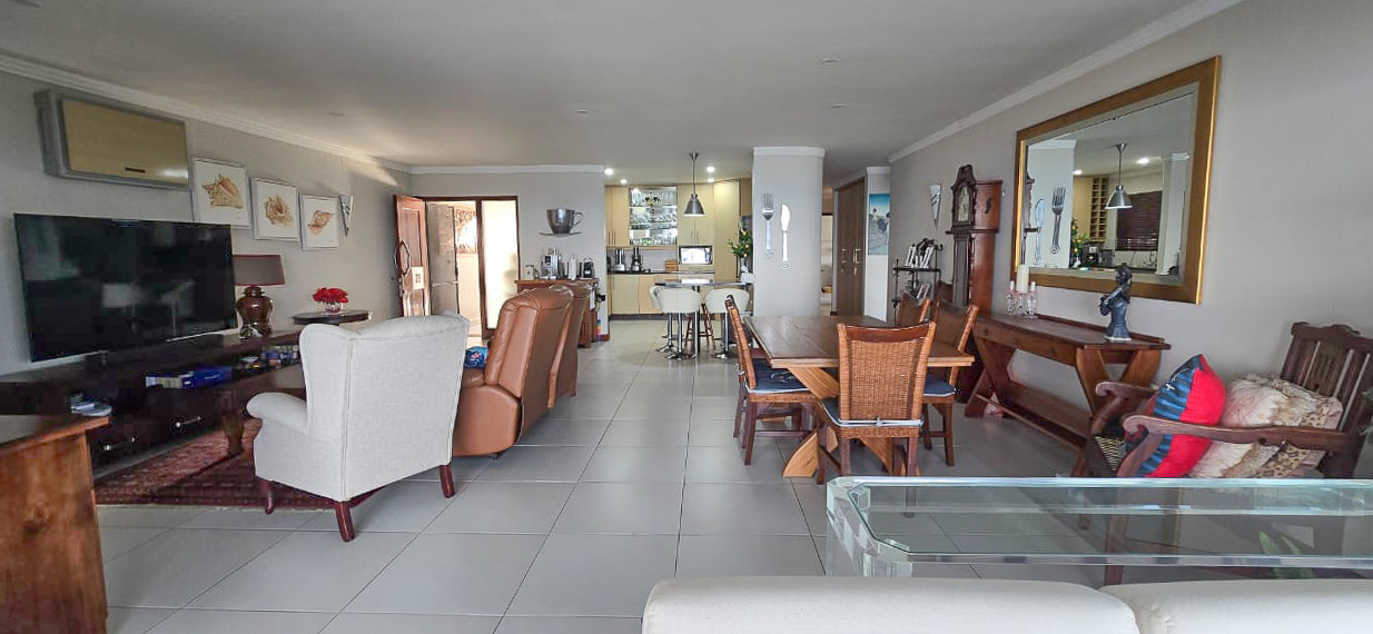 Accommodation comprises three generously proportioned bedrooms. The master suite is a true sanctuary, facing the sea and opening directly onto the patio. It features abundant cupboard space and a luxurious full en-suite bathroom with double vanities. The two additional bedrooms are equally spacious and share a striking, beautifully finished full bathroom.