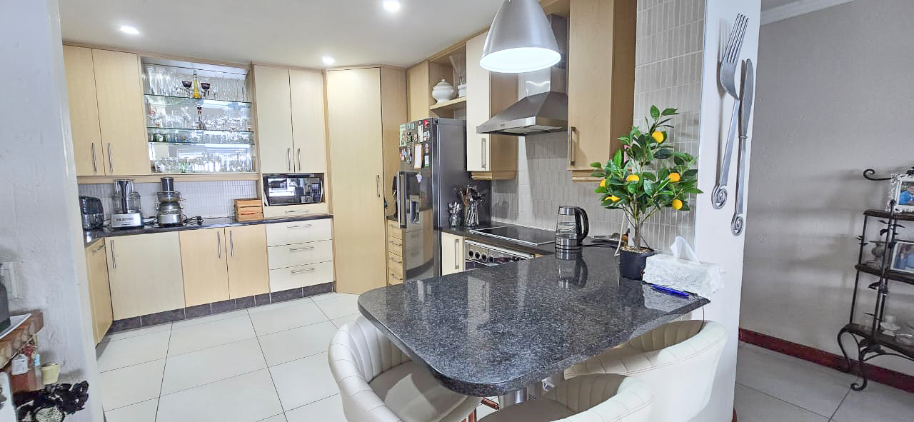 Just off the dining space lies a sleek, contemporary kitchen, thoughtfully appointed with a stylish glass display cabinet, ample cupboard space, and a practical breakfast counter, making everyday living as effortless as it is refined.