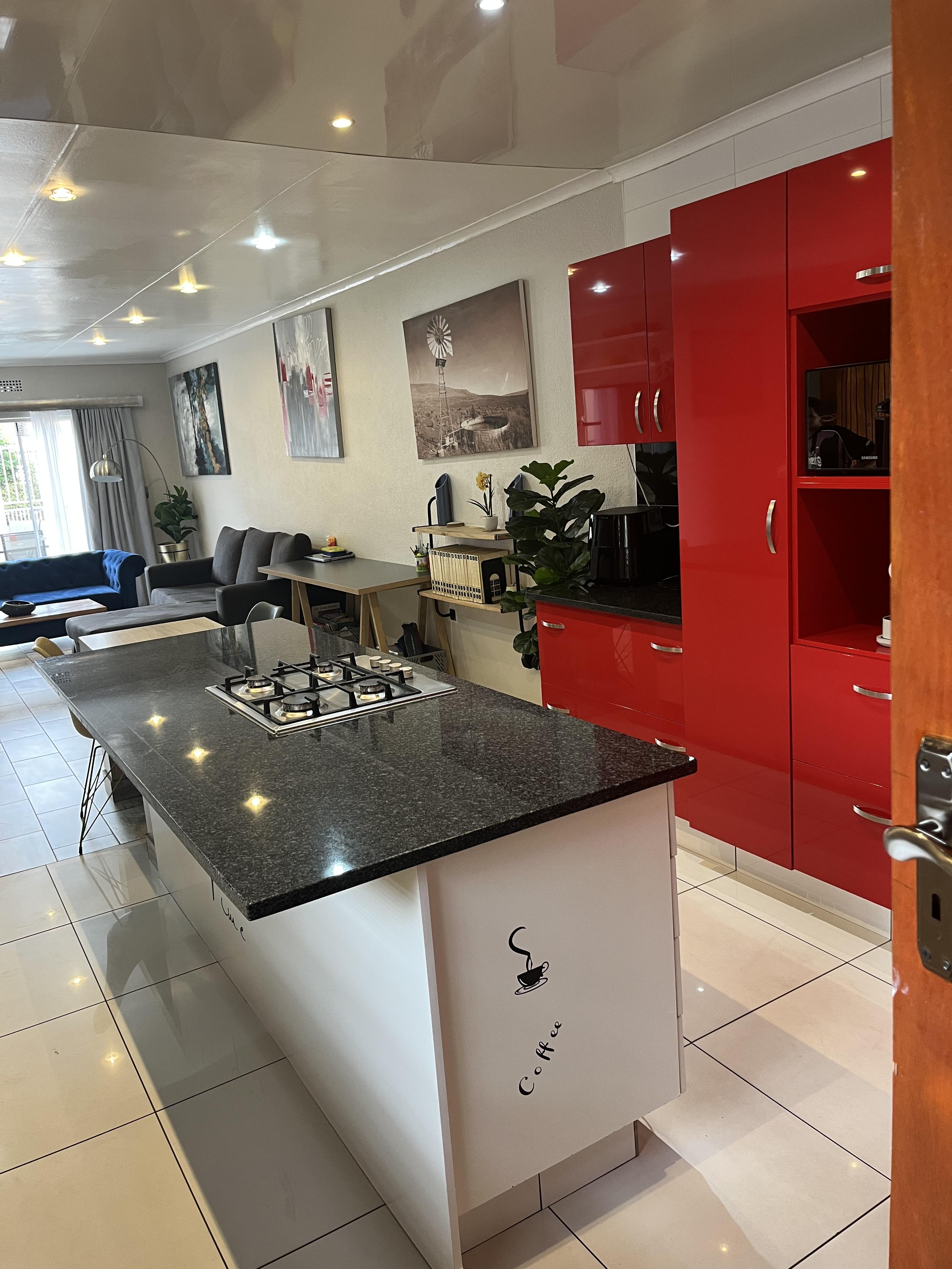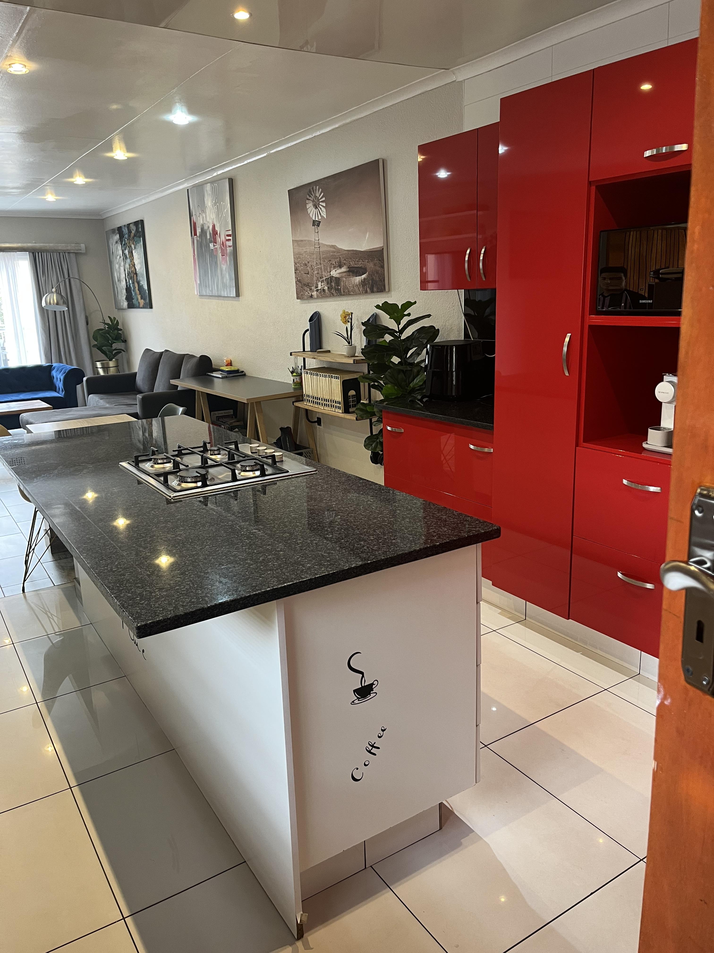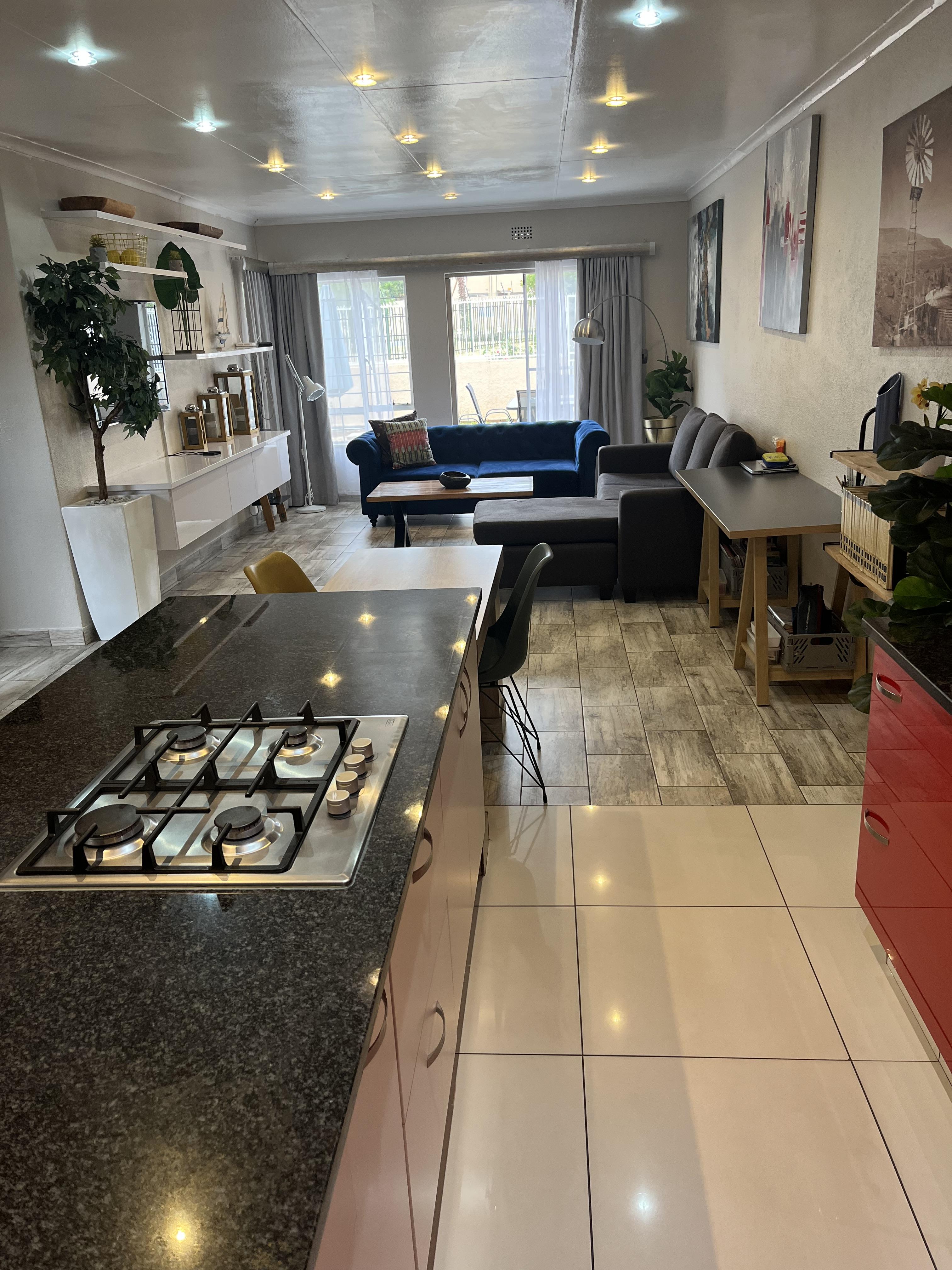Walk into a massive, well-fitted, luxurious kitchen with a gas stove, granite tops, and an island. Open-plan lounge and dining room leading onto the Luscious green landscaped garden.