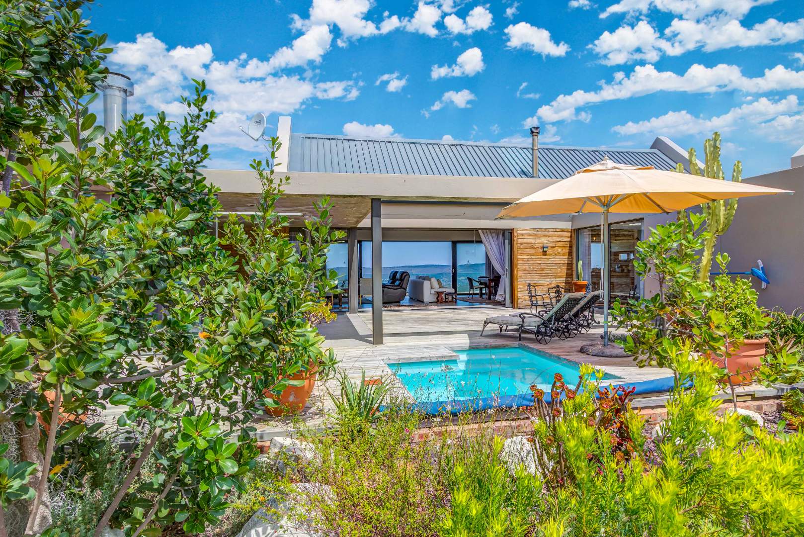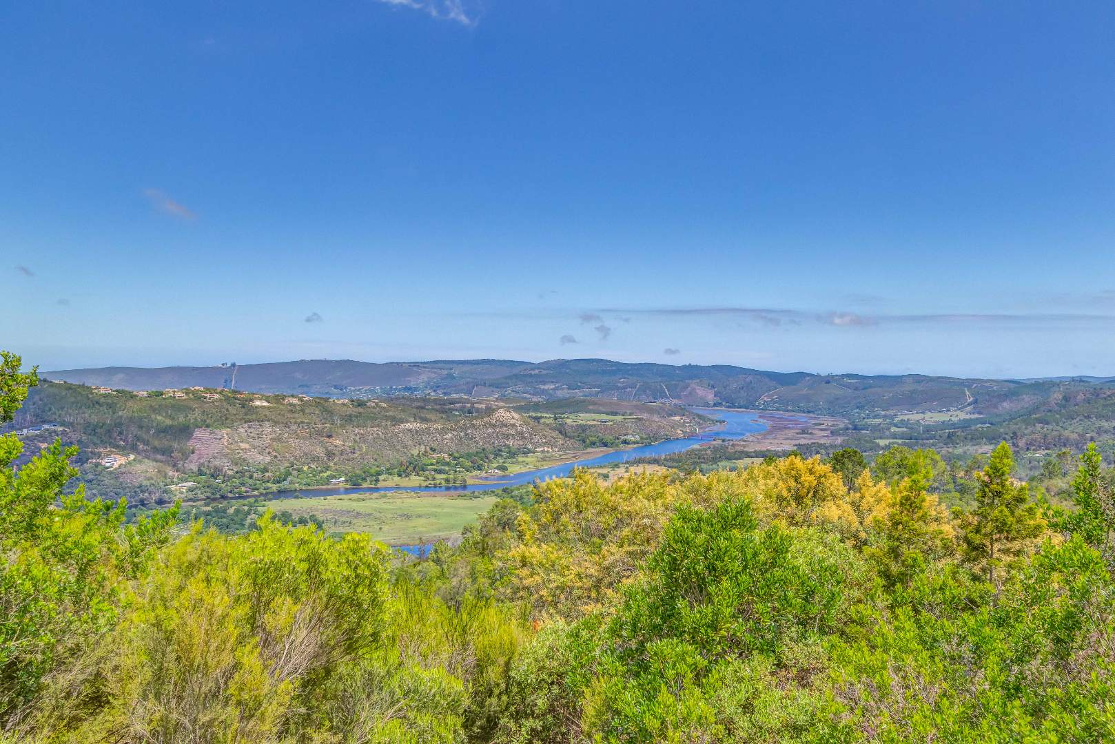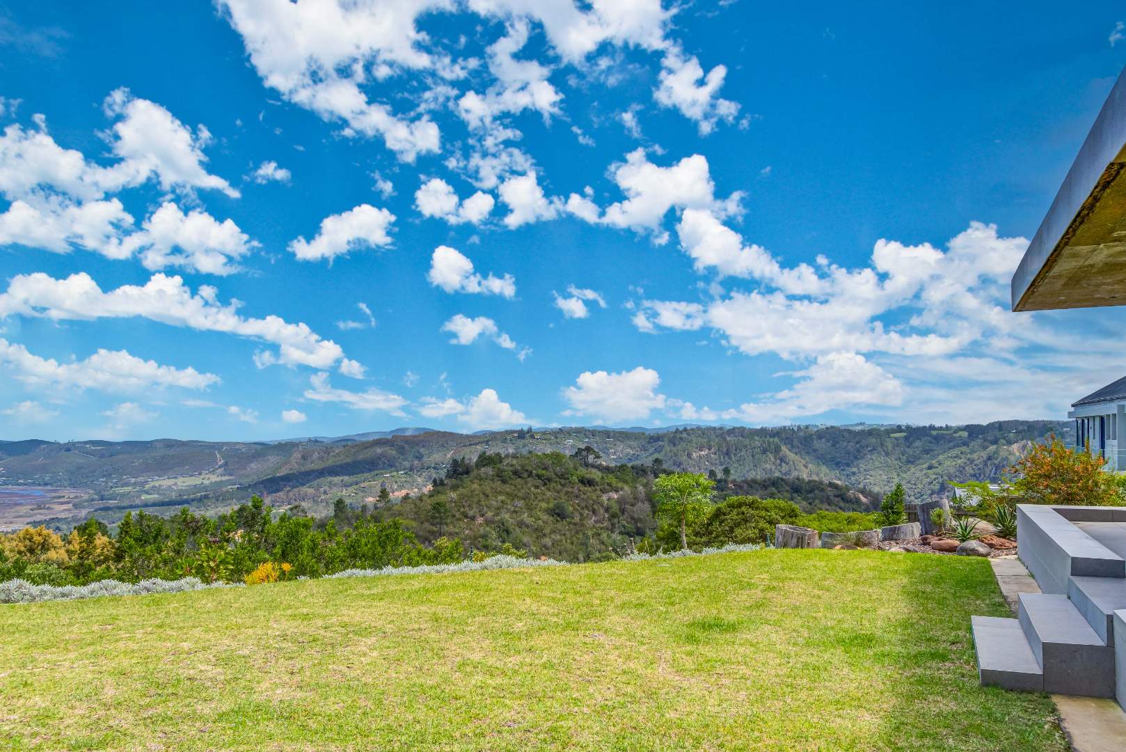 High above the ravines of Simola, with sweeping views tracing the Knysna River toward the distant hint of the Knysna Heads, this owner-built industrial farmhouse carries both strength and soul.