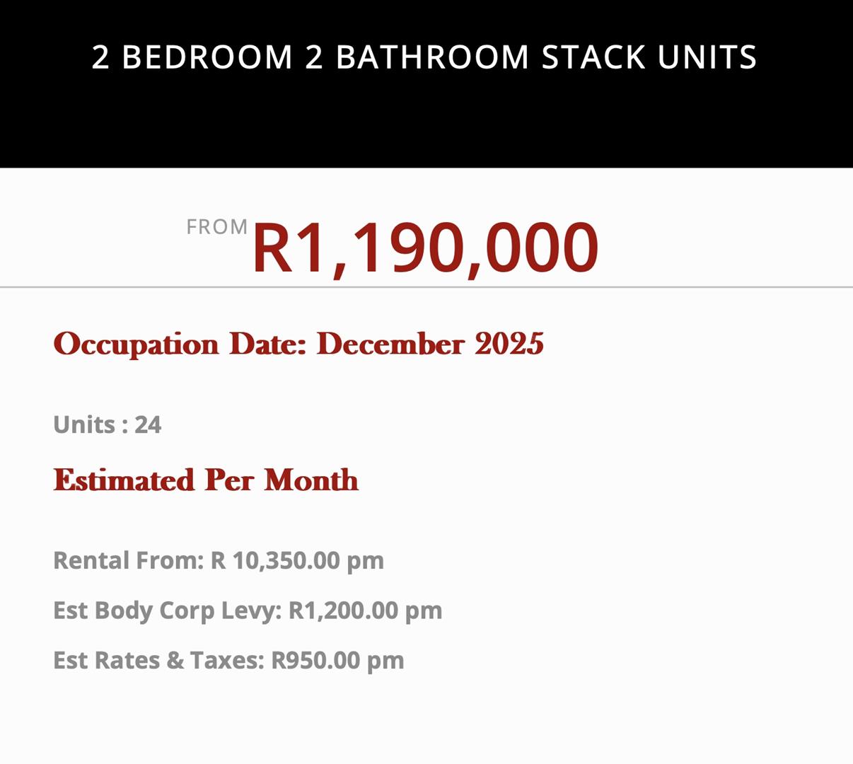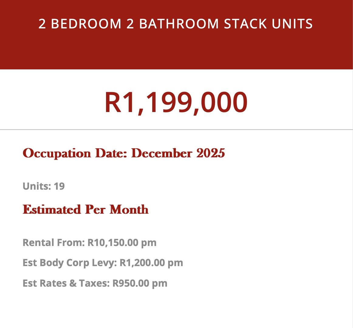 Step into comfort and convenience with these stylish 2-bedroom, 2-bathroom North/South-facing stack units, perfectly priced from only R1,190,000. Whether you’re a first-time buyer, savvy investor, or looking to downscale, these modern homes offer unbeatable value and a prime location.