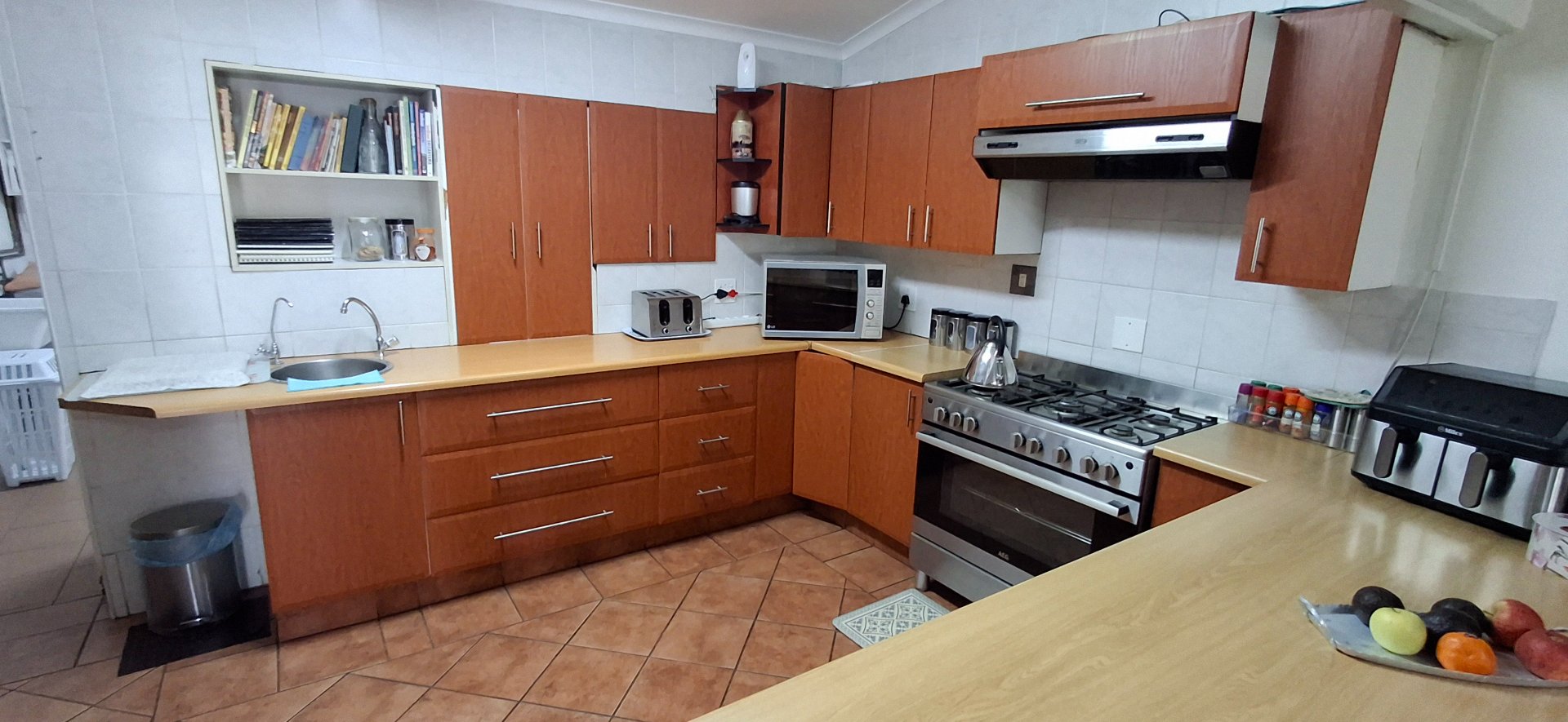 - A sleek and modern kitchen with ample cupboards, breakfast nook, 5-plate gas hob, and gas oven, perfect for culinary enthusiasts