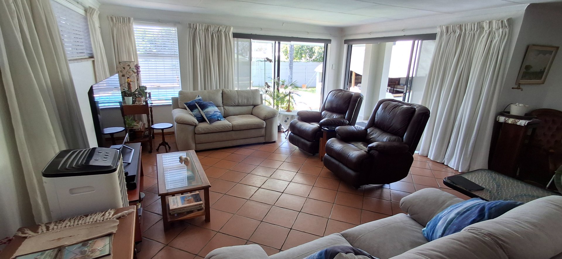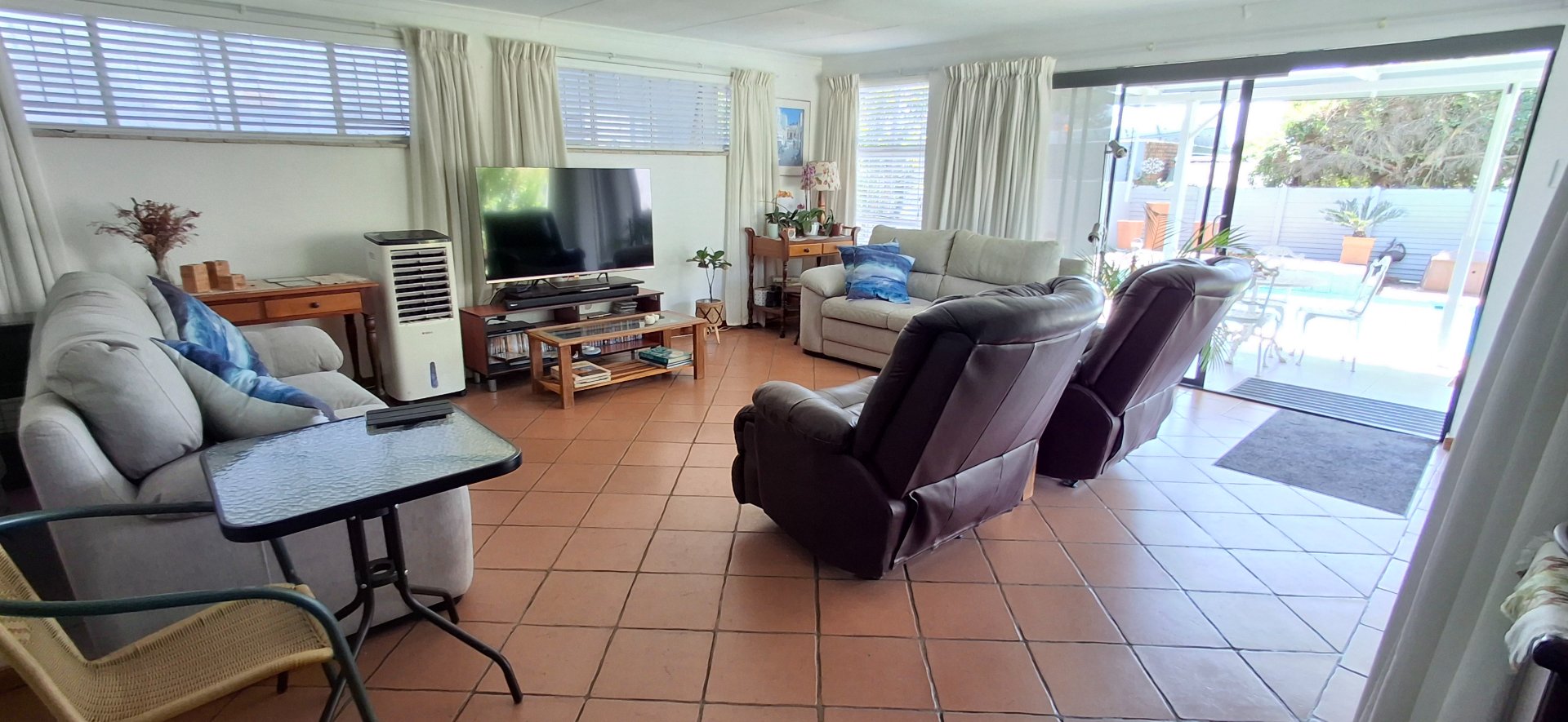 - Two expansive living areas with modern aluminium sliding doors, seamlessly connecting to a patio with a louvre roof, overlooking the sparkling swimming pool and beautiful, established garden.