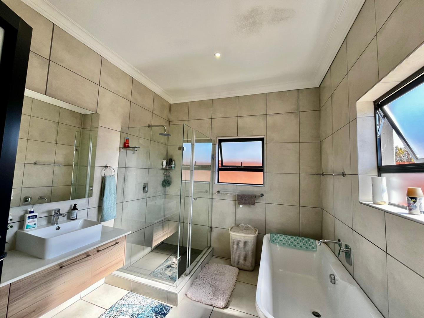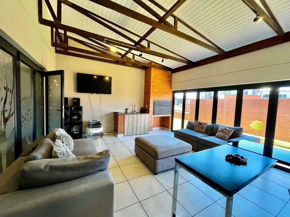 Step out onto the enclosed patio, where large sliding doors open up to reveal a lush garden, infusing the space with natural light and serenity. This versatile area, complete with a built-in sink and braai, can also serve as an ideal study or home office.