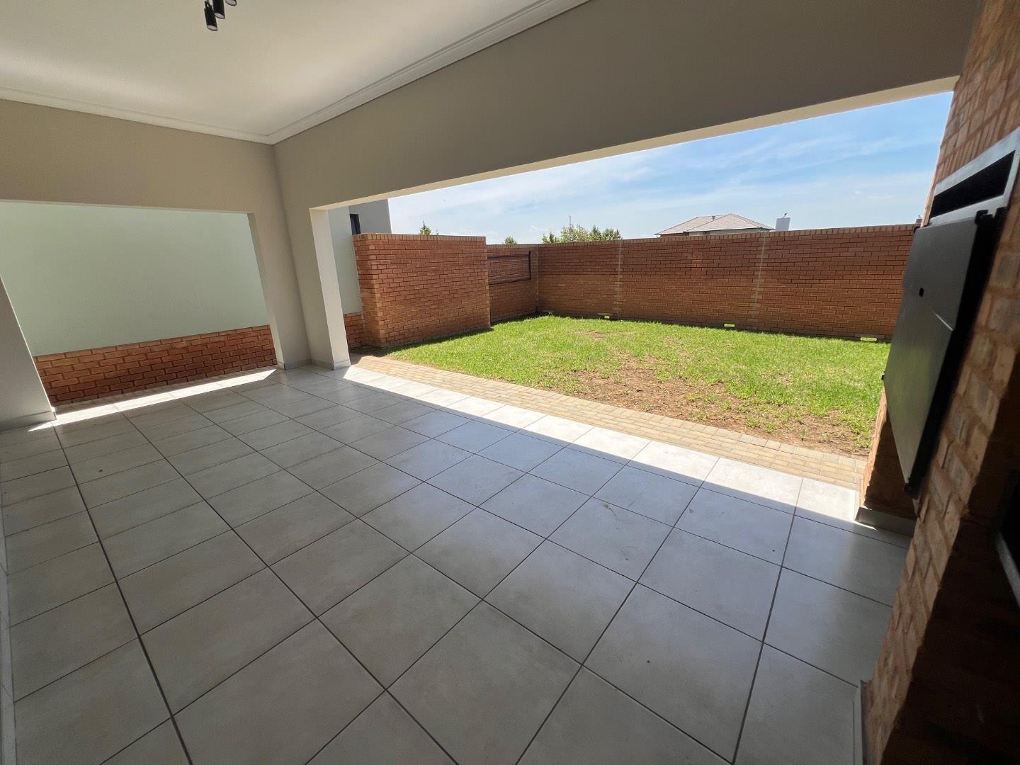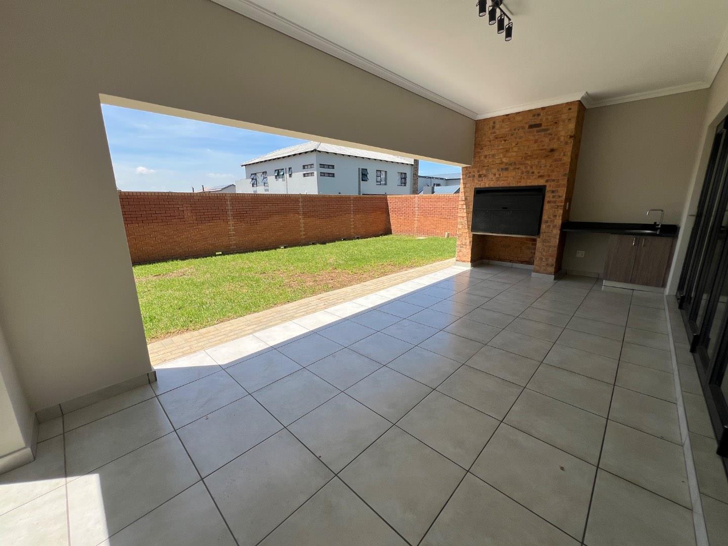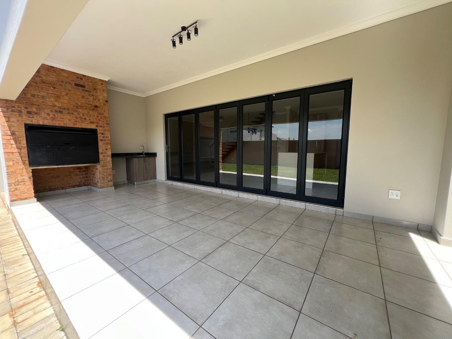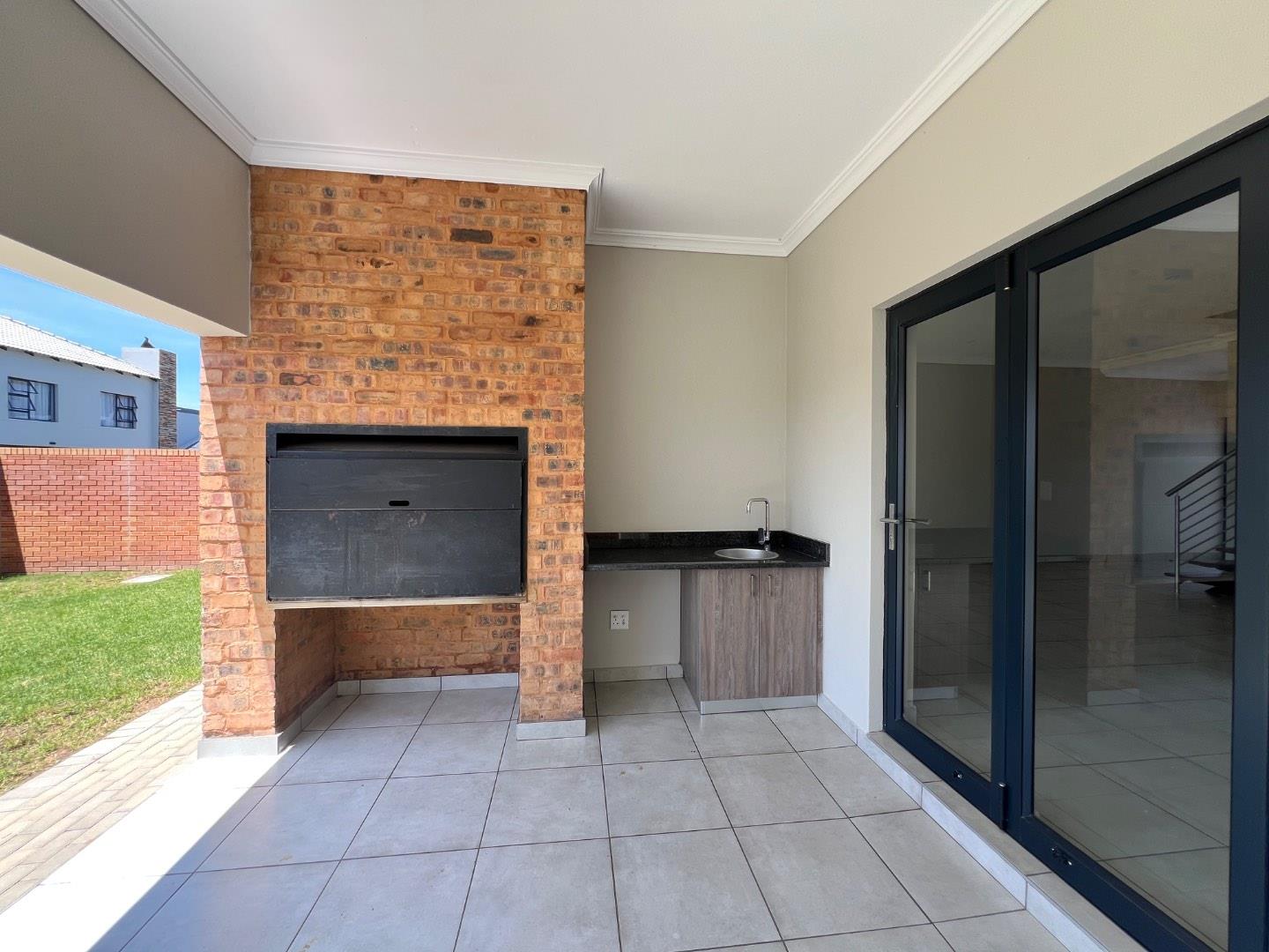 A covered patio with a built-in braai and basin creates the perfect outdoor entertainment area.
