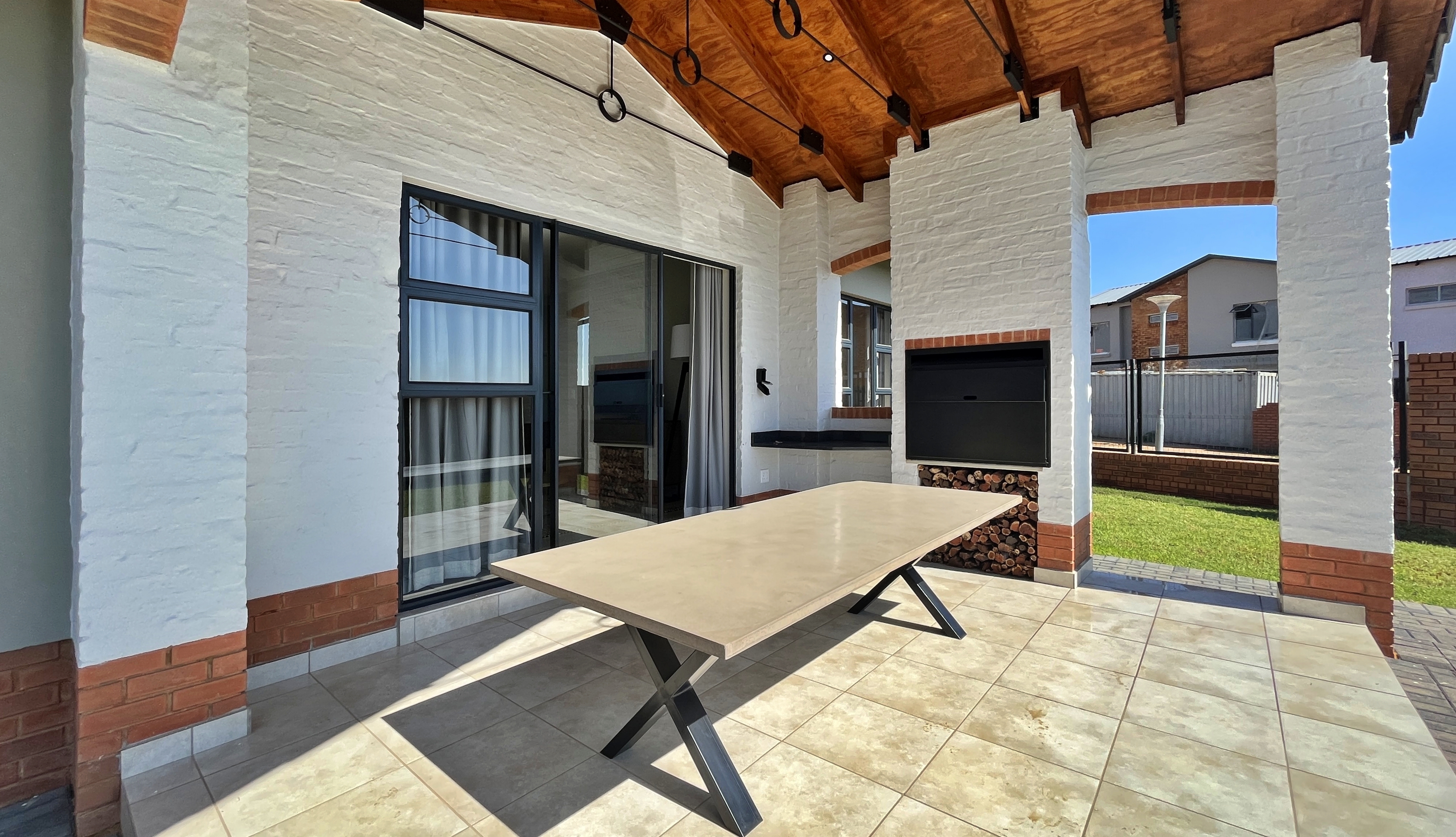 The lounge and dining area seamlessly connect to an undercover patio with built-in braai, perfect for entertaining.