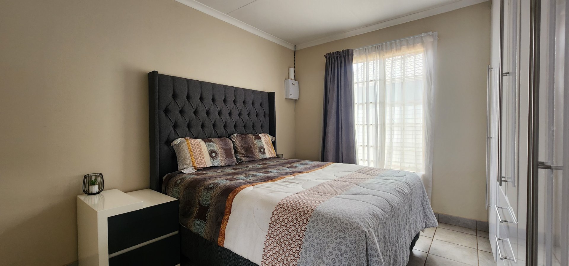 Nestled in a serene neighbourhood, this gorgeous 55m2 freestanding home with 2 Bedrooms and 2 Bathrooms boasts a decent land size of 150m2, with private walled pet friendly gardens. Upon entry, you are welcomed by a spacious open plan lounge and kitchen. The jaw-dropper remodelled open kitchen/living room plan is flawless for a buyer that is curious about what makes Sky City the supreme Alberton address. From the attractive lounge entrance to the bedrooms, this house is tiled throughout for a comfortable living offering you a lifestyle of peace and tranquillity. The main bedroom has an en-suite bathroom. Sky City Mall and Royal Schools are within your reach.