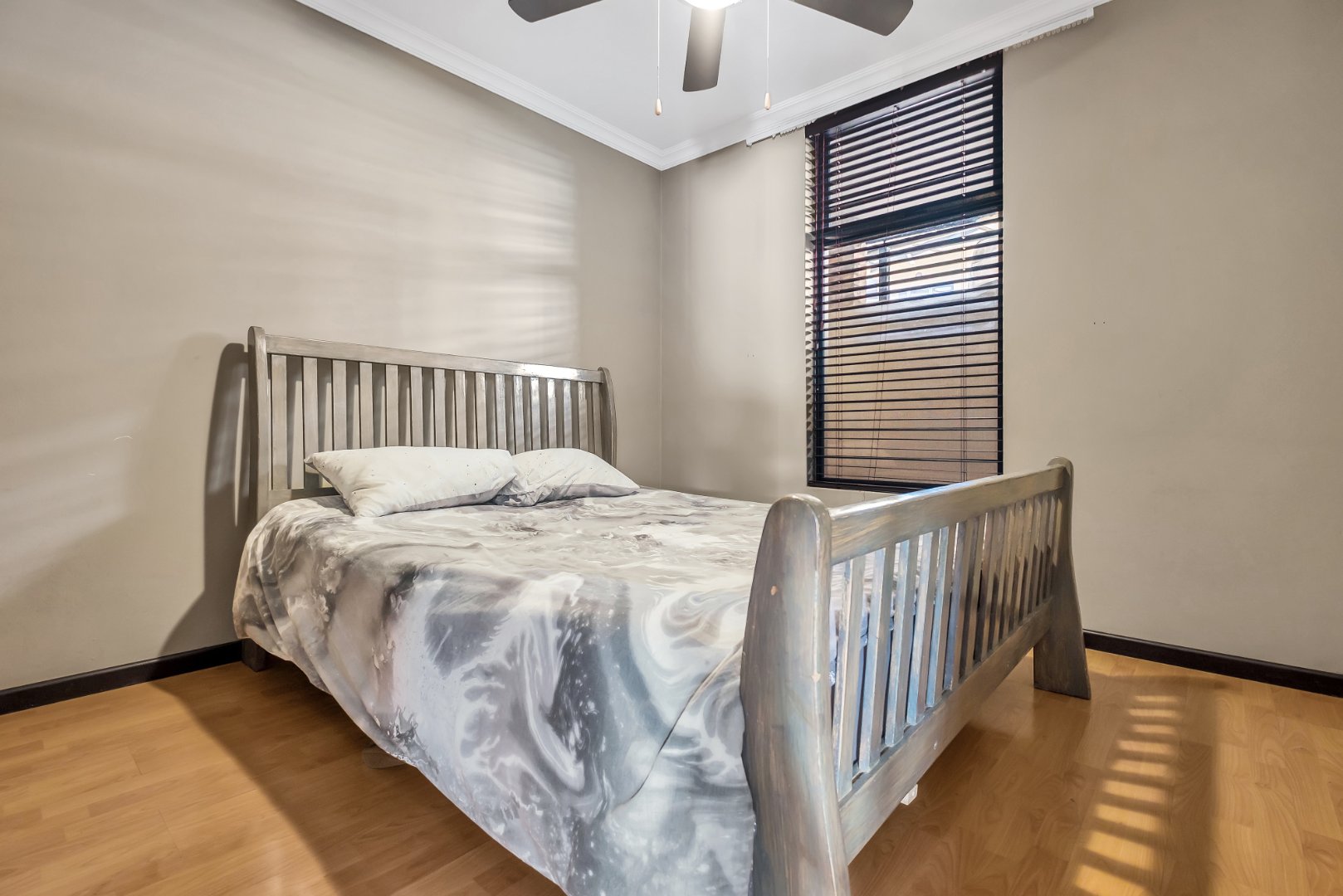 The main bedroom is well-sized, with a lovely view of the leafy garden and both bedrooms have loads of cupboard space and ceiling fans for year-round comfort. The Full bathroom has beautiful clean finishes with a modern tub and impressive separate shower.