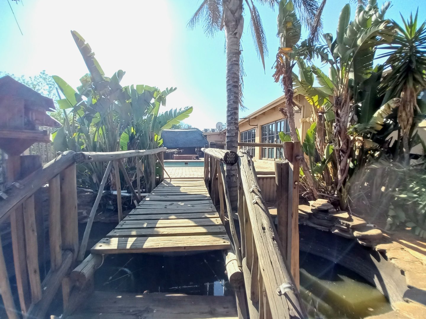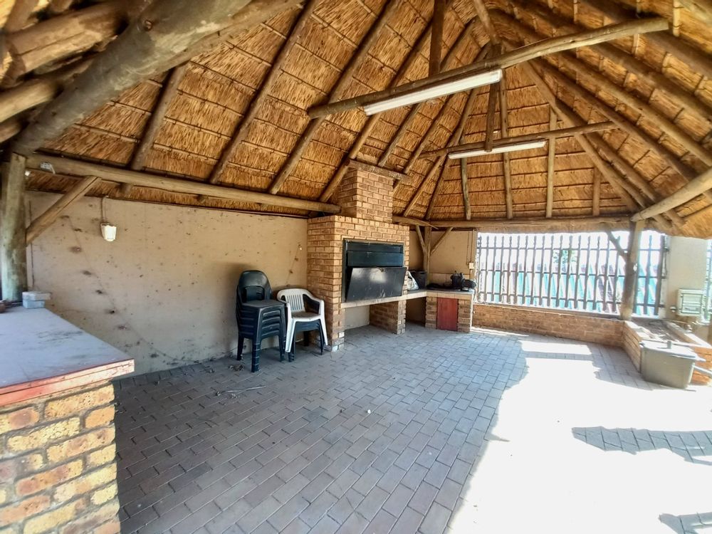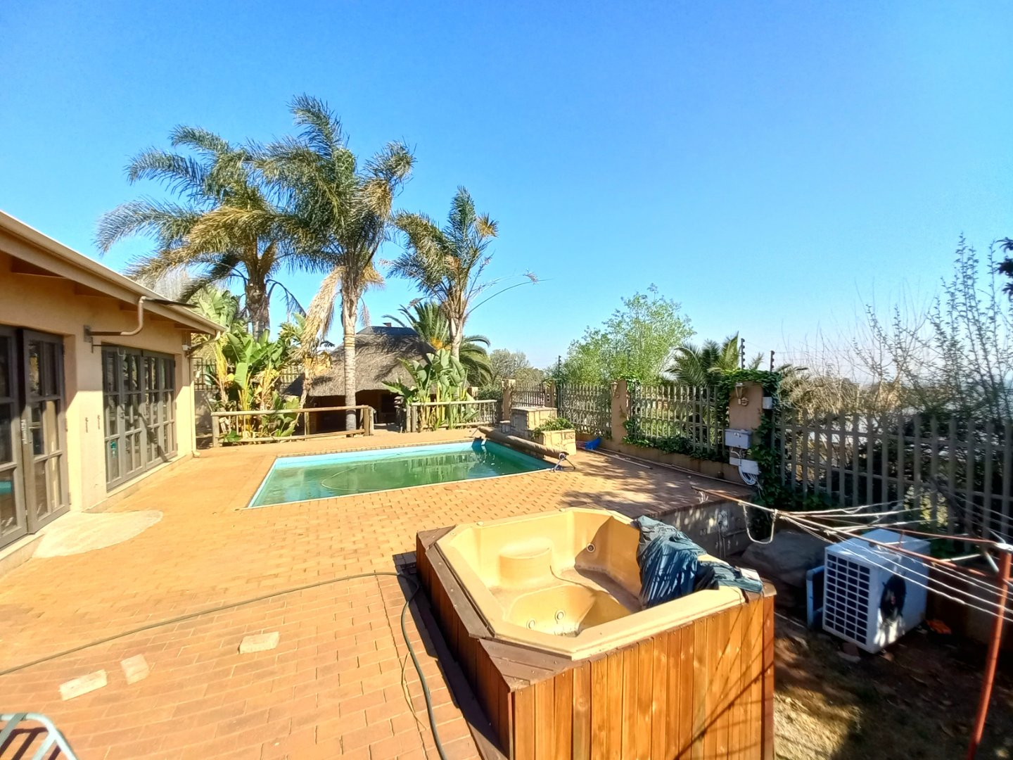 Outdoor thatched lapa with built-in braai, counter space, koi pond, swimming pool, and jacuzzi