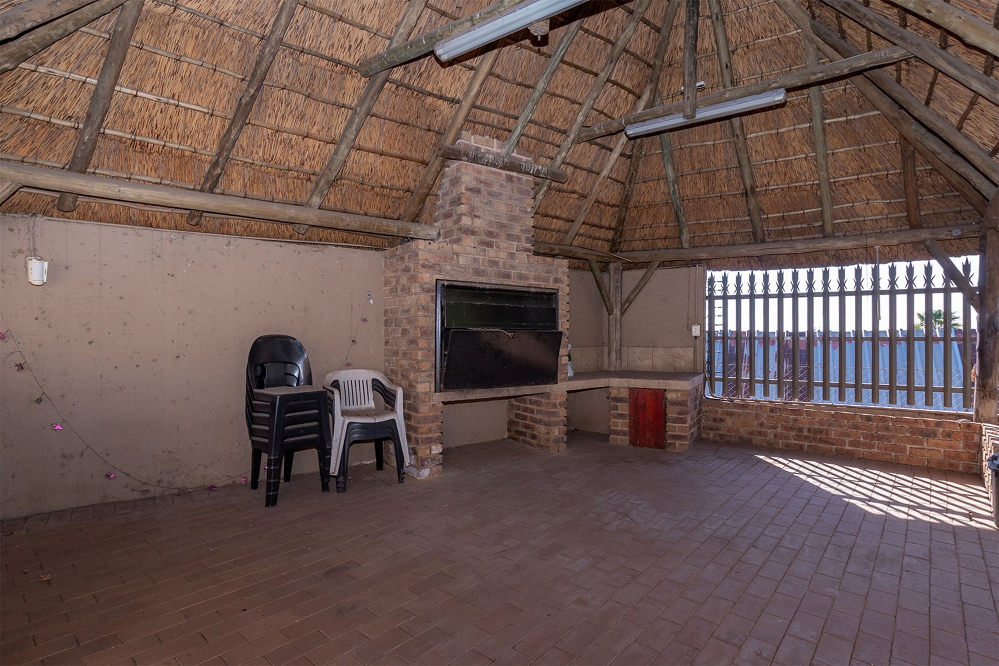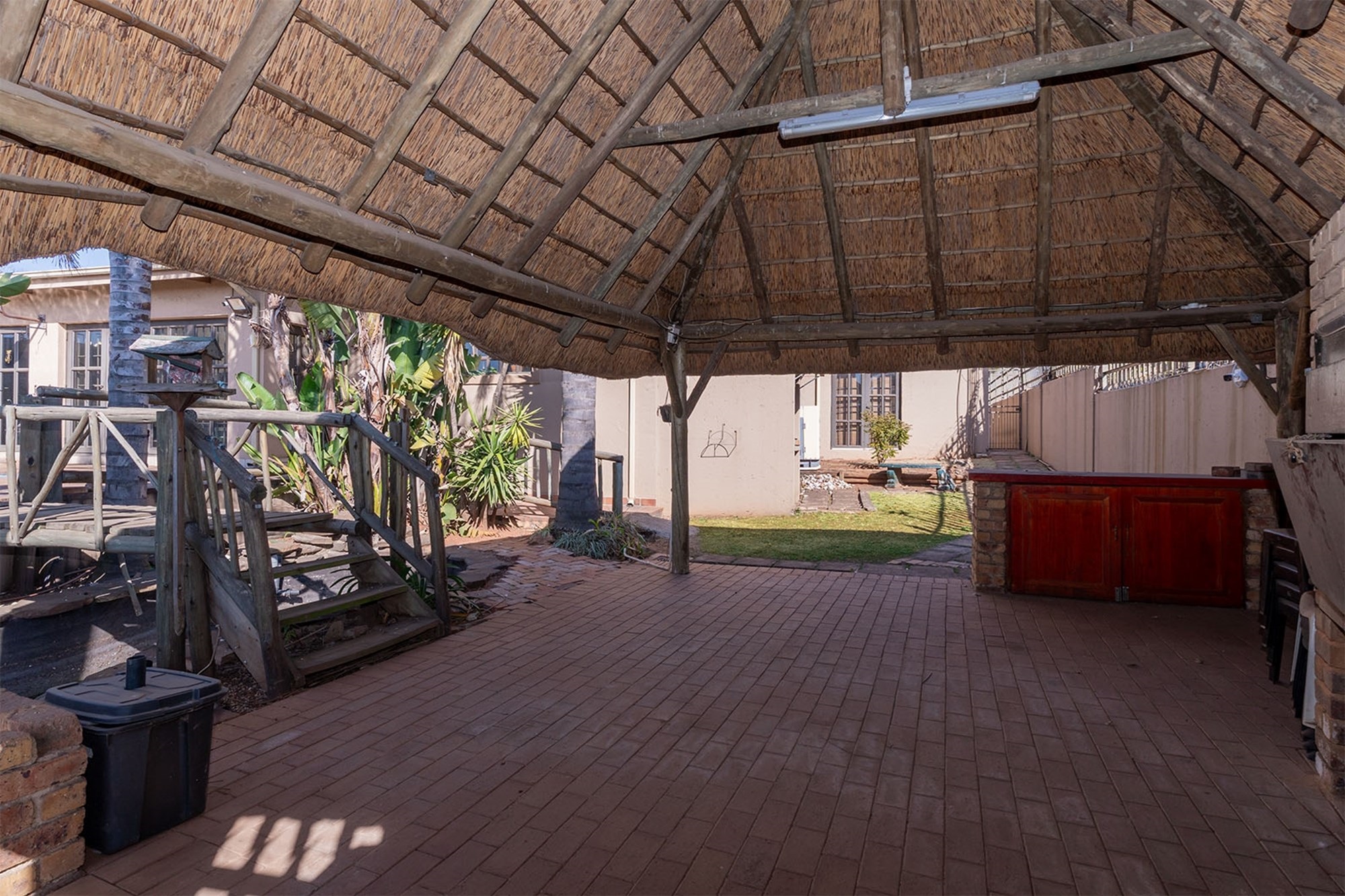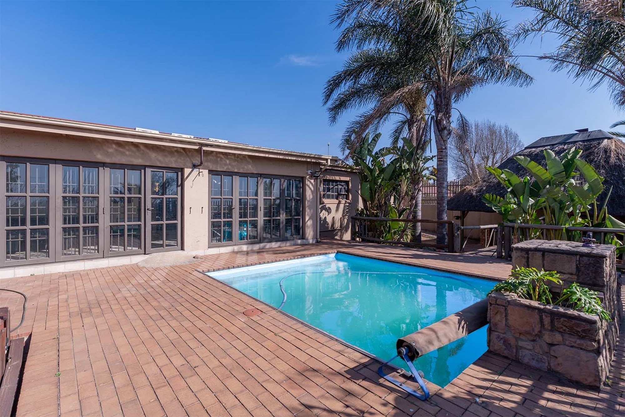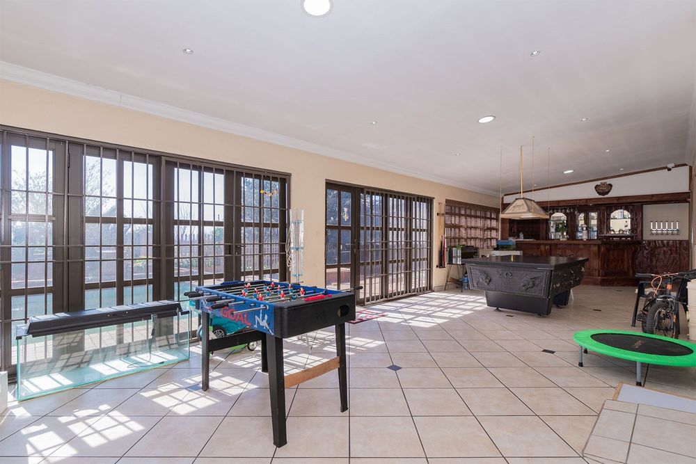 Entertainment extends outdoors with a heated swimming pool with cover, jacuzzi, and a thatched lapa featuring a built-in braai and pizza oven, ideal for family gatherings or entertaining friends. A tranquil fish pond adds a touch of serenity.