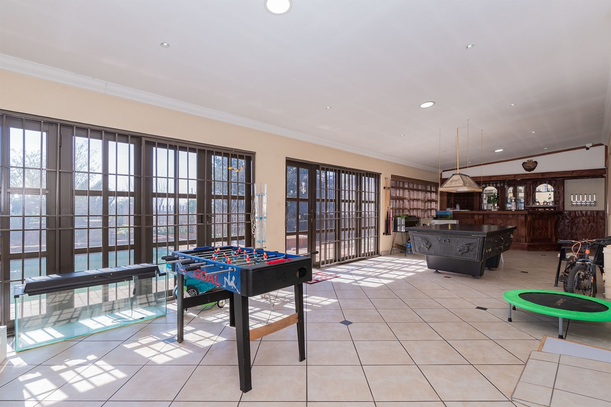 The main bedroom offers a luxurious ensuite with bath, shower, basin, toilet, dressing room, and direct access to the indoor entertainment area, which boasts a pub and pool table. The second bathroom is a full family bathroom.