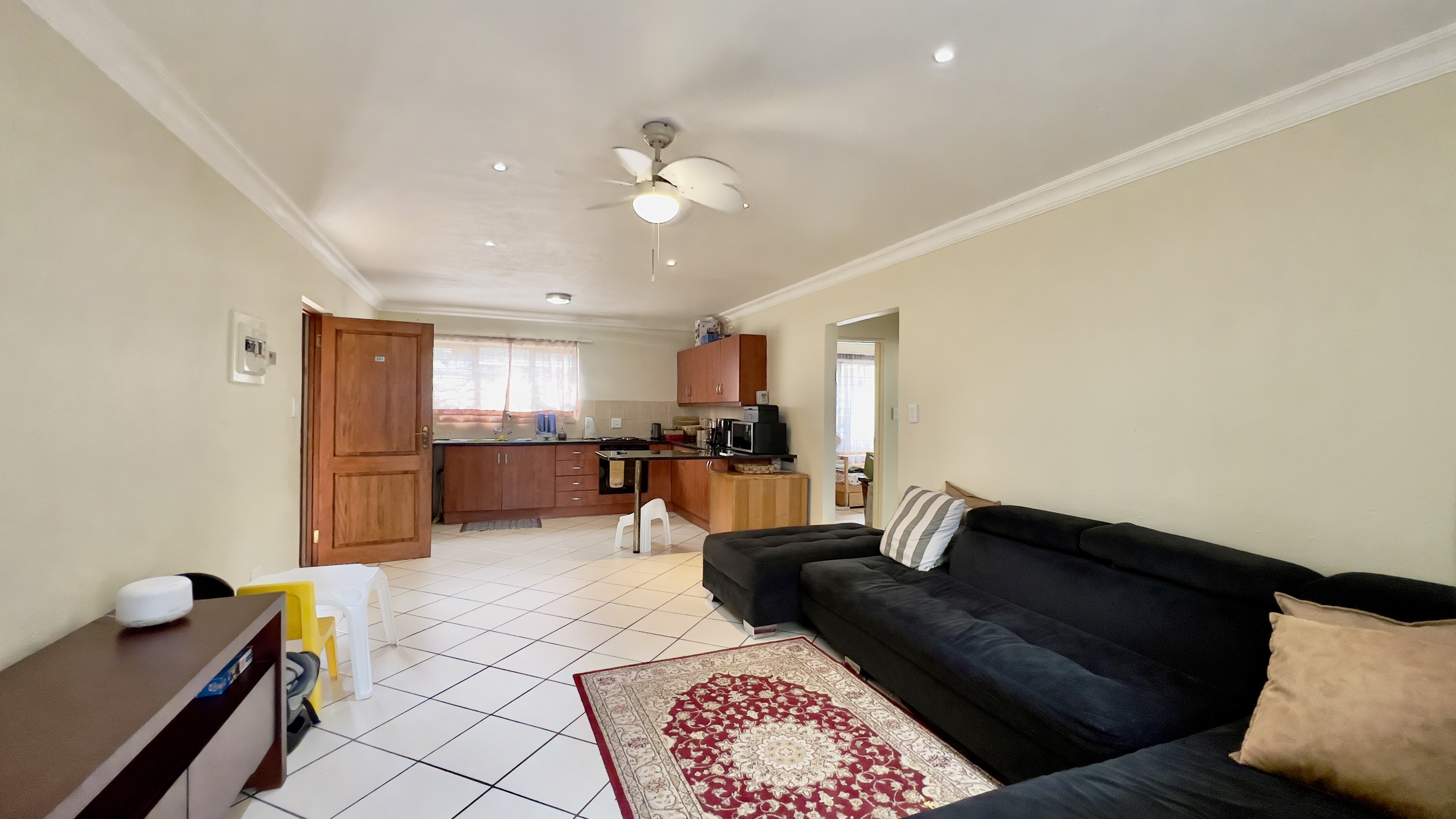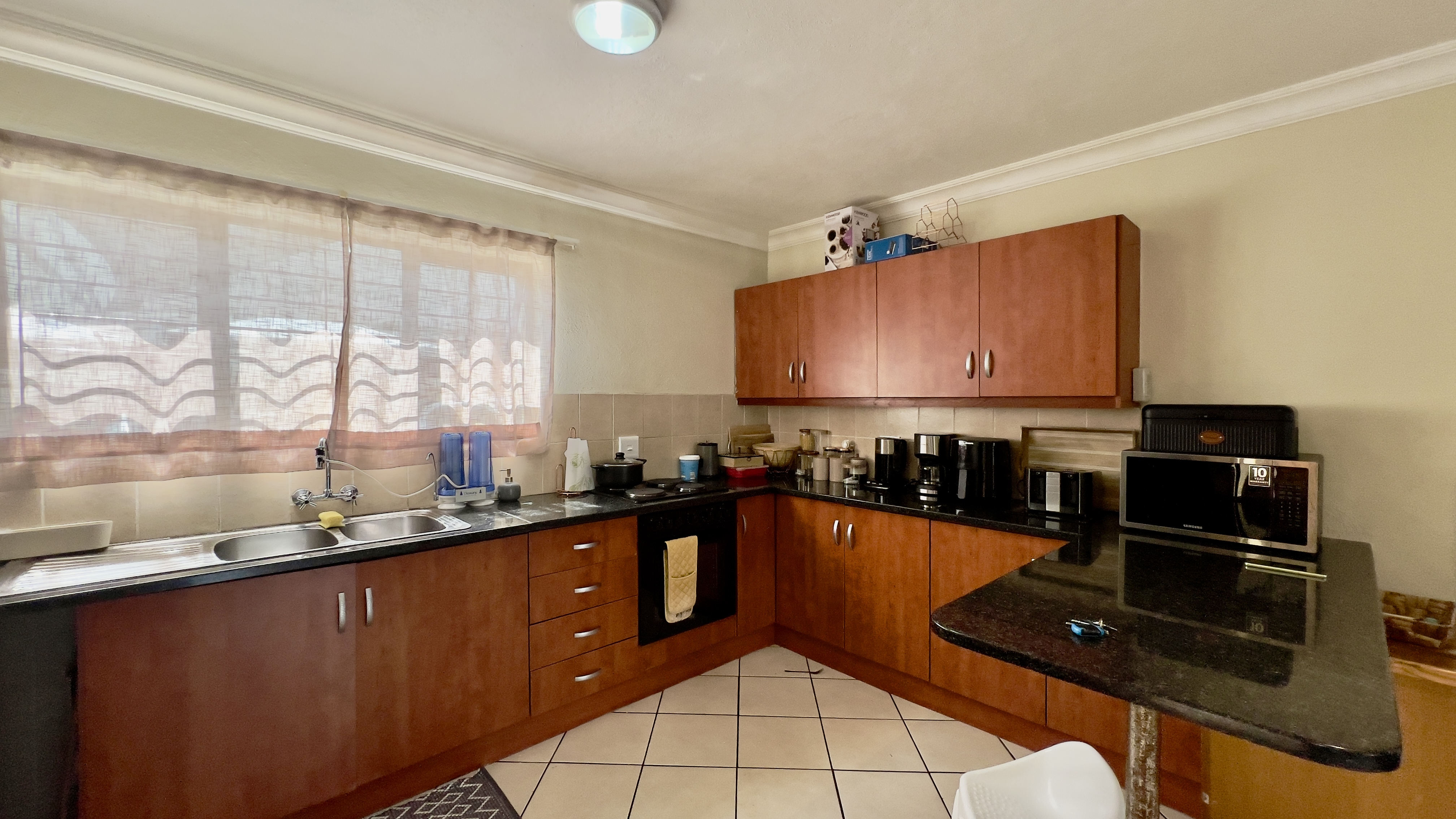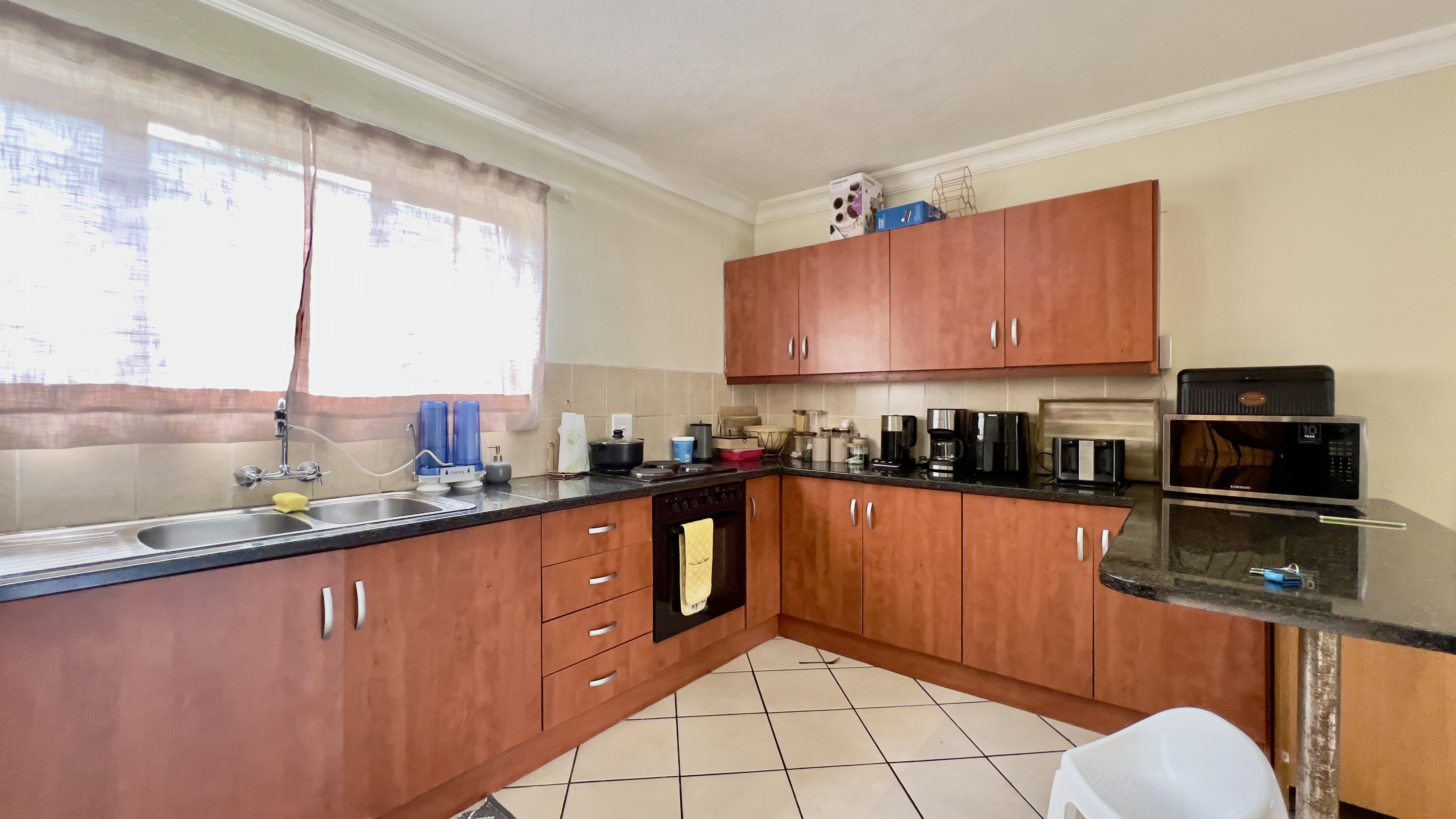 This well-maintained corner ground-floor apartment is a fantastic opportunity for first-time buyers or investors. The open-plan lounge and kitchen create a welcoming space, with sleek granite countertops, ample cupboard storage, and an electric stove, oven, and hob.