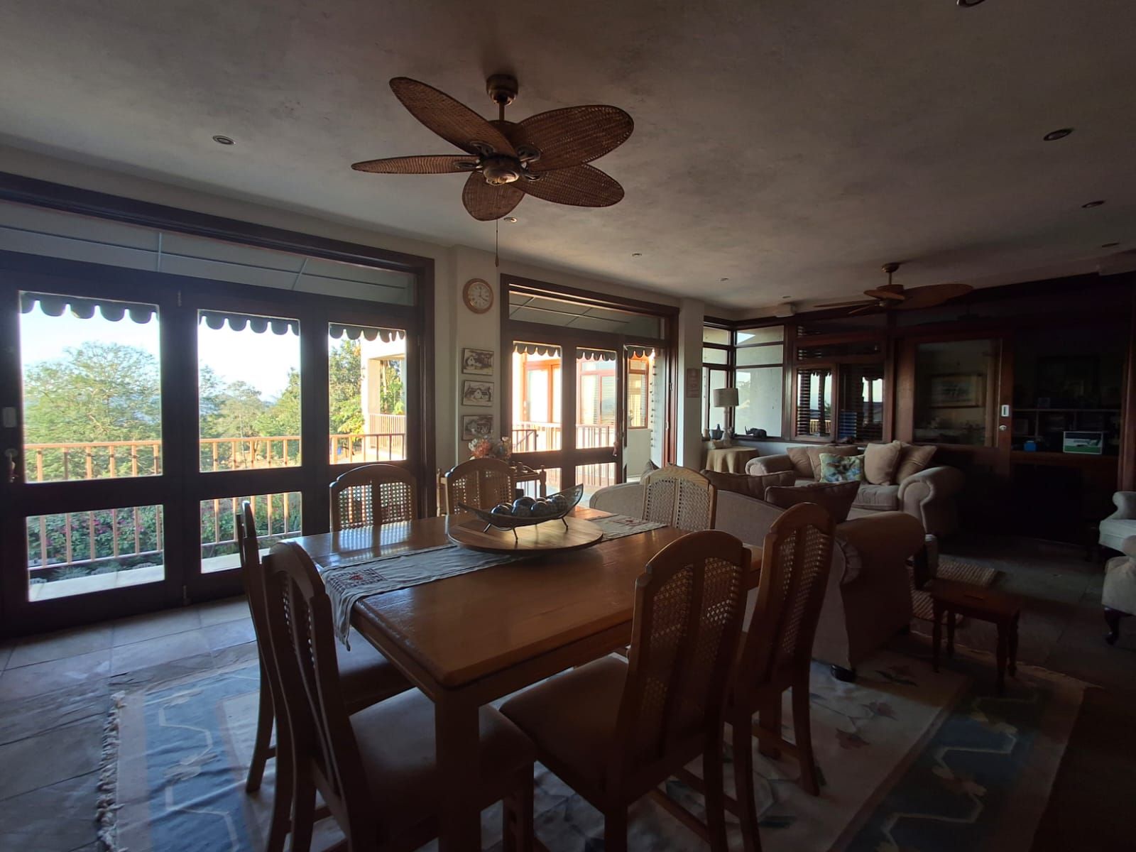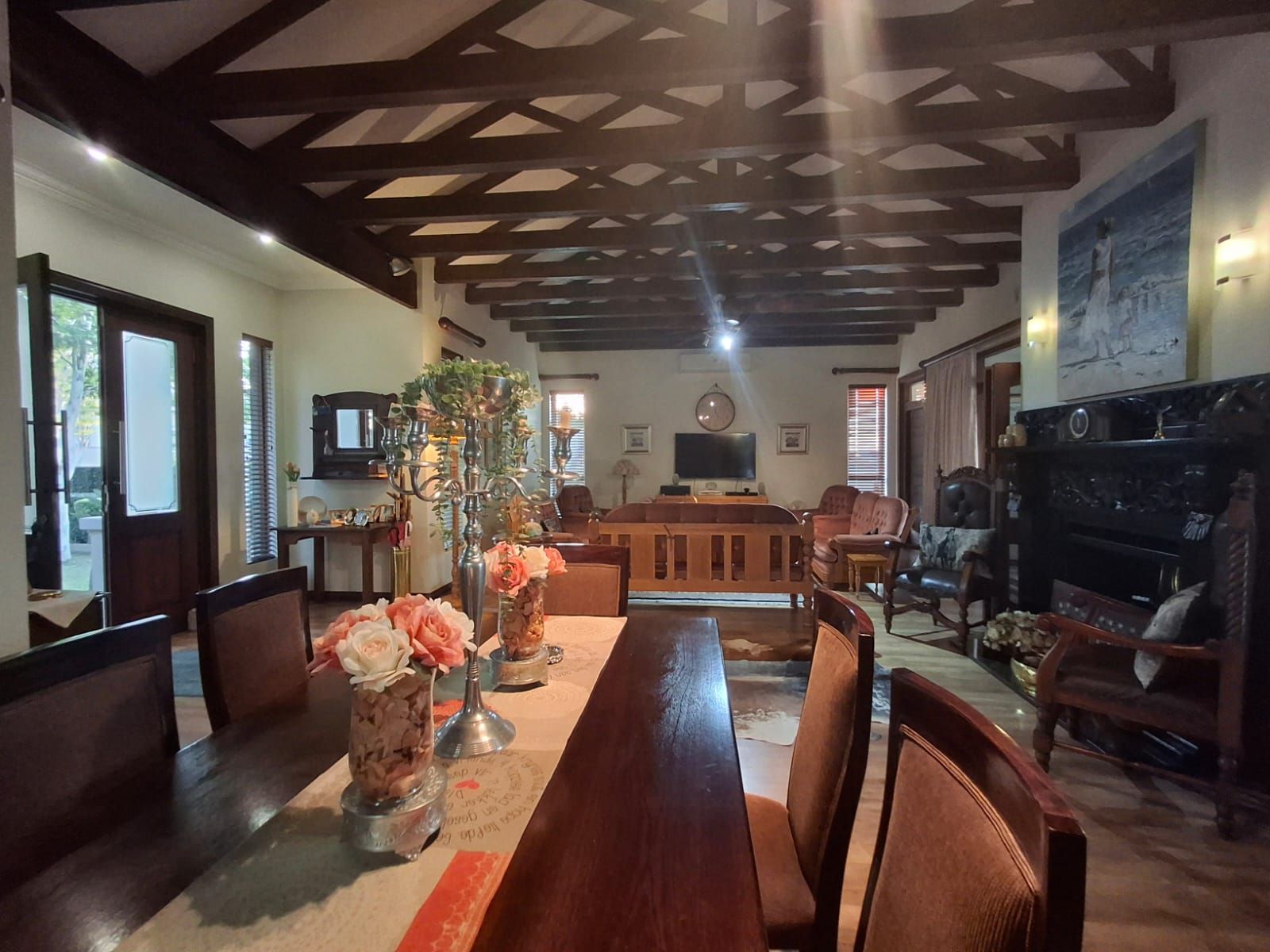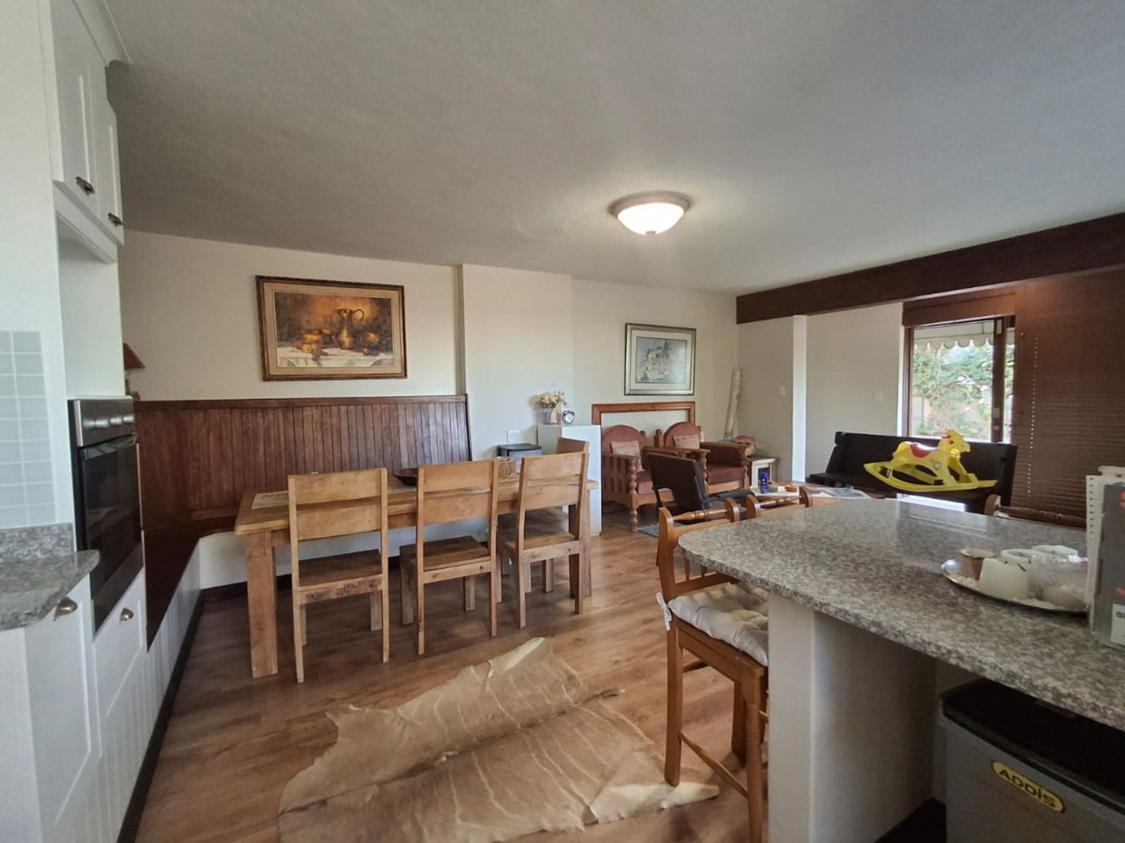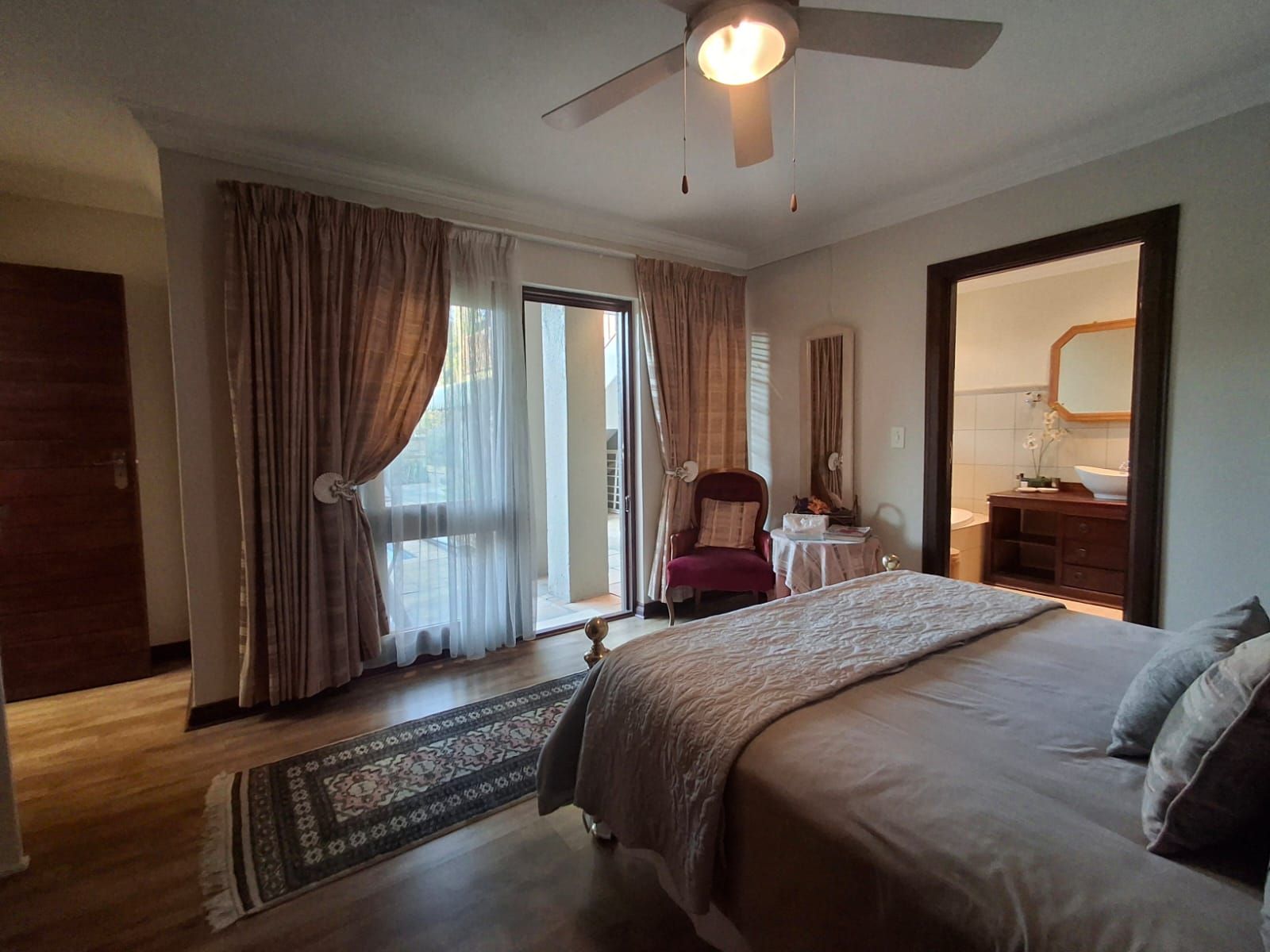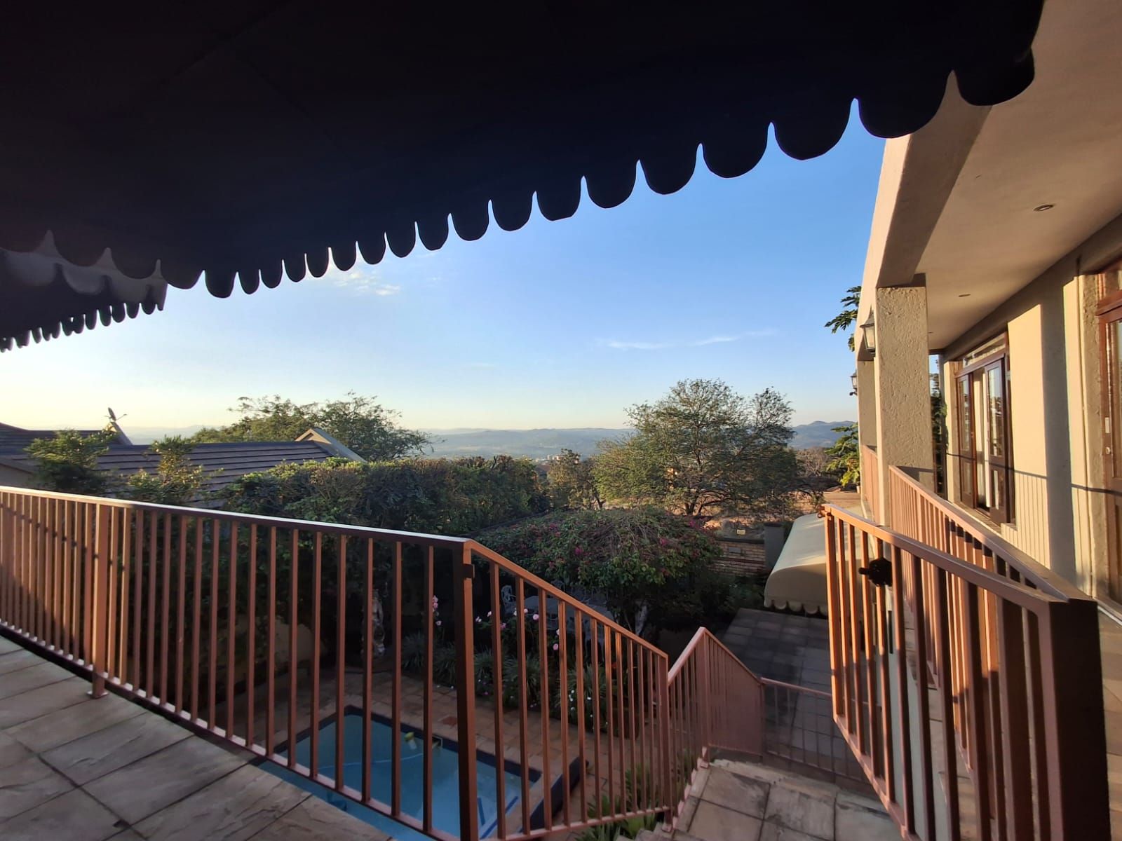 The main house is positioned above a full flat and a private guest suite, offering elevated views over the beautiful Nelspruit landscape. Each bedroom in the main house opens onto a balcony, creating a seamless connection with the outdoors and allowing for fresh air and natural light throughout. Inside, rich dark wood finishes and wood-laminated flooring add warmth and sophistication. The open-plan kitchen and dining area is both practical and stylish, complete with a pantry and scullery for extra convenience. A fireplace in the living room is strategically placed to warm the entire space during cooler months.