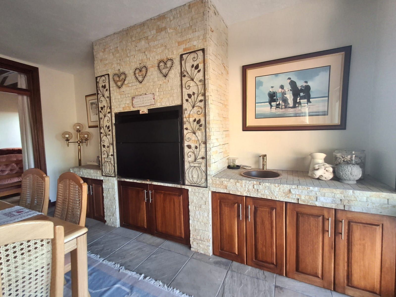 At the heart of the home is a spacious indoor entertainment area, perfect for hosting guests year-round. This space includes a built-in braai and large wooden stacking doors that open to the outside, allowing natural air to flow through while still being sheltered and part of the main home’s layout.