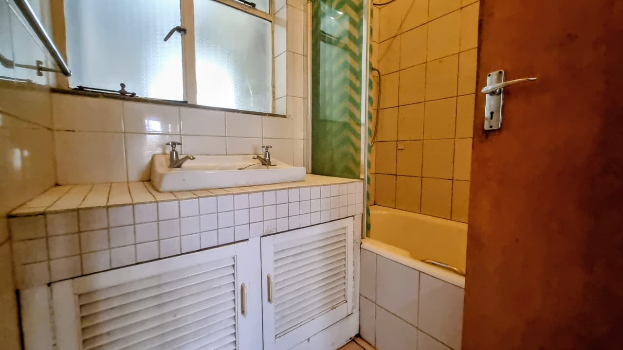 Tiled floors, bath/shower combo, basin with a gas geyser.