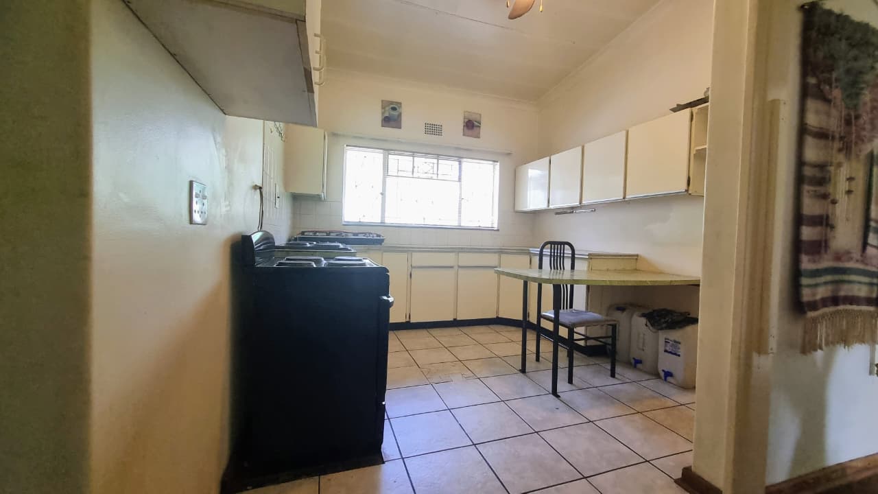 Tiled floors, built-in cupboards, freestanding stove and oven, small breakfast nook.