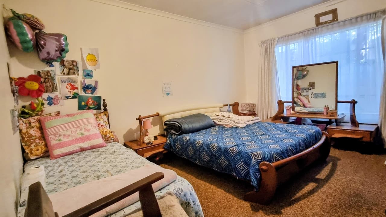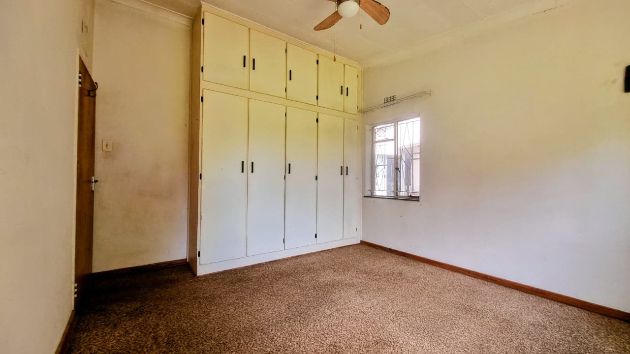 - Bedroom 2: Carpeted with a large window and built-in cupboards.