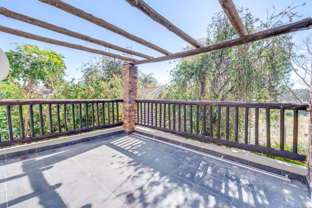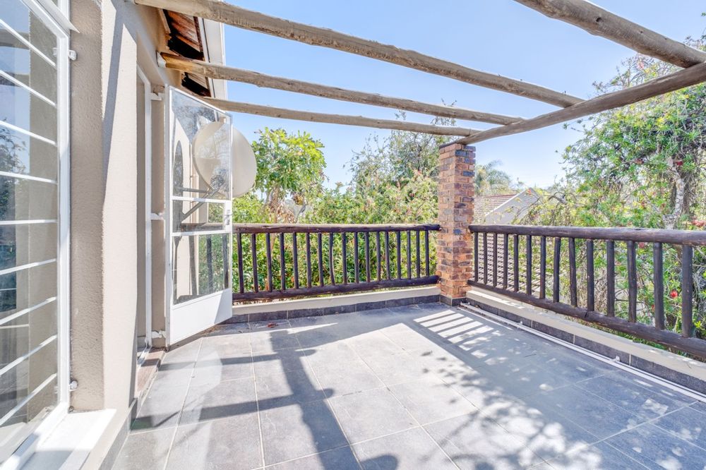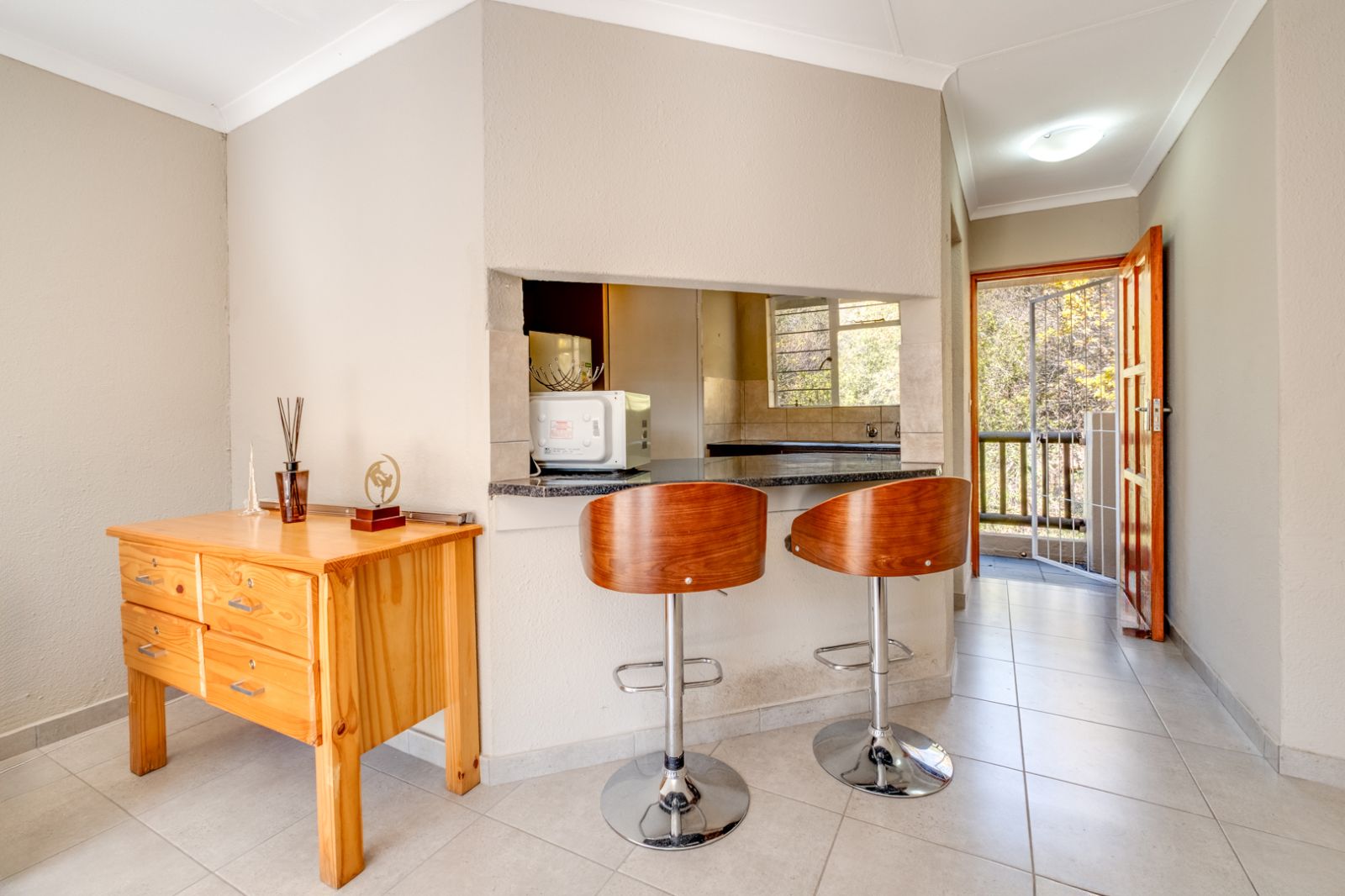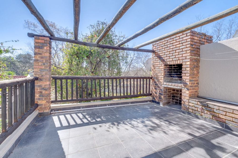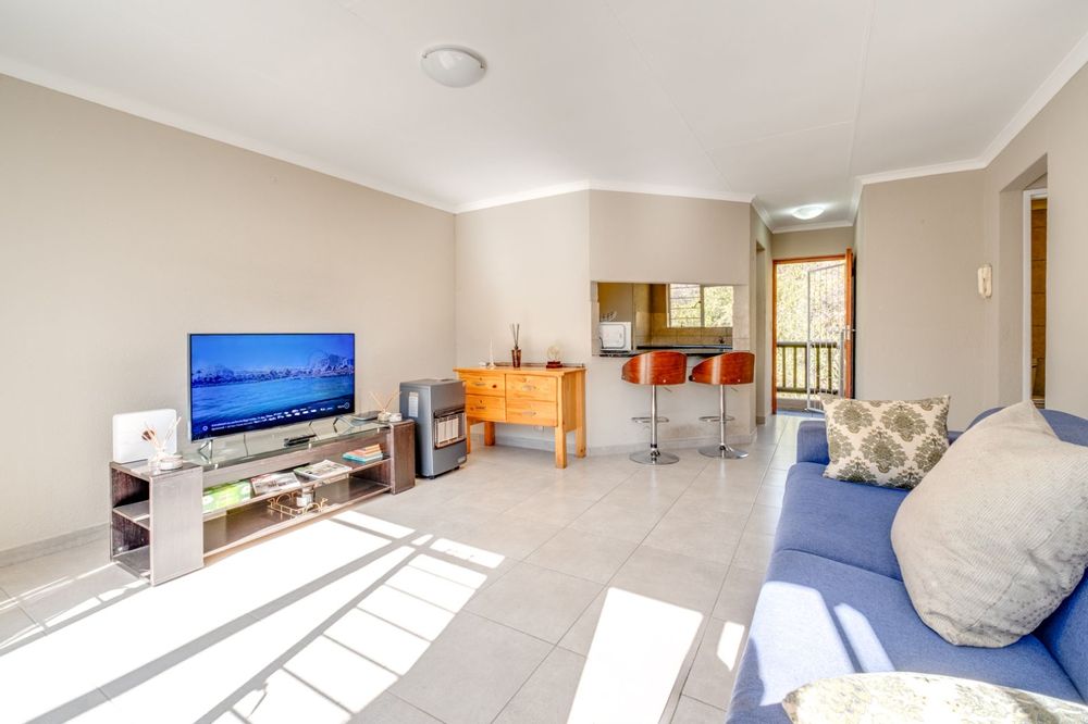 The apartment features an open-plan lounge with tiled flooring throughout, leading to a private balcony with built-in braai — perfect for outdoor relaxation. The kitchen includes a breakfast nook and space for a single-door fridge.