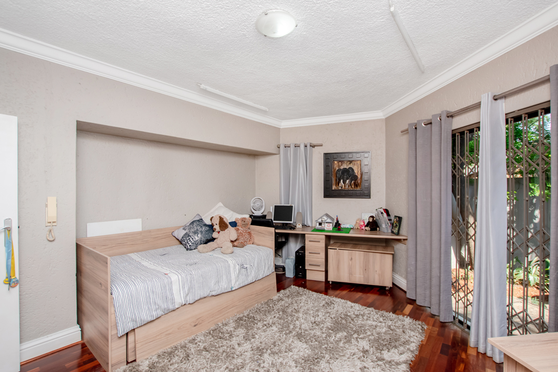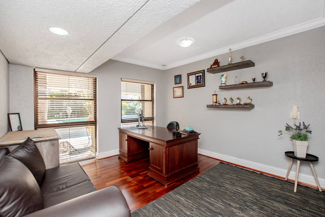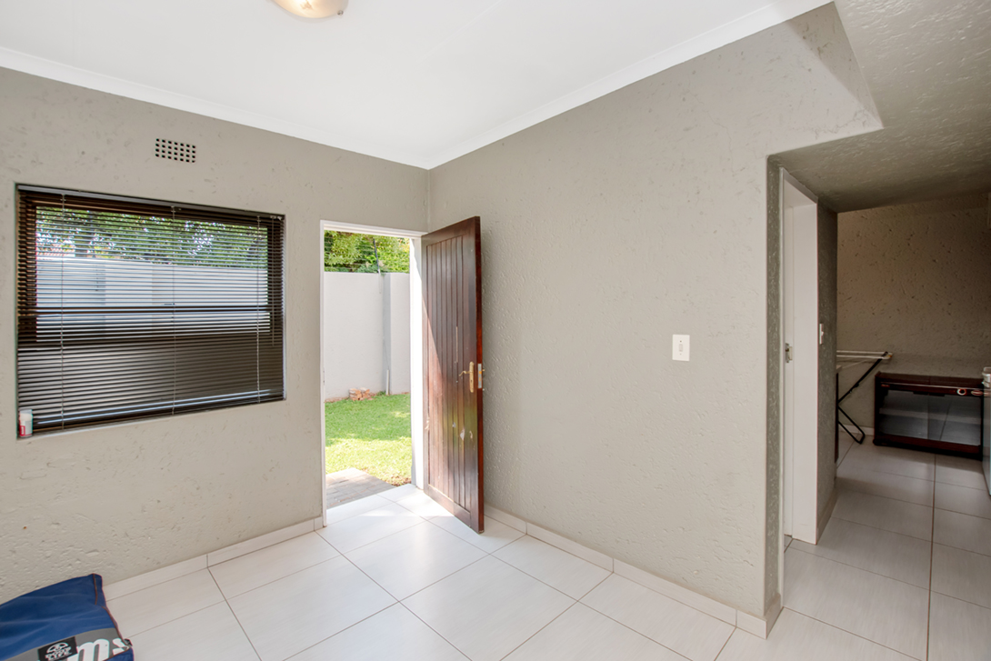 We have a bonus flatlet positioned on the side of the house, with its very own garage and private access, with a piece of yard for a pet. The flat has a fully equipped kitchen and bathroom with shower, with 1 bedroom. (This was used as office space before and can be again)