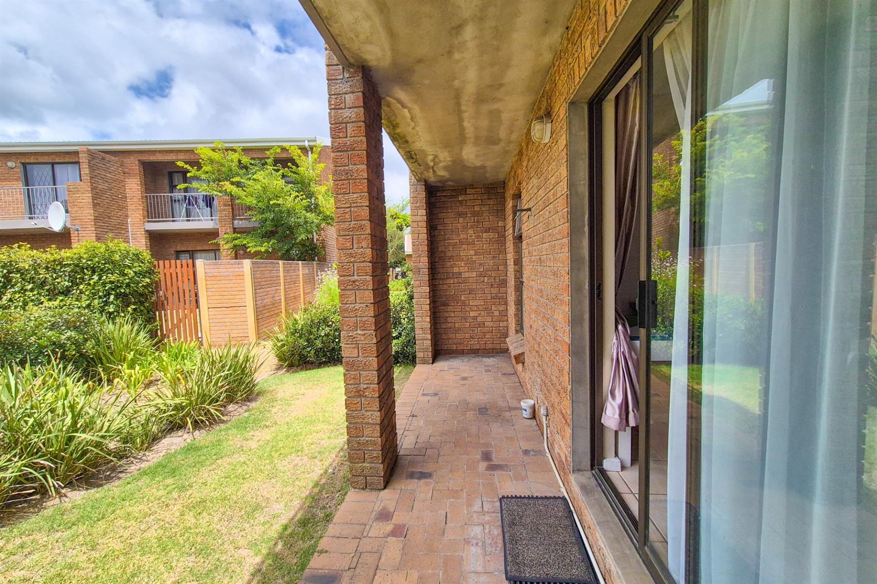 LIVING AREA: The open-plan tiled living area flows seamlessly onto a covered patio with access to a communal garden area - perfect for relaxing or enjoying outdoor space. Built-in cupboards in the living area provide additional storage.